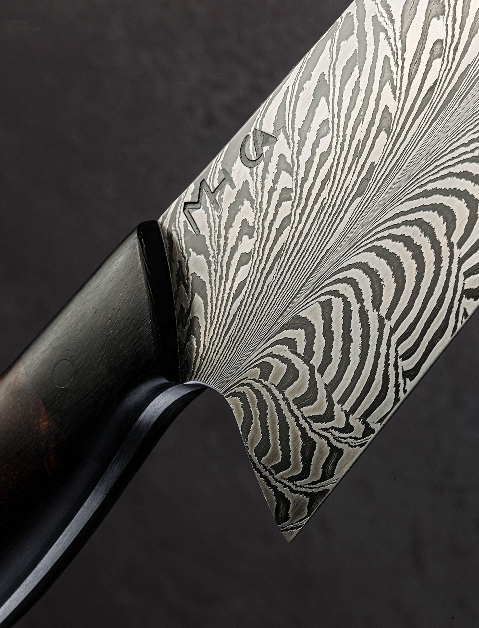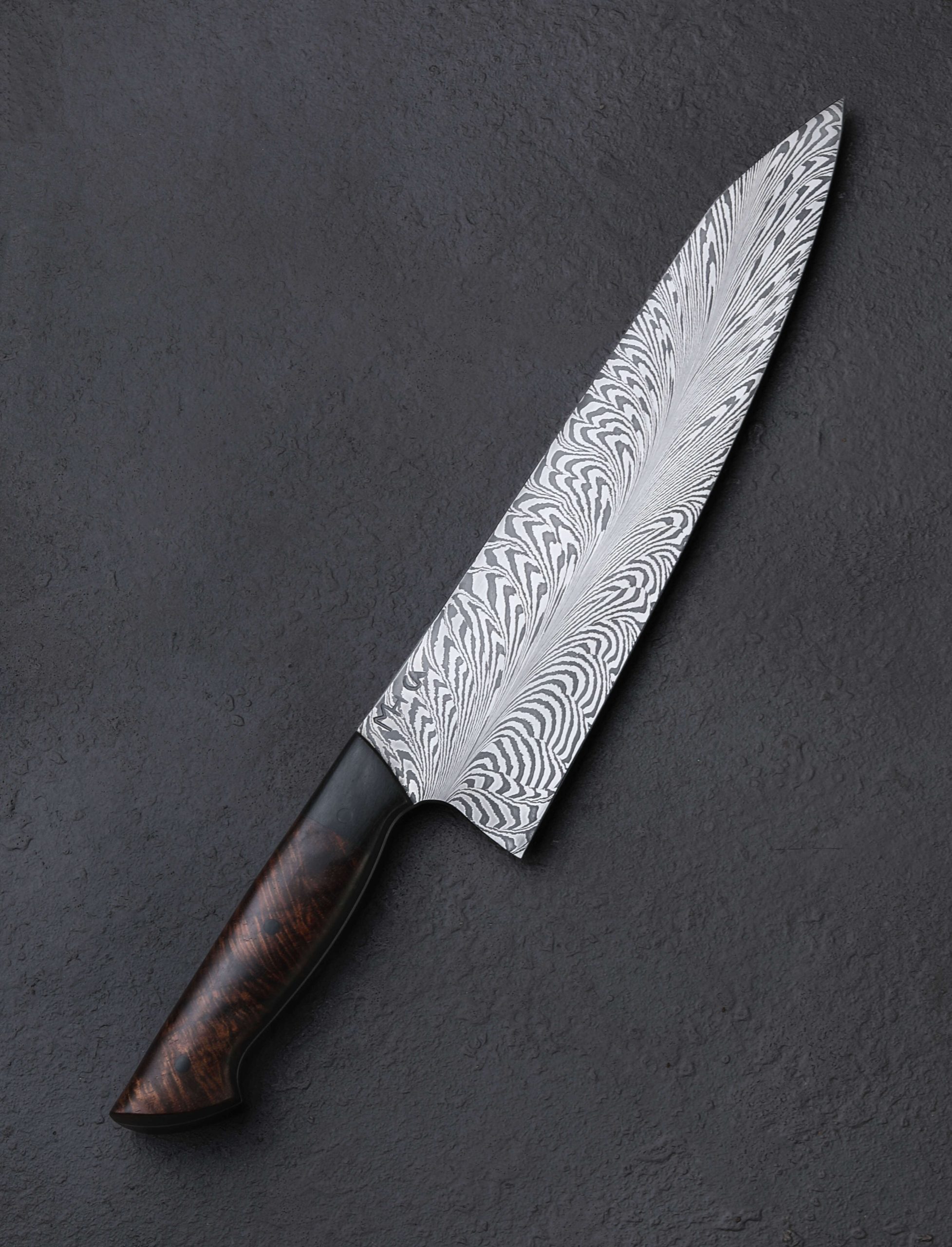 Austrian bladesmith Martin Huber begins by layering bars of 02 and 15n20 carbon steel alloys to form the initial damascus pattern. That pattern is then cut, stacked, and manipulated to create a tiled mosaic. The resulting piece of material is then ‘feathered’ by Martin to produce the bold, flowing effect seen coursing through the blade of this 230mm / 9.1″ chef knife. The magic, of course, does not end there. A prolific maker of full-size, one-of-a-kind heirloom chef’s knives, Martin imbues this blade with the same balance, versatility, and performance-based geometry we expect of his heirloom work. The blade’s tall bevels are subtly convex before slimming to quite a thin cross section at, and above, the fine, razor-sharp edge. Rounded and soft to the touch for comfort in the pinch grip, the blade’s spine tapers progressively, beginning at nearly 3.5mm out of the handle before halving to just 1.6mm at the midway point, and further to less than 1mm an inch from the glass thin, needle-like tip. Due to this careful shaping, the blade is a workhorse in the rear where the spine is stiff and the edge honed for chopping, while it enjoys a touch of lateral flexibility in the forward inches where it will excel at precise slices and detail work. Complementing the damascus steel’s handsome pattern is the striking, natural grain of curly Hawaiian koa wood surrounding a tapering, full blade tang. In front of the koa are bolsters of ancient bog oak to complete a handle sculpted into a comfortable Western form, all secured by three flush, black G10 pins.