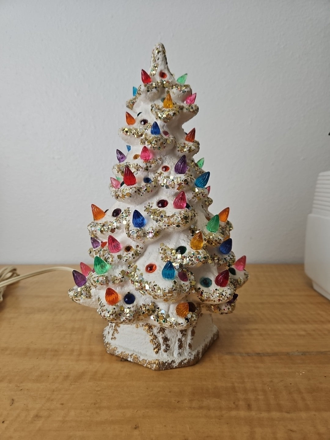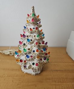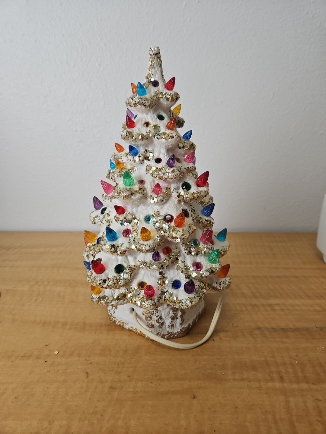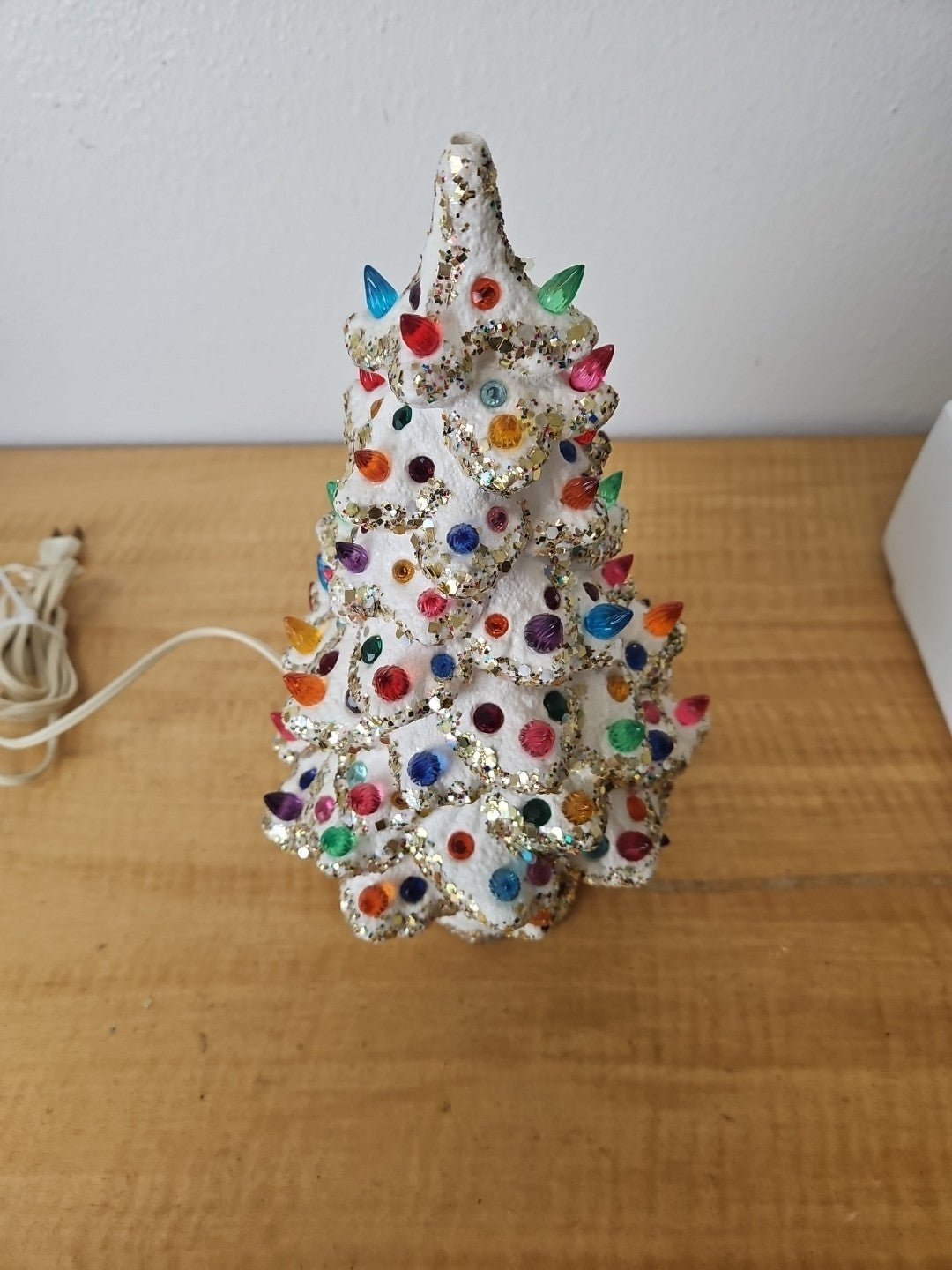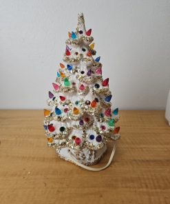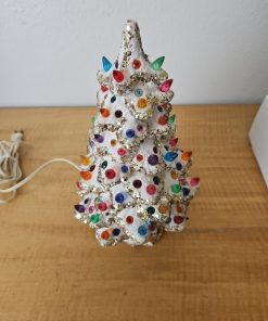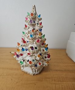1973 Ceramic White Christmas Tree 11” With Lights and Glitter by F Winters
