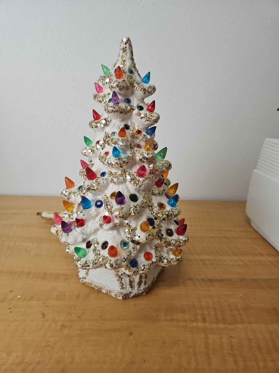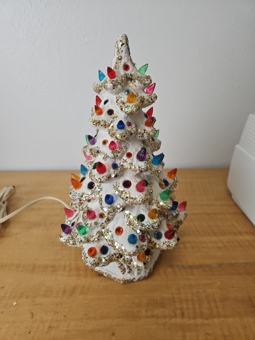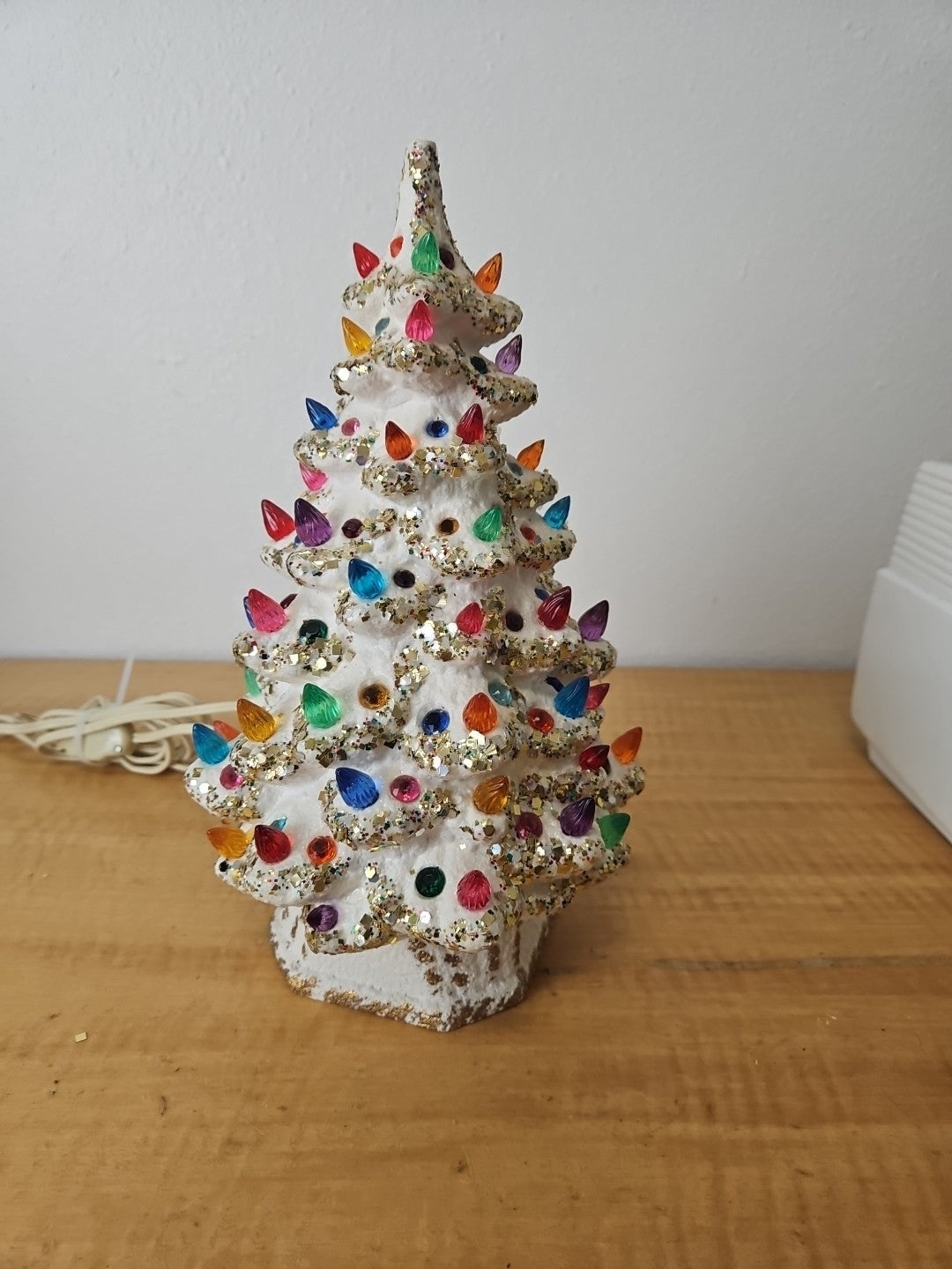 1973 Ceramic White Christmas Tree 11” With Lights and Glitter by F Winters