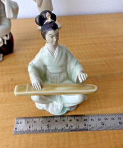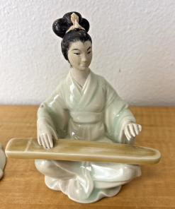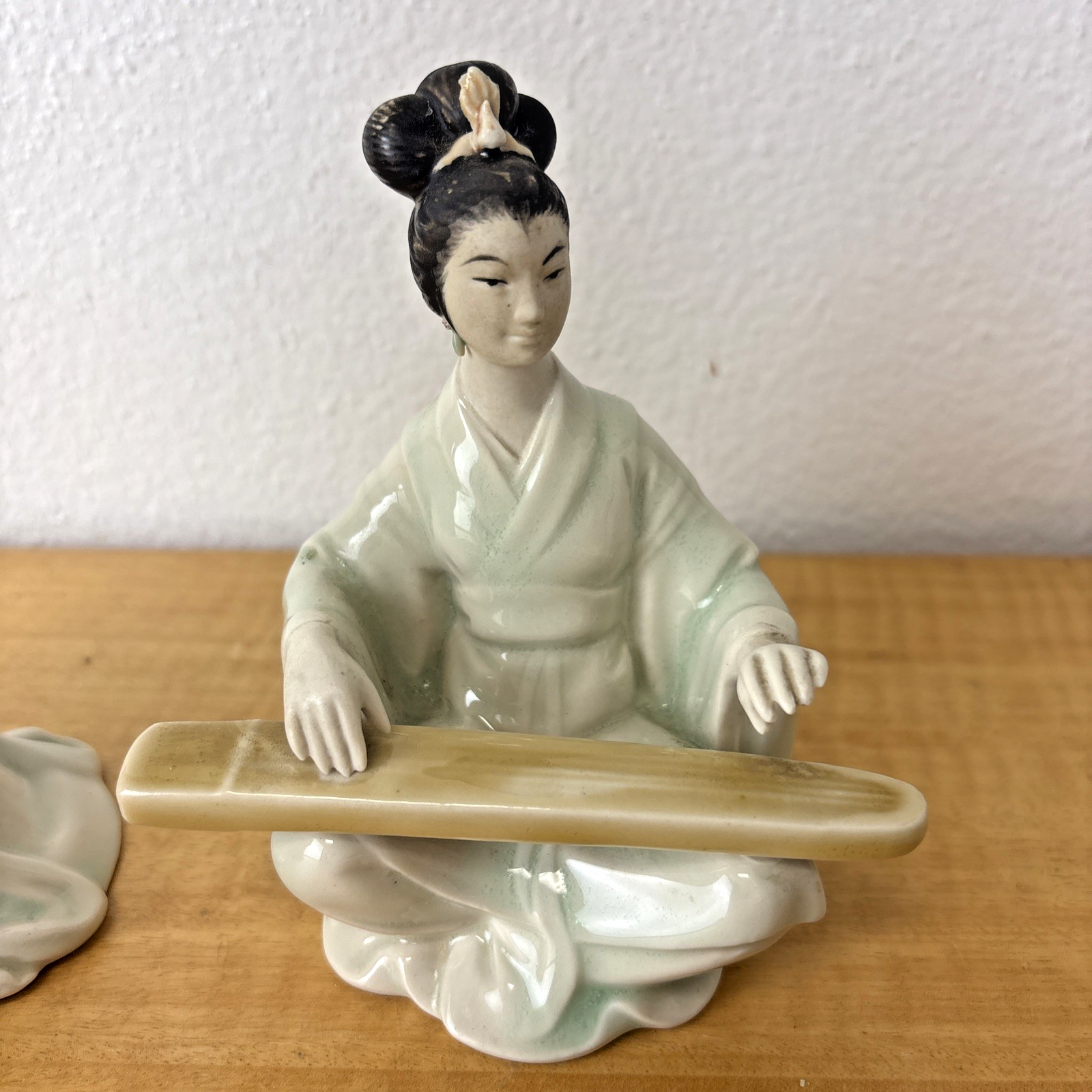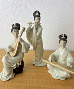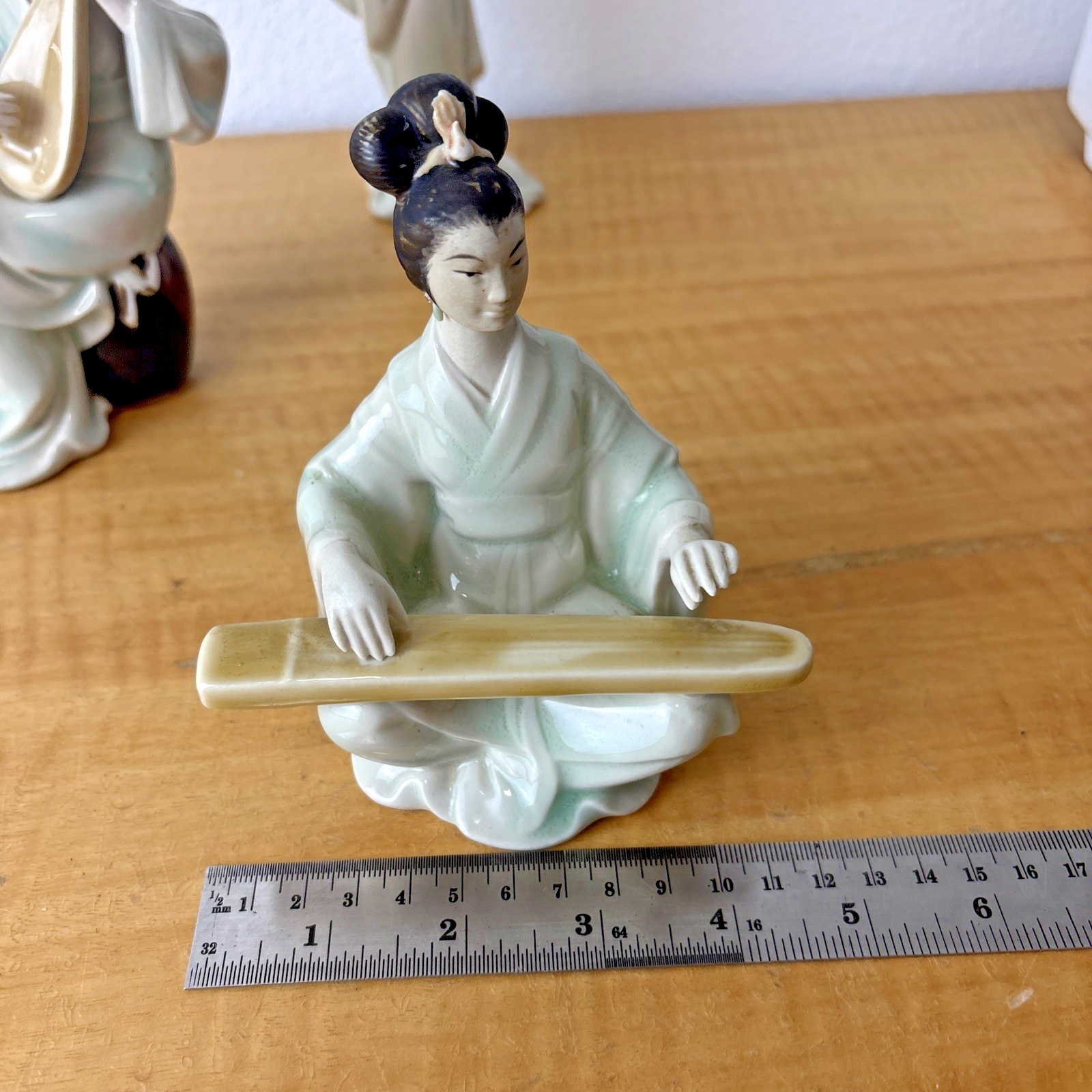 3 Chinese Celadon Porcelain Figurines Women Flute Pluck Pipa Qin Zither Vintage