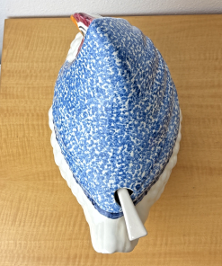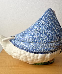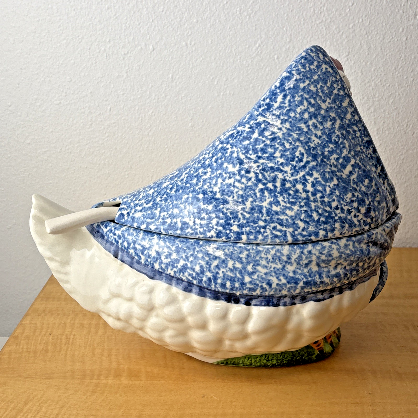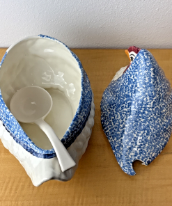 3 PC NS Gustin Calif Pottery Soup Tureen W/ Ladle Blue Spongeware Hen Chicken