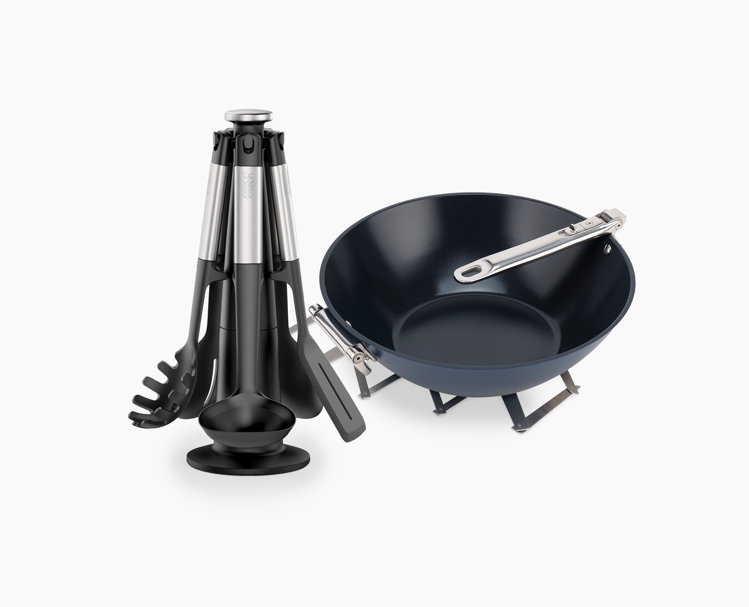 - Weighted steel handles and integrated tool rests prevent utensil heads from touching the work surface when placed down