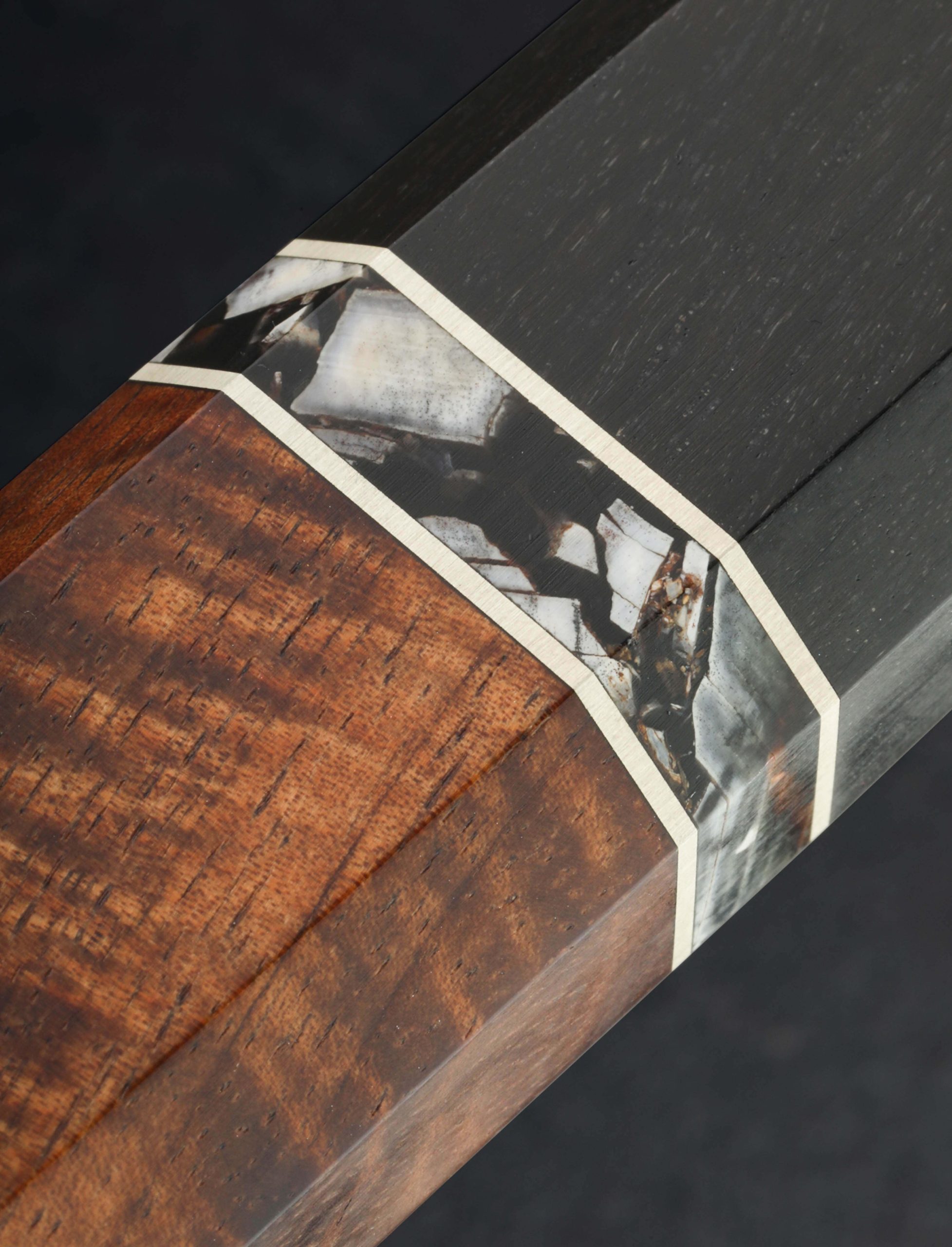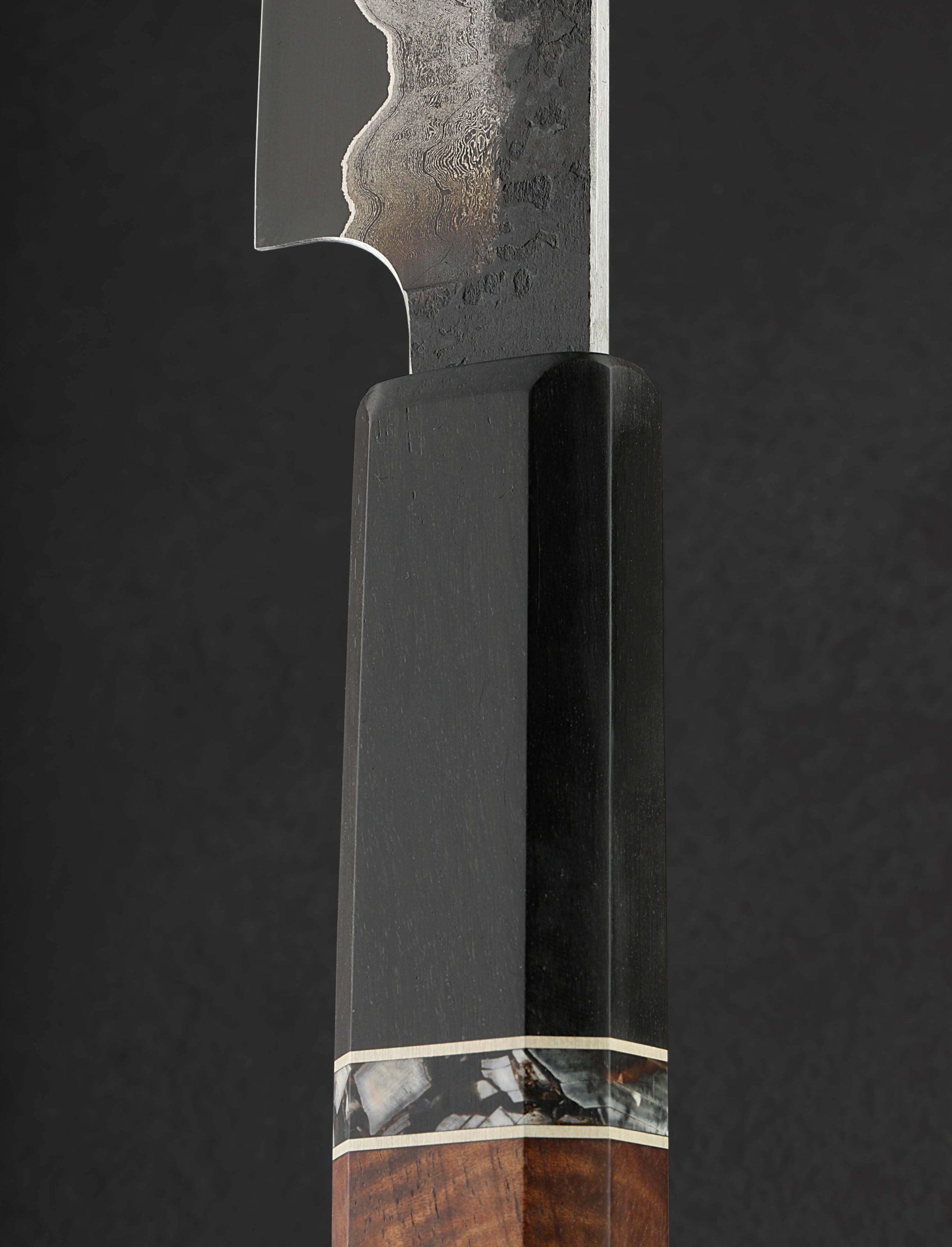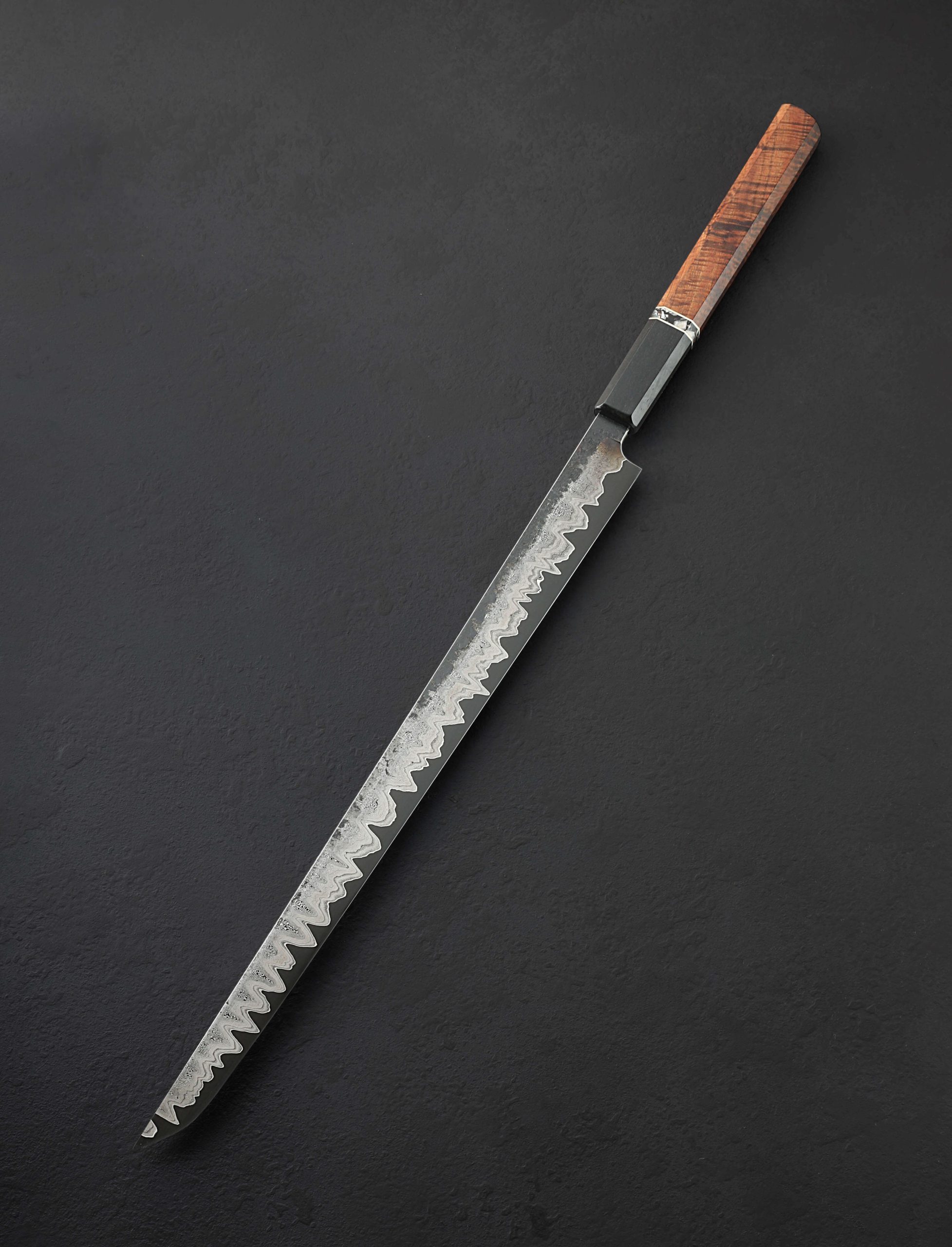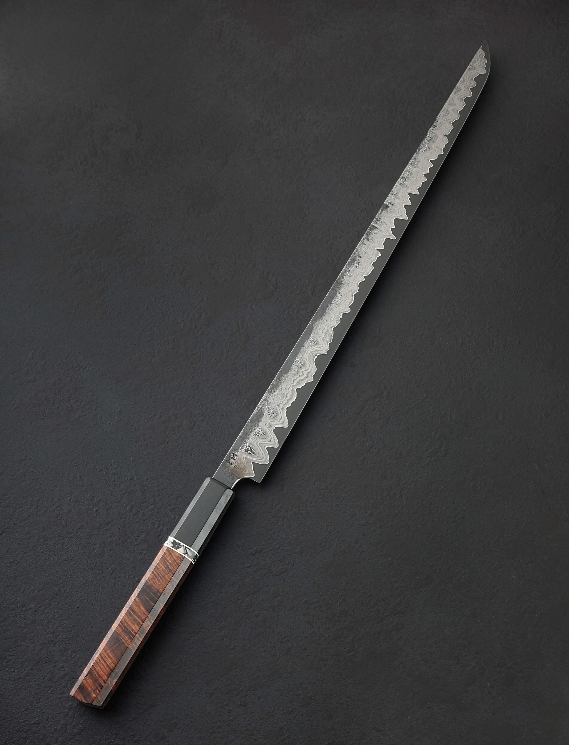 For 460mm, over 18 inches, 312 layers of dense, flowing, house-made carbon damascus, a vein of pure nickel, and an edge of 1.2419 carbon steel stretches outward from the chef’s hand, crafted to slice without inhibition. This stunning object is the functional art of Austrian bladesmith and designer Martin Huber, representing his talents and metalworking prowess beautifully. With symmetrical geometry, forge-finished flats showing the blade’s hand-forged origins give way to tall, superbly shaped bevels that slim downward to a thin, wonderfully honed edge ready for every cut. The length, expert freehand grinding, and a carefully controlled heat treatment and hardening process combine to produce a larger-than-life blade with rewarding lateral flexibility that leaves the edge straight as an arrow for every slice, and damascus that undulates up and down over the darkly etched core with top-notch precision. For comfort and control aided at the cutting board by the knife’s overall weight and balance is a handle in octagonal, wa form sculpted from curly koa and bog oak with decorative rings of German Silver, and fossilized mammoth tooth. A presentation culinary piece designed to admire, and built to use.