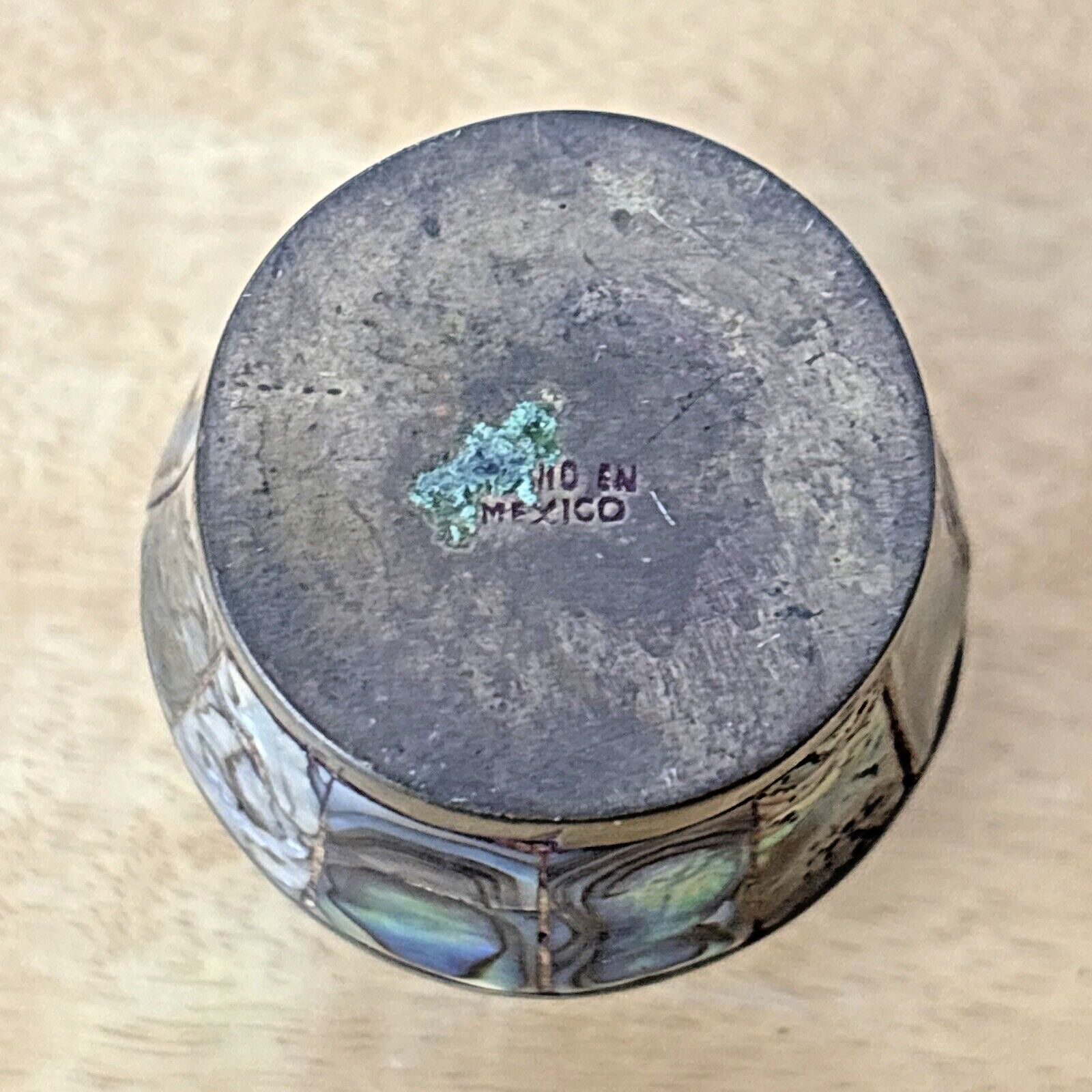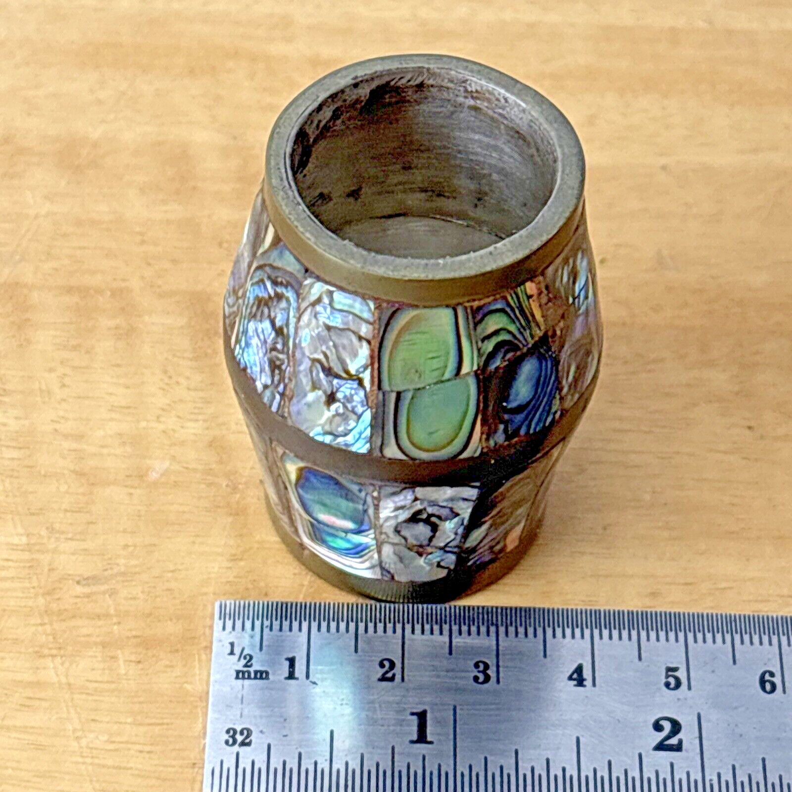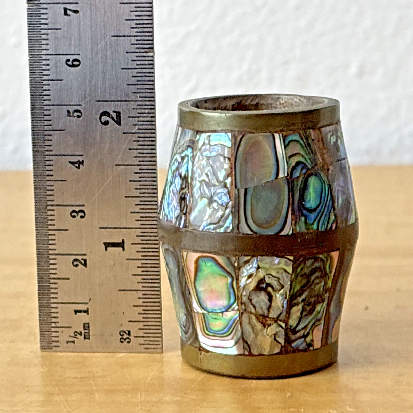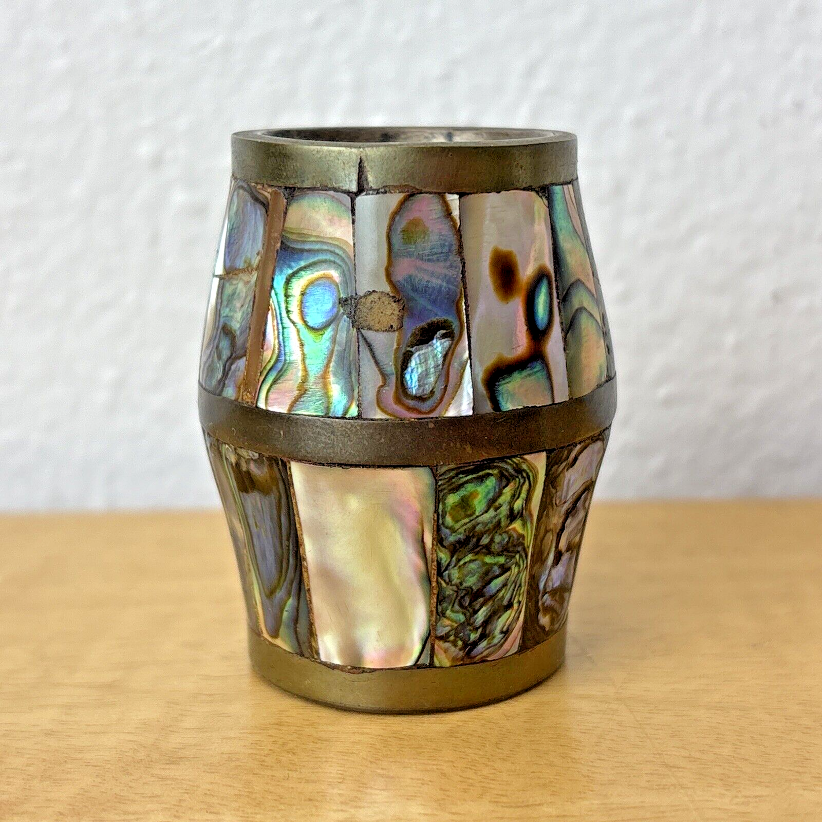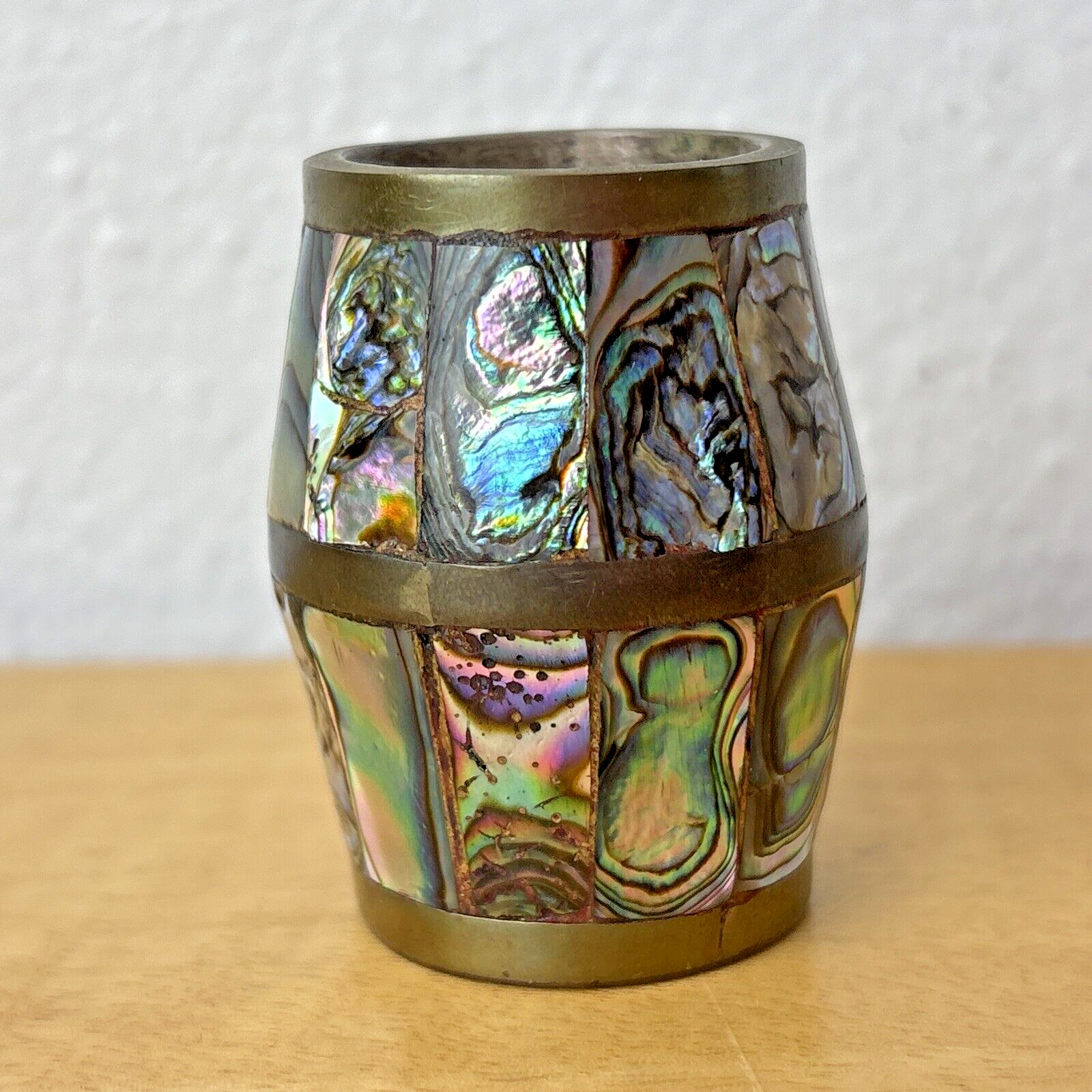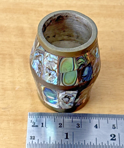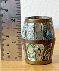 Abalone & Brass Shot Glass Barrel Shaped Made in Mexico