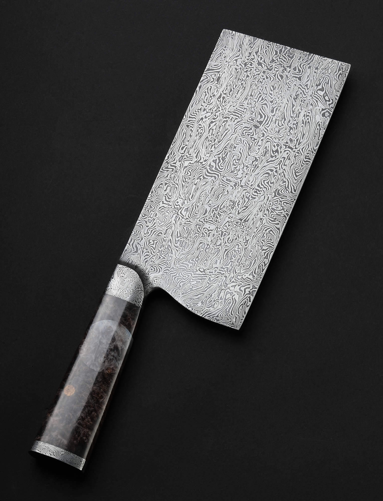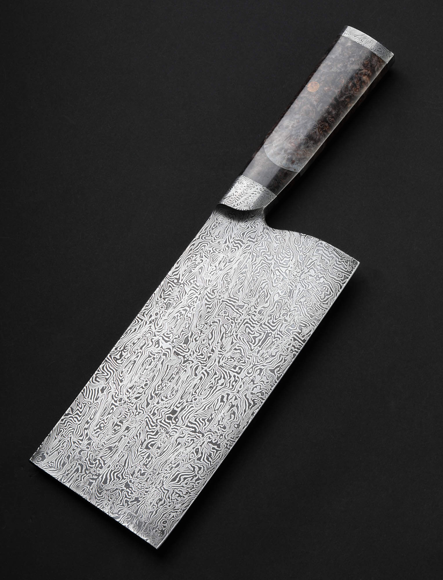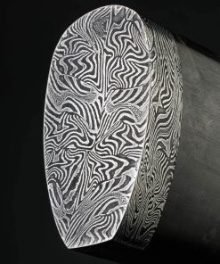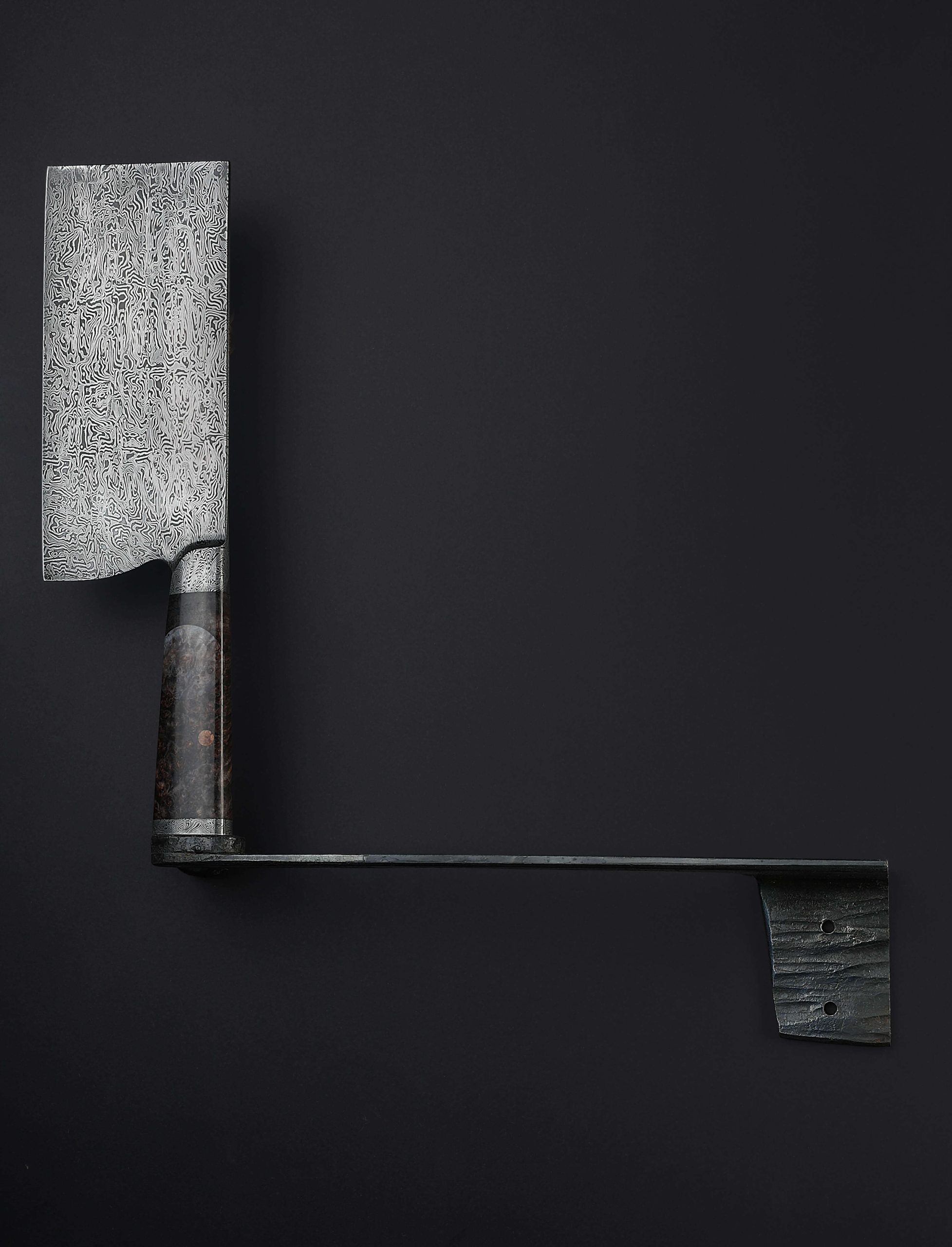 Vermont artist Nick Anger’s contribution to The Art of Cutlery, a cleaver named “Almost There,” on show during summer 2024 in Tribeca, NYC, challenges the more traditional approaches to pattern tiling in mosaic damascus design. Hand-forged with integral bolster construction, the 220mm long by 100mm tall blade of carbon damascus steel features an organic and playful aesthetic in which many tiles combine to form a singular visual effect. The handle, sculpted from three intentionally combined cuts of the same piece of stabilized maple wood, features a butt cap of the same damascus pattern as that of the blade. Almost There is presented on a unique, magnetic, wall-mounted stand designed and created by the artist. This knife is razor-sharp and built to cook with.