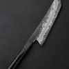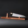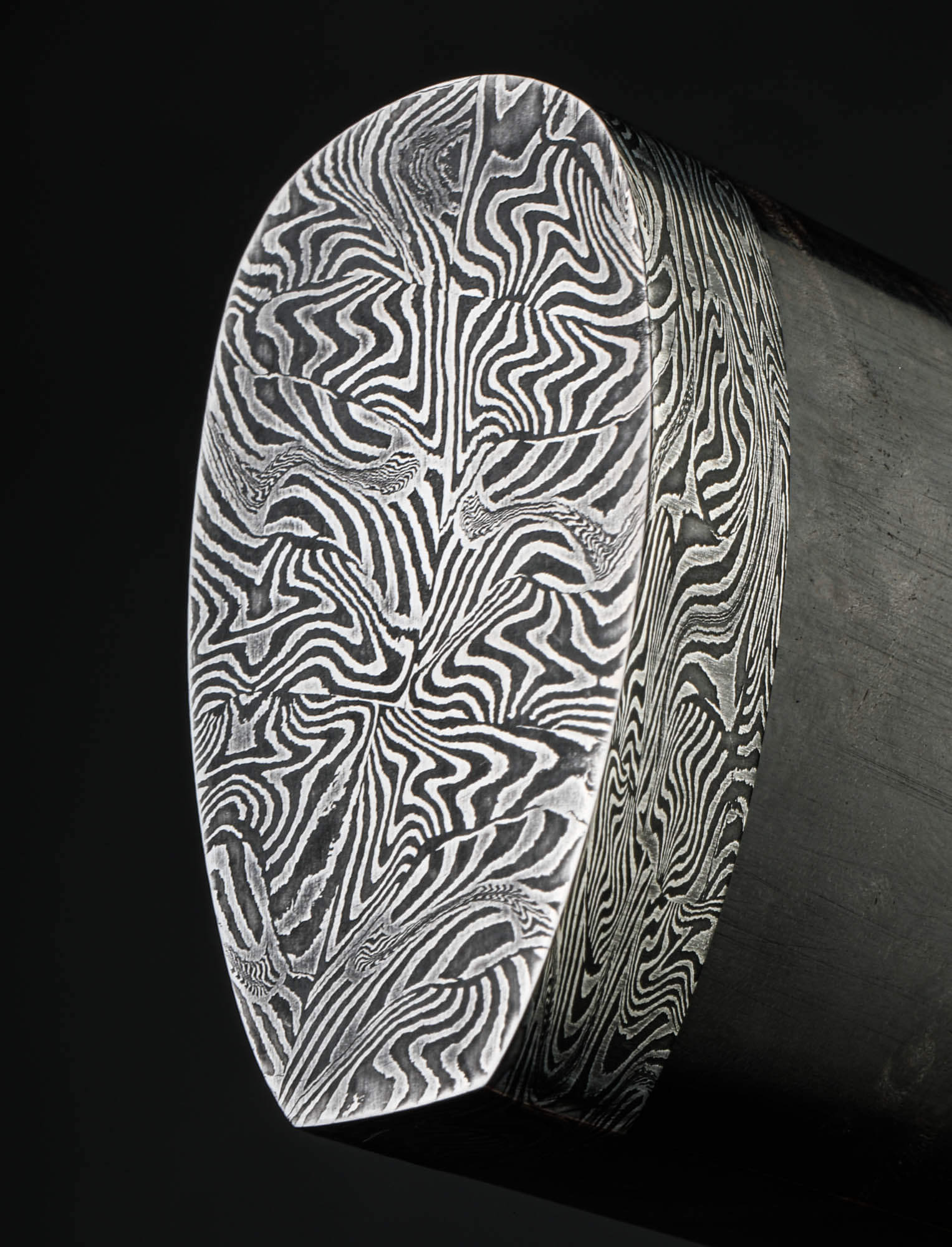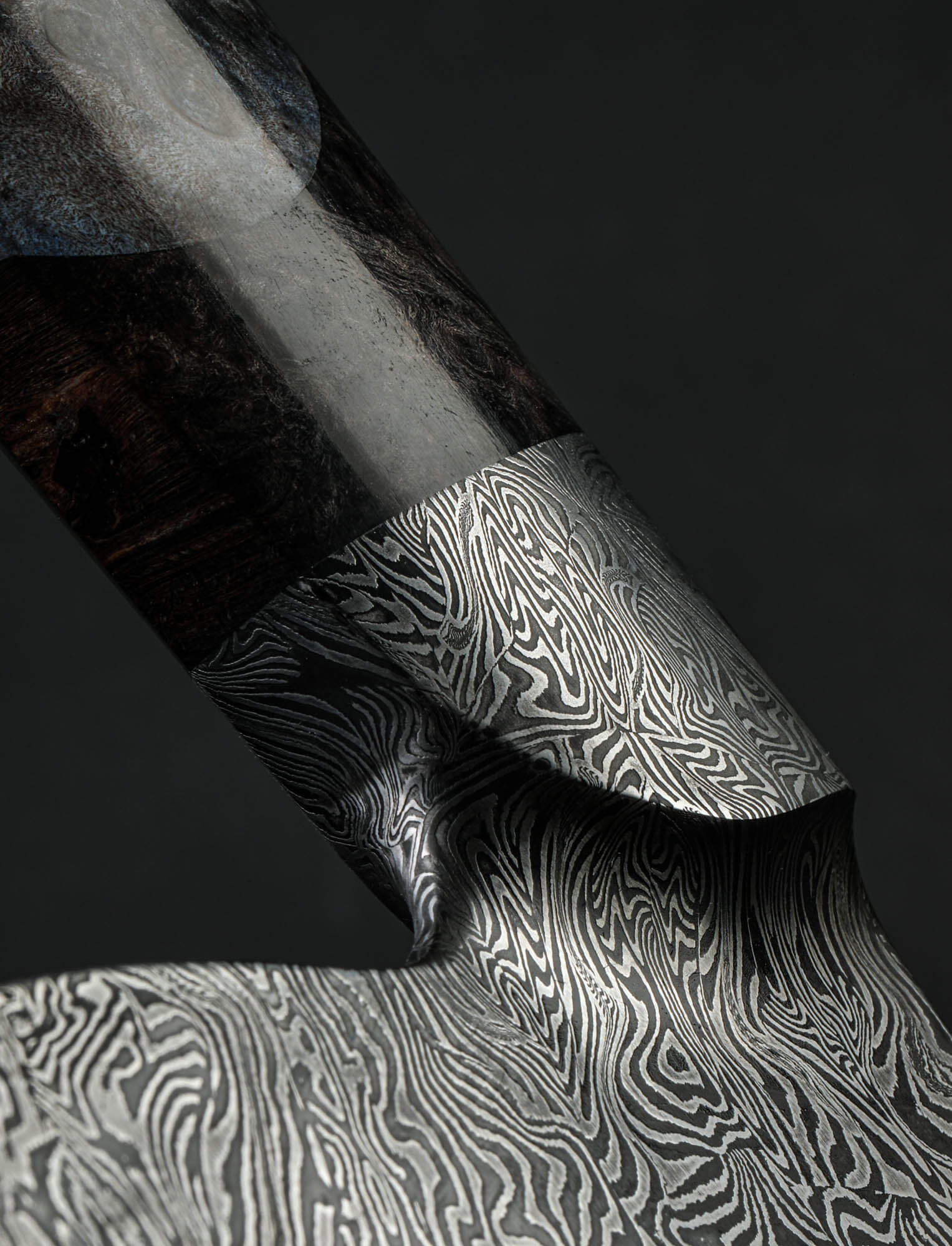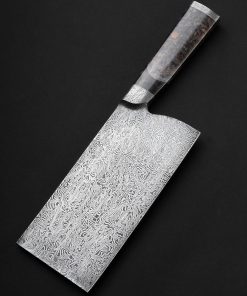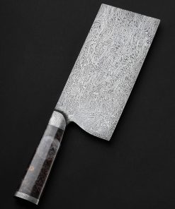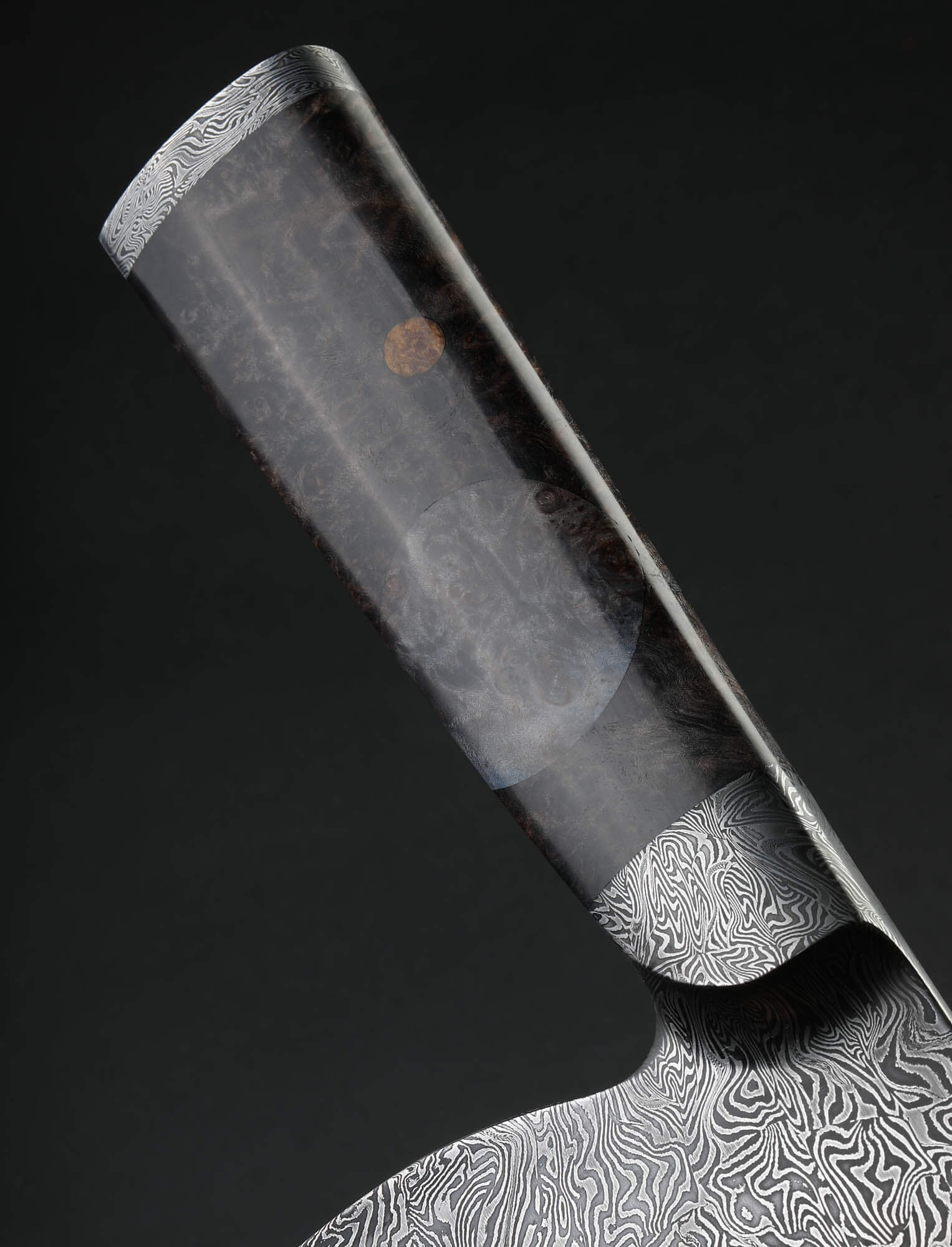 Vermont artist Nick Anger’s contribution to The Art of Cutlery, a cleaver named “Almost There,” on show during summer 2024 in Tribeca, NYC, challenges the more traditional approaches to pattern tiling in mosaic damascus design. Hand-forged with integral bolster construction, the 220mm long by 100mm tall blade of carbon damascus steel features an organic and playful aesthetic in which many tiles combine to form a singular visual effect. The handle, sculpted from three intentionally combined cuts of the same piece of stabilized maple wood, features a butt cap of the same damascus pattern as that of the blade. Almost There is presented on a unique, magnetic, wall-mounted stand designed and created by the artist. This knife is razor-sharp and built to cook with.