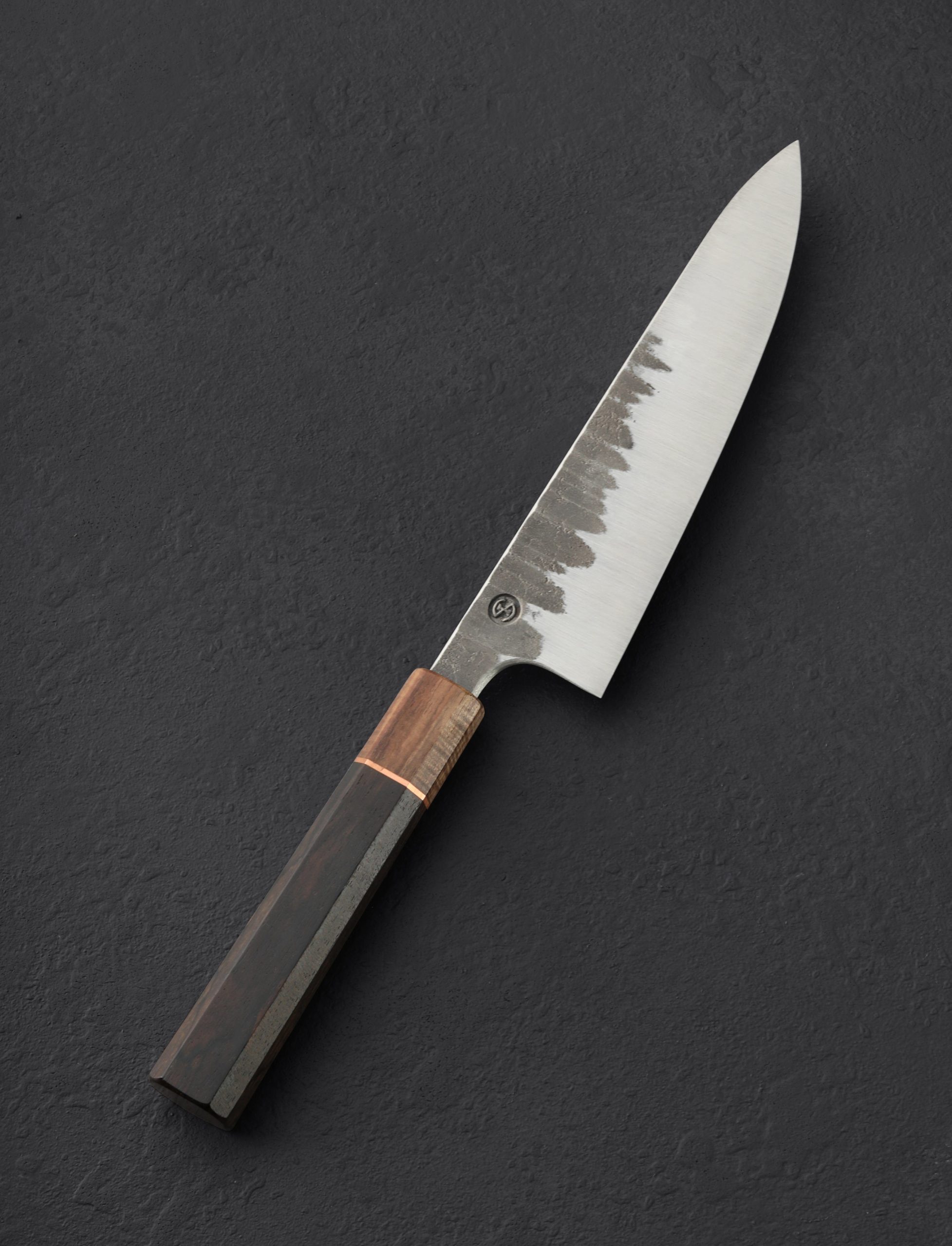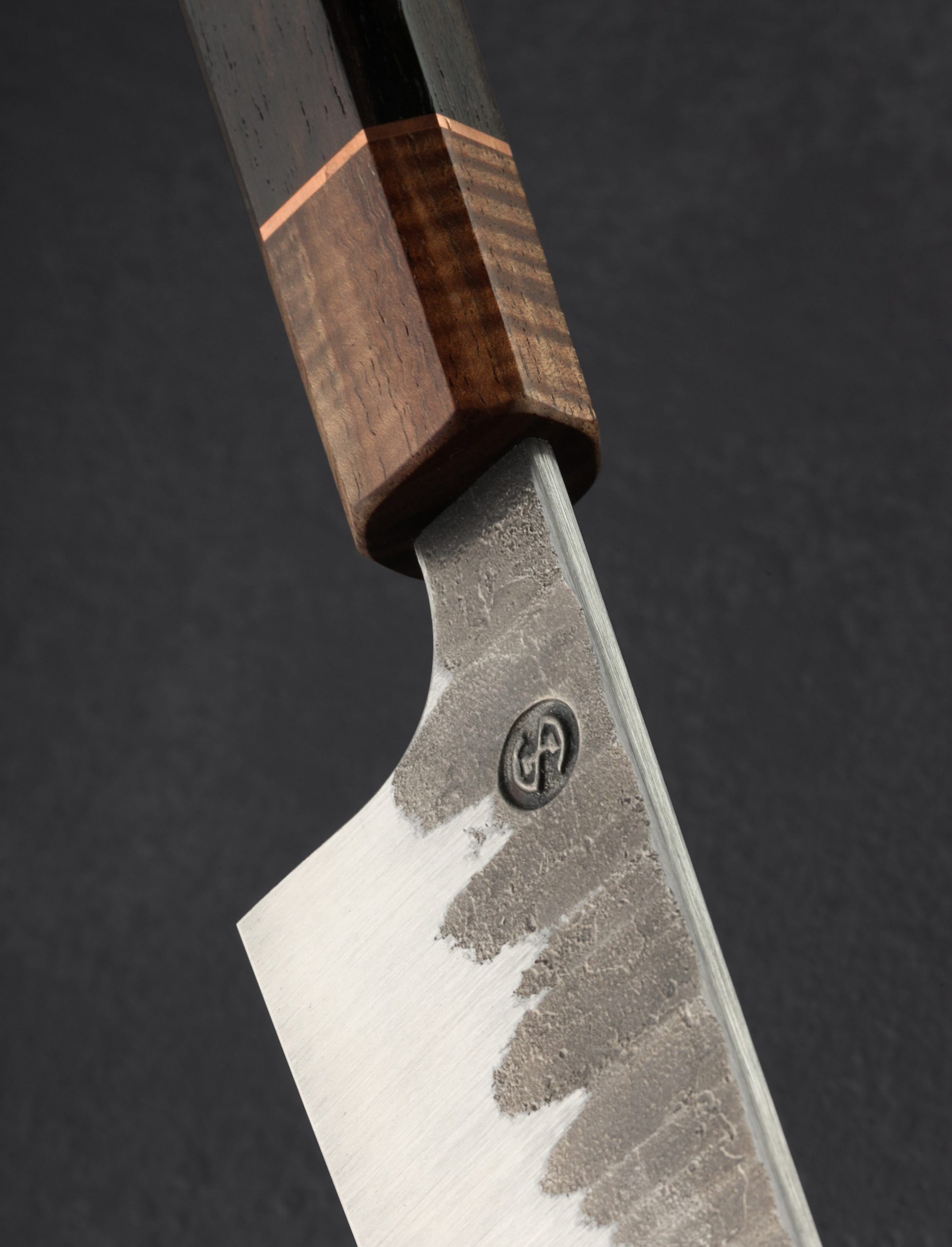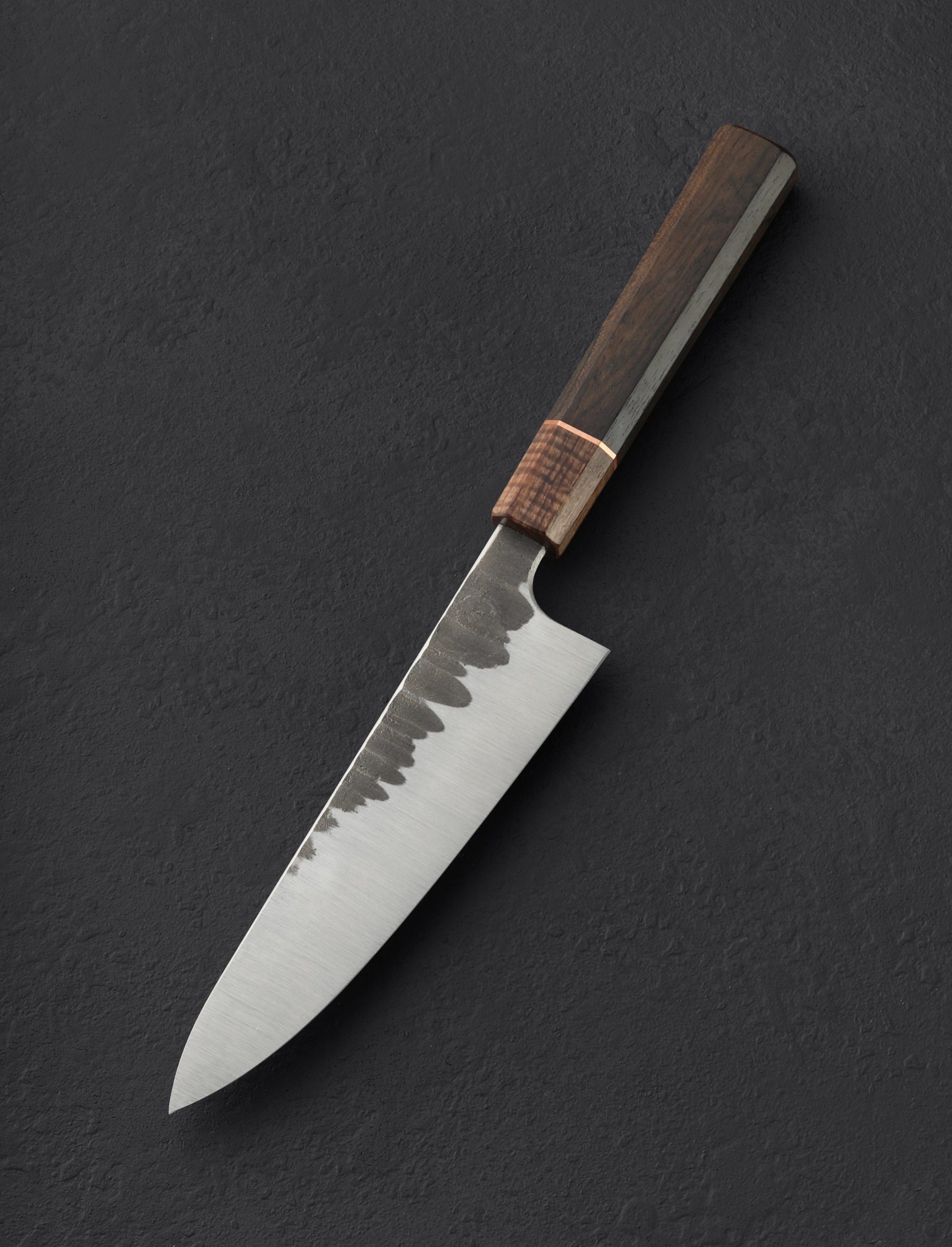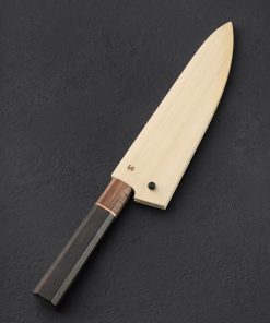 Designed and built for daily use in kitchens large and small, with the nuances and sensibilities you expect from a world-class bladesmith, this 180mm / 7″ chef’s knife from Isaiah Schroeder is versatile, tough, and an absolute pleasure to hold. Balancing just at the blade’s tang in front of the octagonal, wa-style handle, this gyuto delivers the weight and geometry to do it all, from the toughest chops towards the blade’s heel, to the most delicate slices with the extremely thin, tapered, needle-like tip. High performance AEB-L stainless steel is durable and easy to care for, heat-treated in this case to HRC 62.5 for a very hard, sharp edge, with convex, belt-finished bevels below forge-finished flats that show the hammer marks of the knife’s forged origins. For comfort and control Isaiah pairs ziricote with koa wood, separated by a ring of copper, in a long, classic form as comfortable in the pinch-grip as any. A custom poplar saya is included.