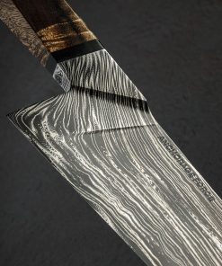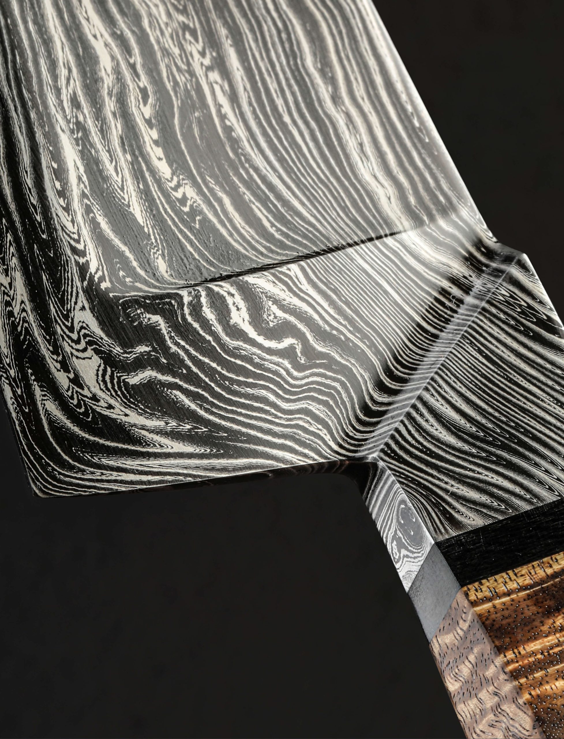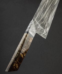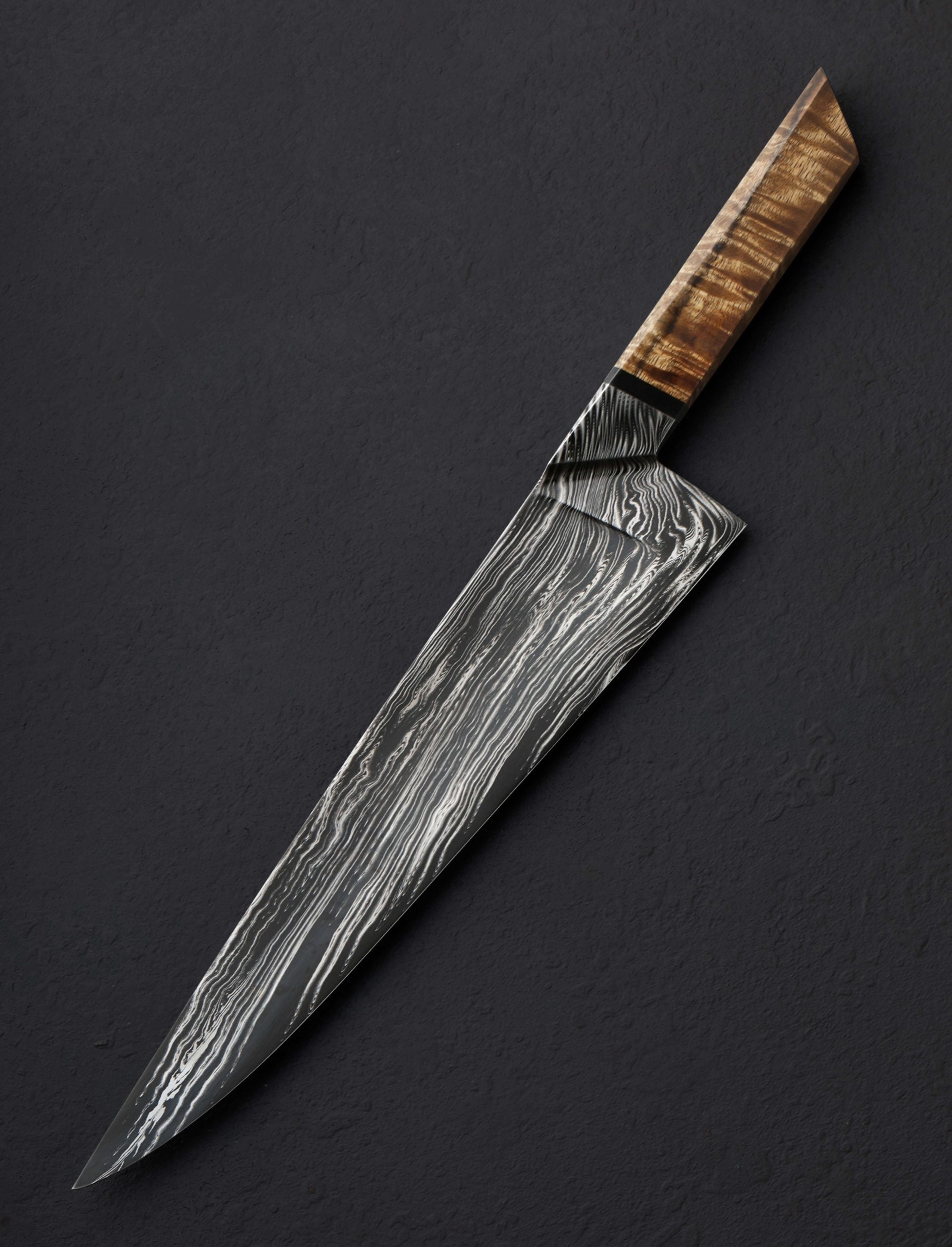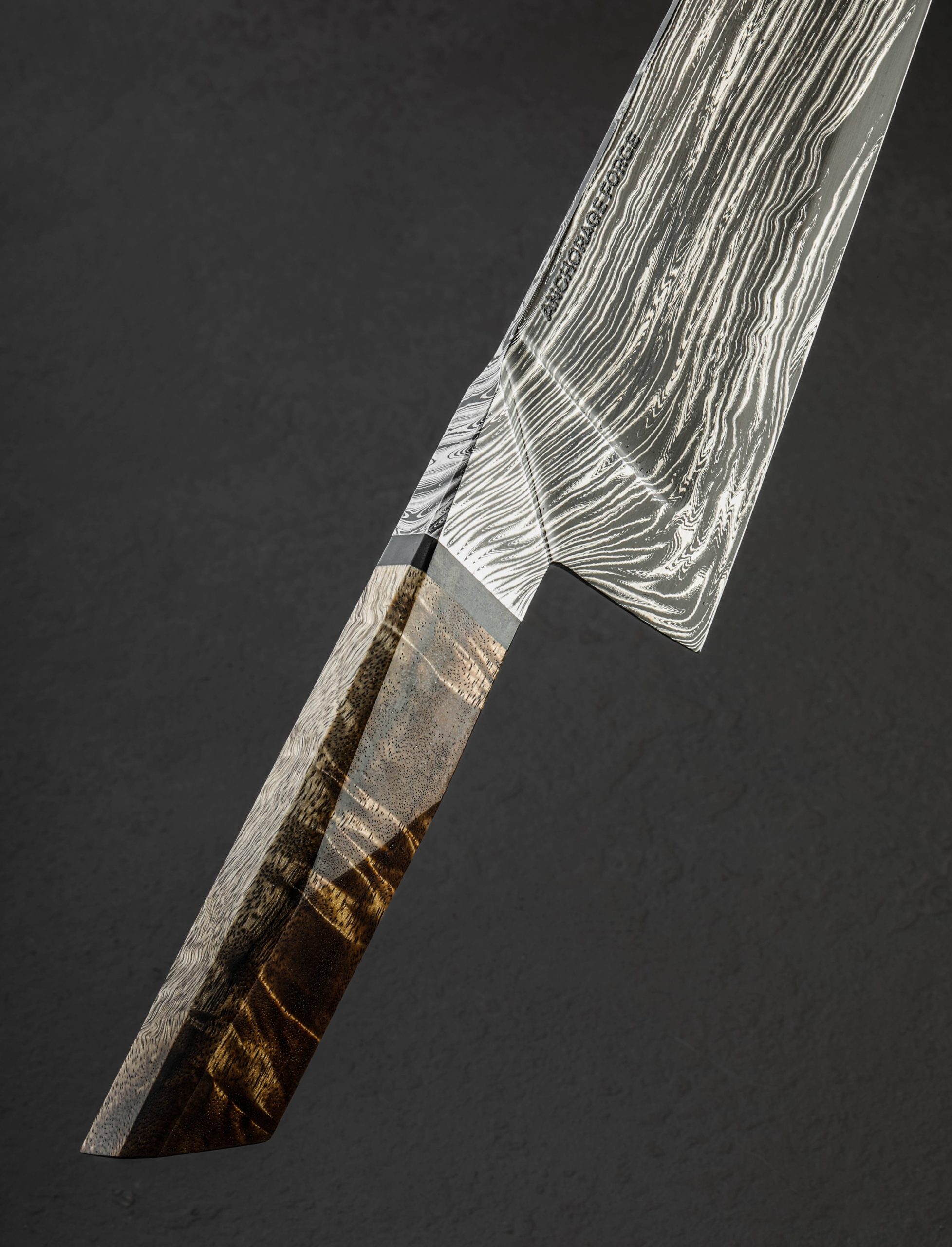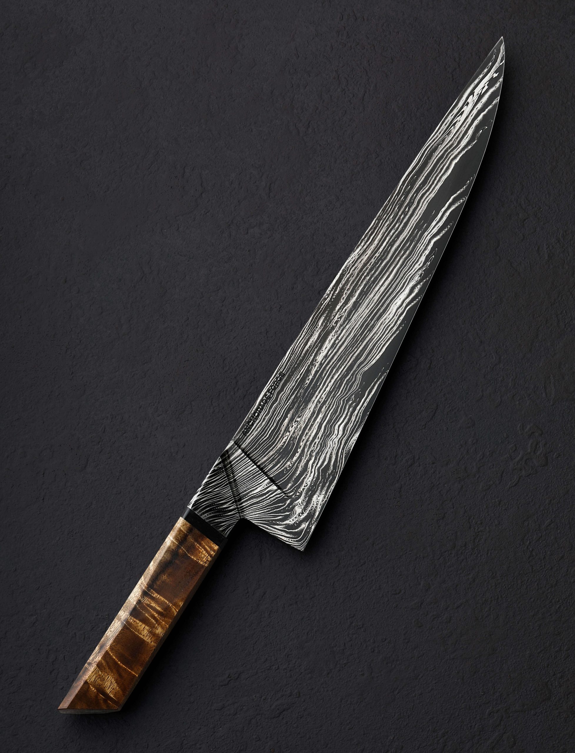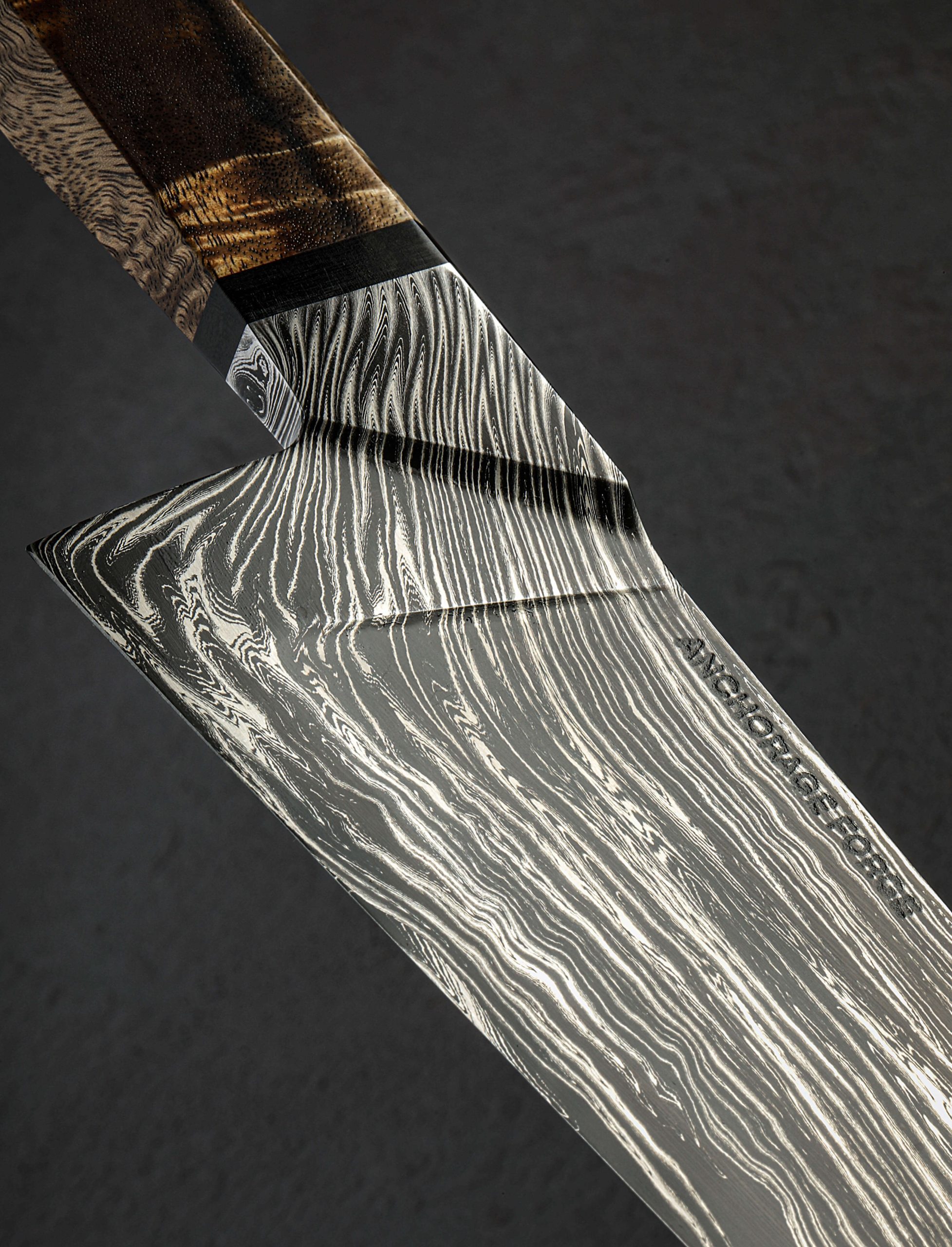 Multi-disciplinary artist and blacksmith Gabe Fletcher of Anchorage Forge has delivered, for his first offering in our collection, a remarkable, one-of-a-kind chef knife. A student of damascus design theory among other areas of particular focus within the world of craft, Gabe has forged by hand this knife’s blade at his Anchorage, Alaska studio from his own stunning housemade carbon damascus steel pattern. Wisps of the nickel-rich 15n20 alloy layered densely with 1080 carbon tool steel combine to create strands, individually full of nearly imperceivable detail, and together creating a flow of energy and a feeling of organic movement and visual momentum from handle bolster to blade tip. Tight and orderly within the faceted bolster, each face of which offers a unique window into the inner workings of the pattern, the damascus then begins to splay, dropping toward the edge, meandering along the spine, and dissipating with each distance traveled. Each point throughout the pattern’s journey is purposeful, Gabe having forged, drawn, and stretched the material just so in order to accentuate the metallic artistry. None of this is, of course, to overlook the technical elements and carefully calibrated geometry of a blade built to use. Light, quick, and nimble in the hand, this knife weighs just 6.1oz / 172g in spite its 15+ inch overall length and edge that stretches on for over 10 inches. The blade’s tapering spine, outstanding, compound ‘S-grind’ geometry, and especially thin, razor-sharp edge all contribute to the object’s ability to keep mass to a minimum. The concave portion of the S-grind begins at the spine and continues downward until approximately half an inch above the edge where the convex section begins. This compound geometry fades out masterfully about two inches from a slim, pointed tip. The thin overall build results in a welcomed bit of lateral flexibility throughout the blade’s length, akin to many vintage French chef’s knife. Completing the handsome build with its multitude of geometric design elements is a comfortable, thoughtfully faceted handle which Gabe has sculpted from gorgeous koa wood and fitted with a black micarta spacer. A flush, stainless steel retention bold cap is visible at the handle’s rear. Balanced a hair in front of the blade’s 58mm tall heel, this daily-use kitchen cutting tool is the very definition of form and function in action.