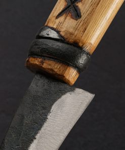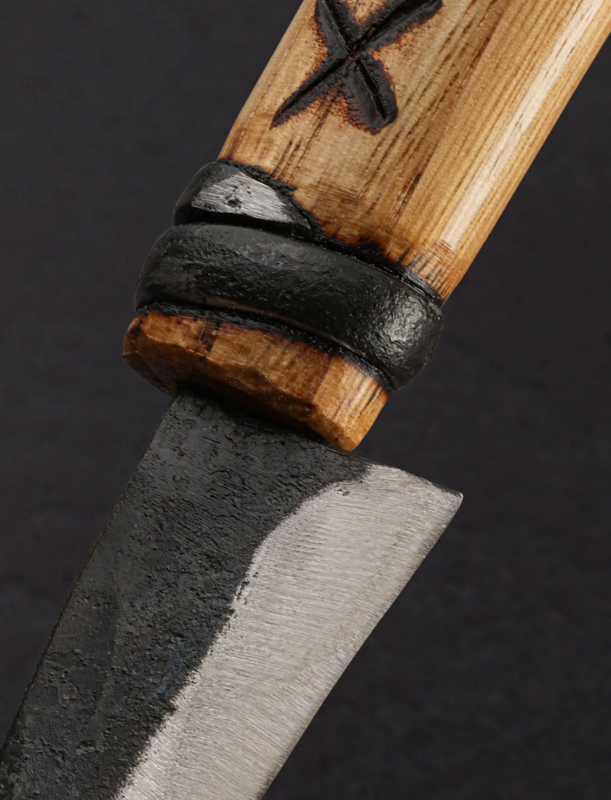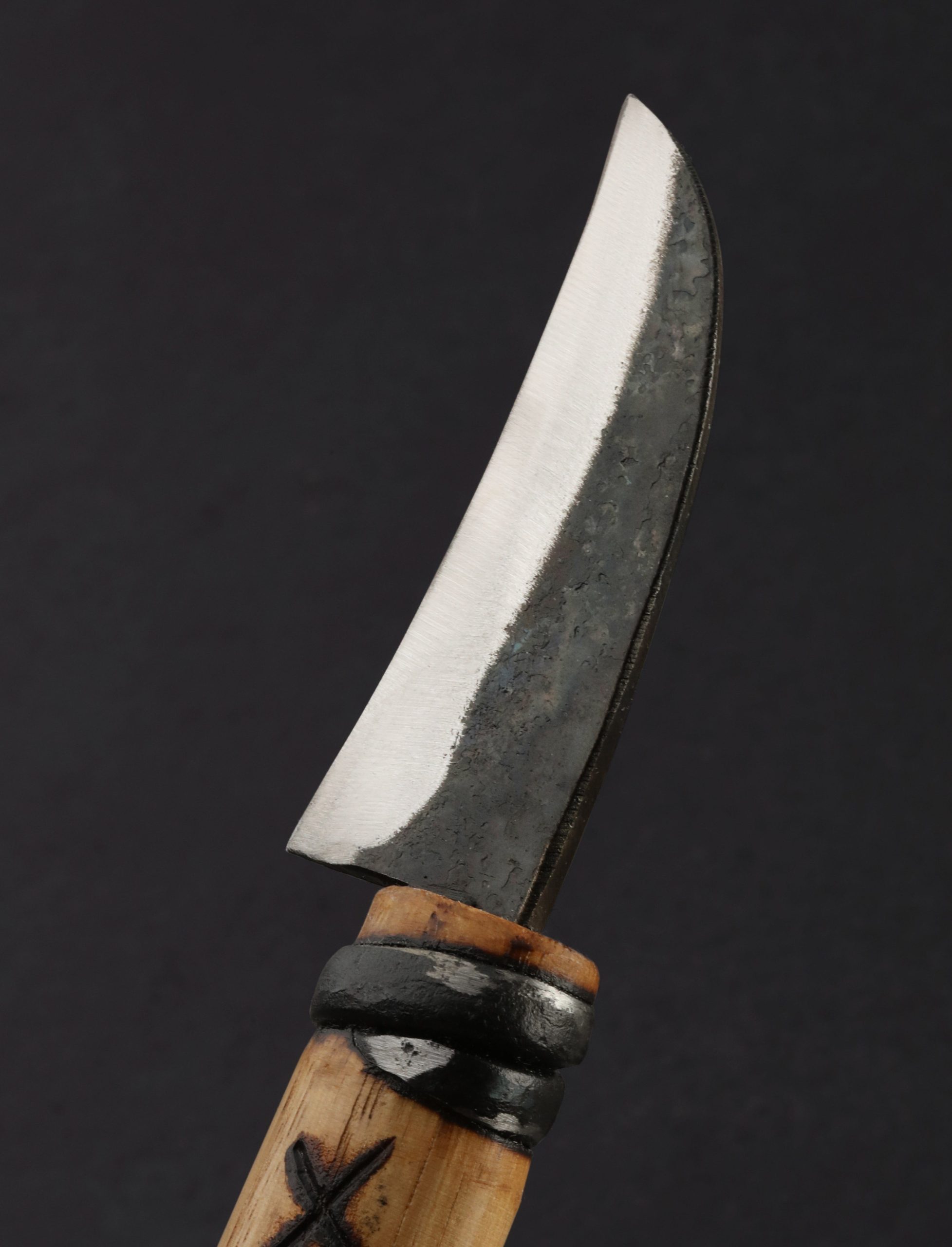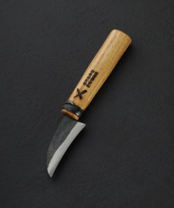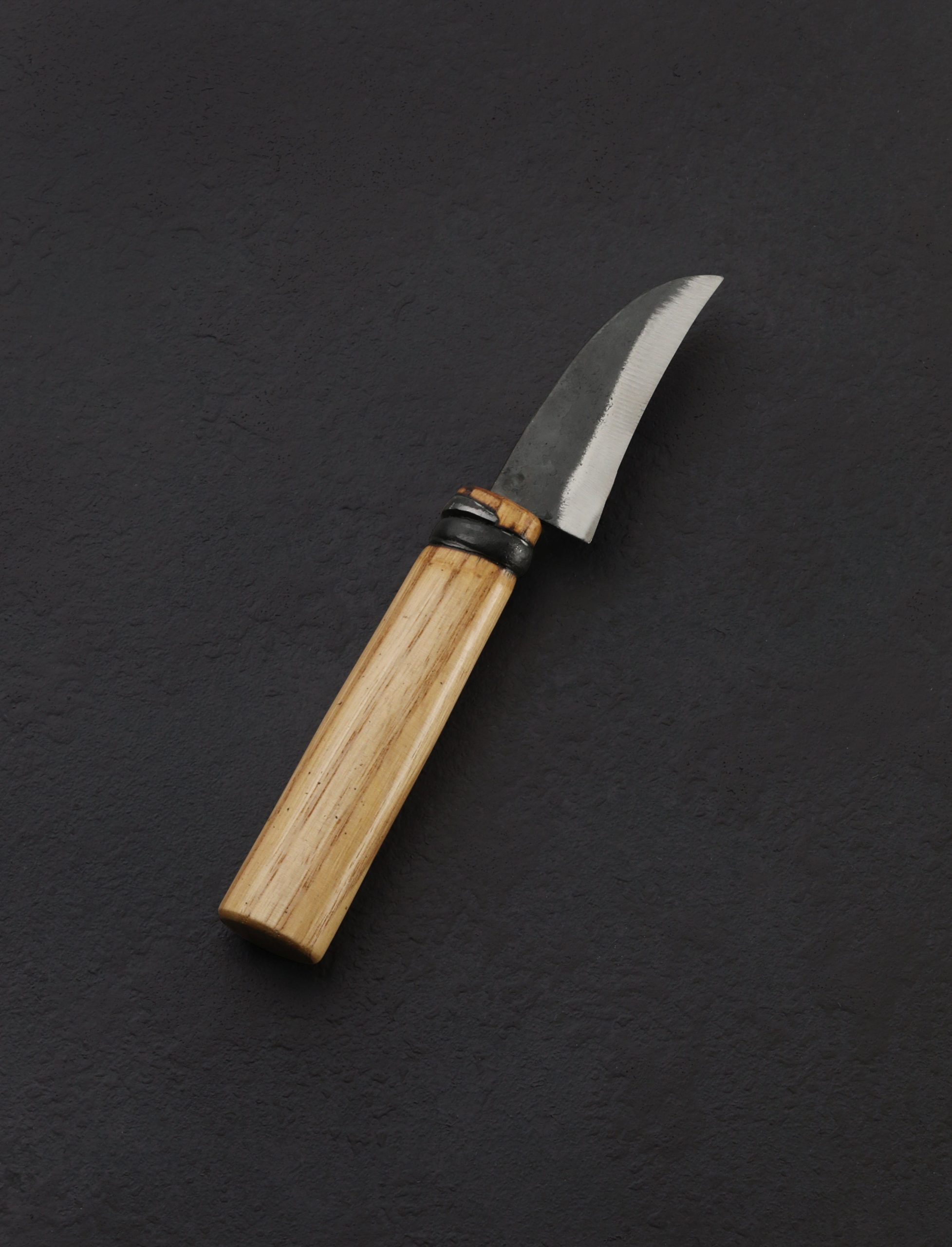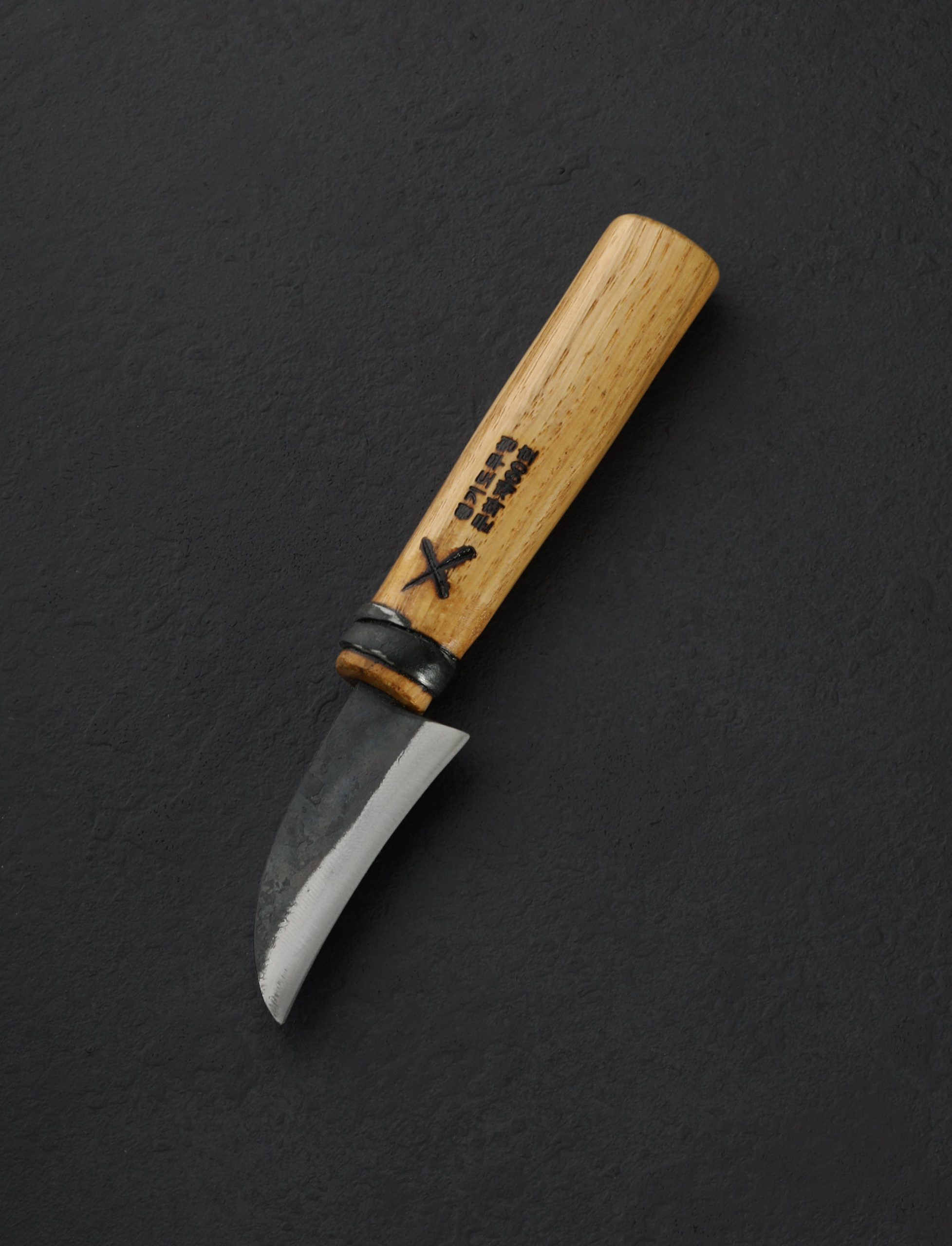 A rustic, simple approach to design and construction makes this traditionally crafted bird’s beak paring knife a welcomed addition to any kitchen. For handheld work indoors or outside at the grill, from peeling ginger and tomatoes to trimming brussels sprouts and deveining shrimp, a hand-forged carbon steel blade is crafted in the South Korea blacksmith shop run by Master Shin In-young. With rough, forged finish and sharp, toothy edge, the short, curved blade flows into the natural hickory wood handle with forged steel rings. A unique, handmade gift for anyone who loves to cook.