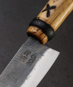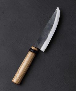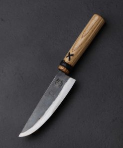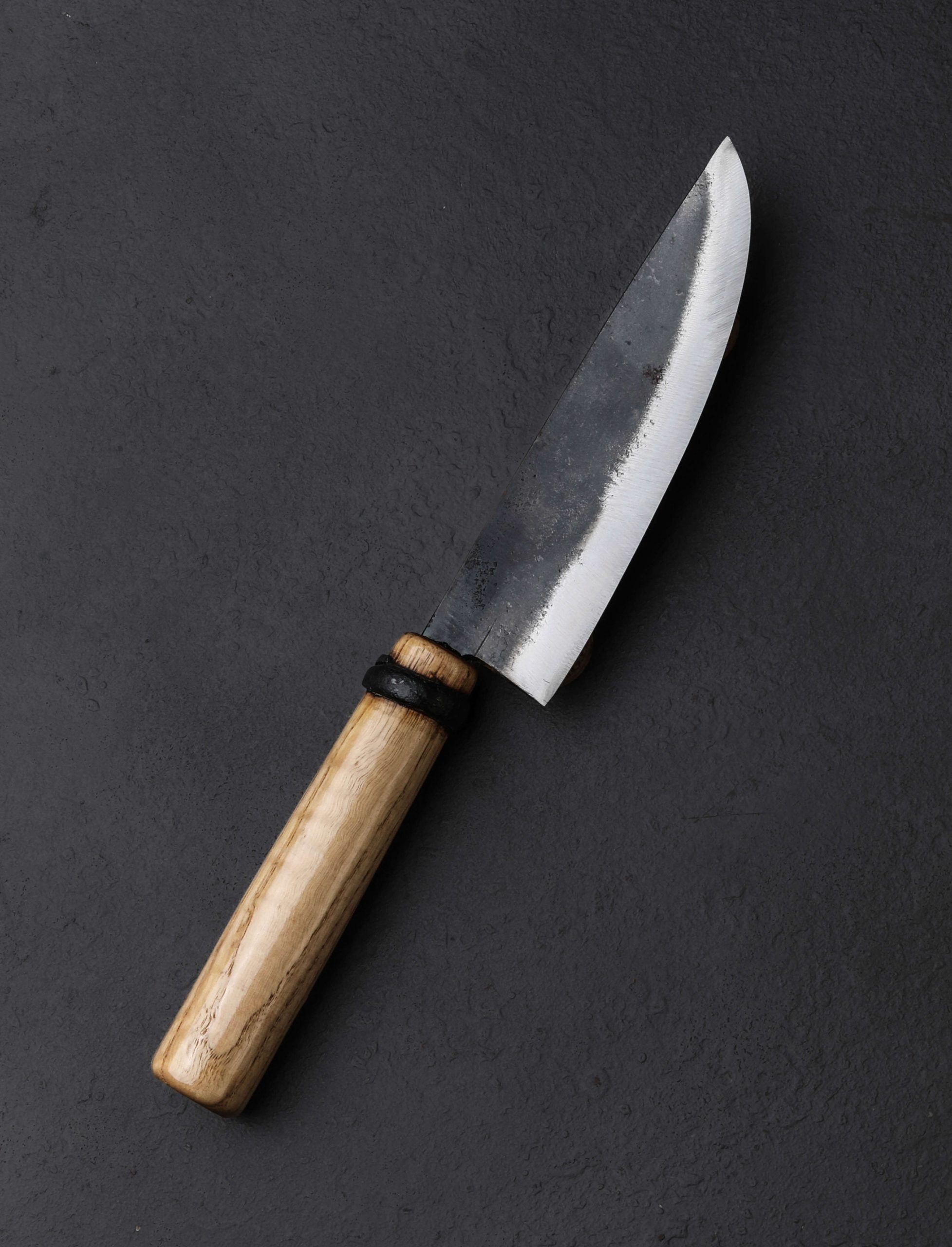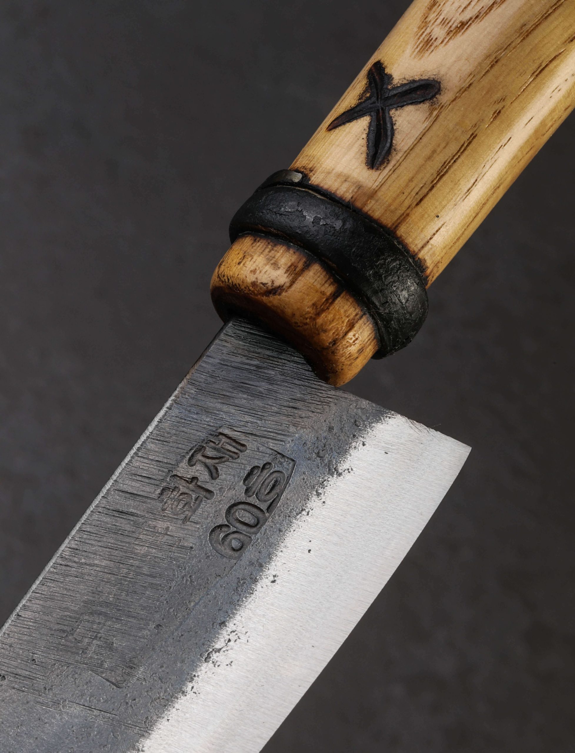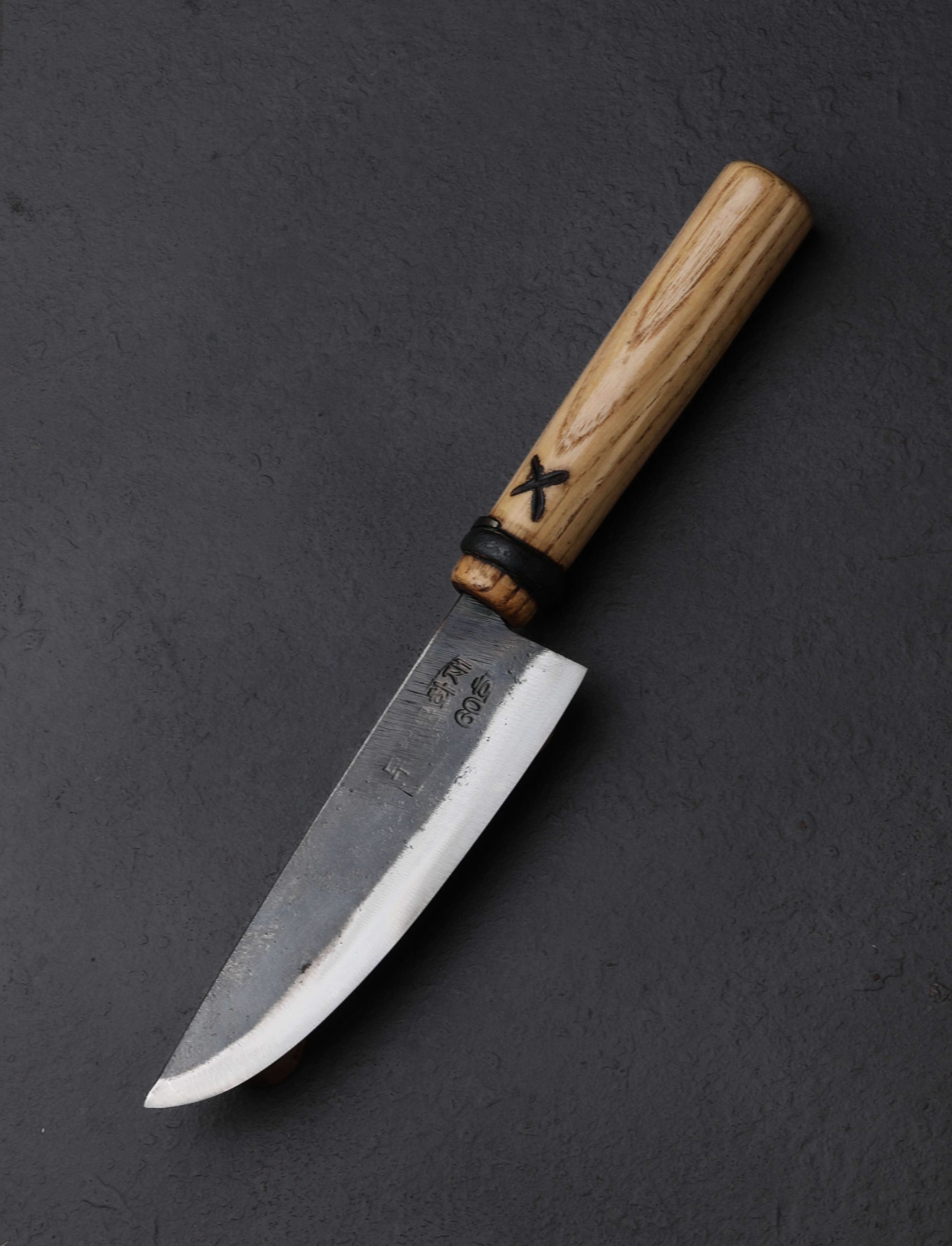 A carbon steel knife hand forged in the South Korea blacksmith shop run by Master Shin In-young. With rough, forged finish and sharp, toothy edge, the upswept, hidden-tang blade flows into the natural hickory wood handle with forged steel rings. This rustic, simple approach to design and construction makes this a traditionally crafted, utilitarian knife that will make fast work for all variety of slicing needs both indoors, or out on a cutting board beside the fire. A unique, handmade gift for anyone who loves to cook.