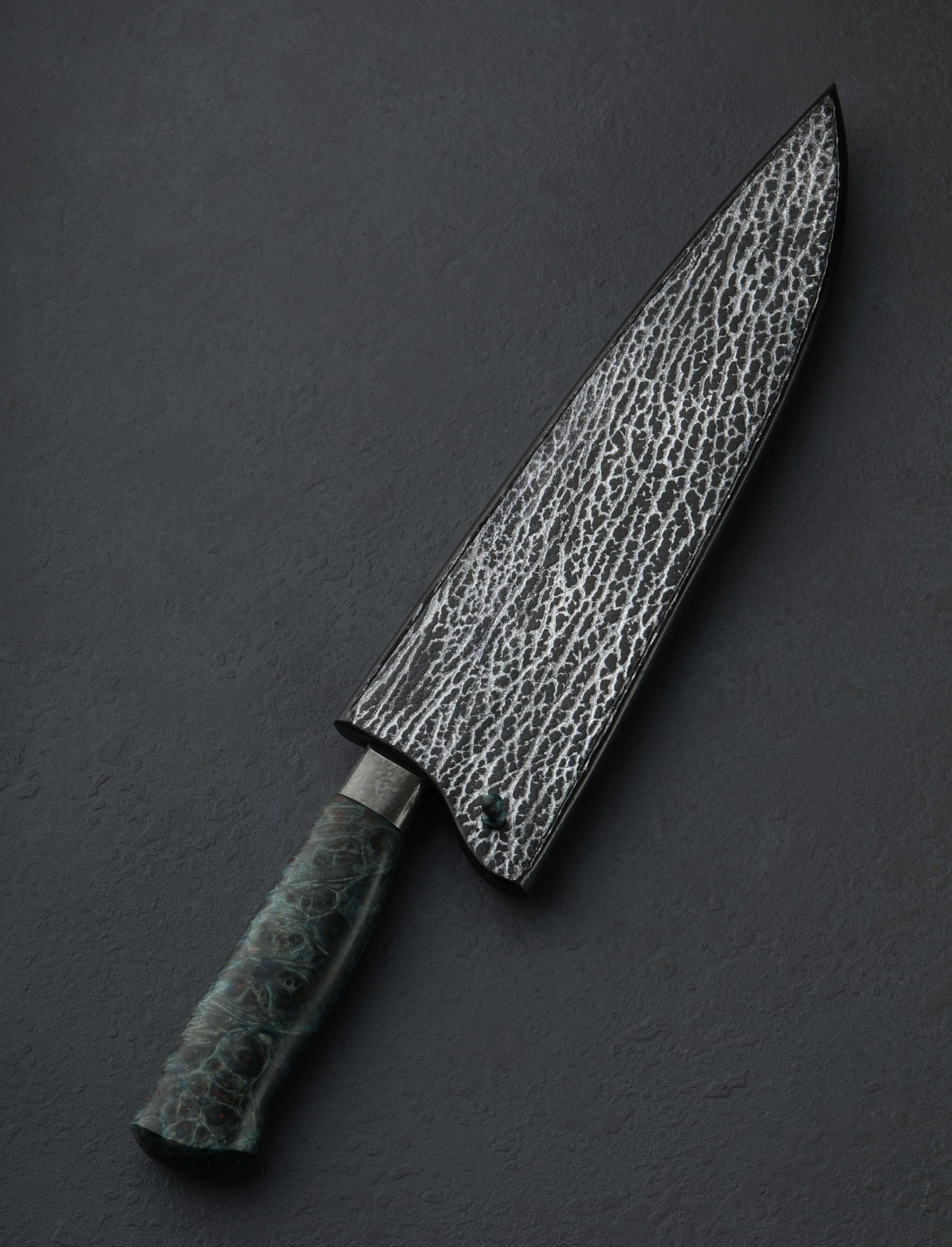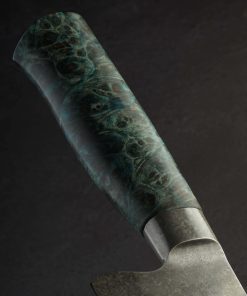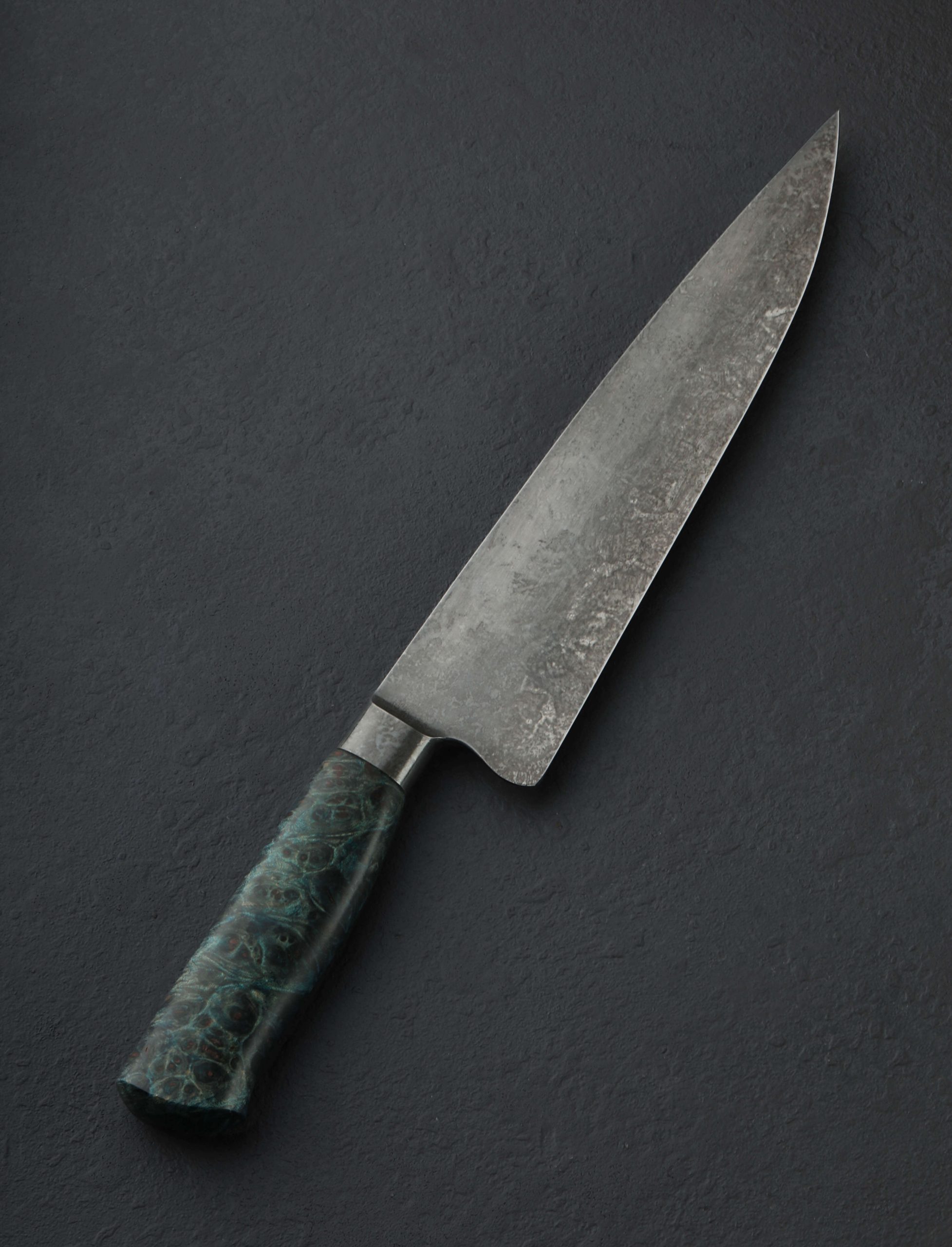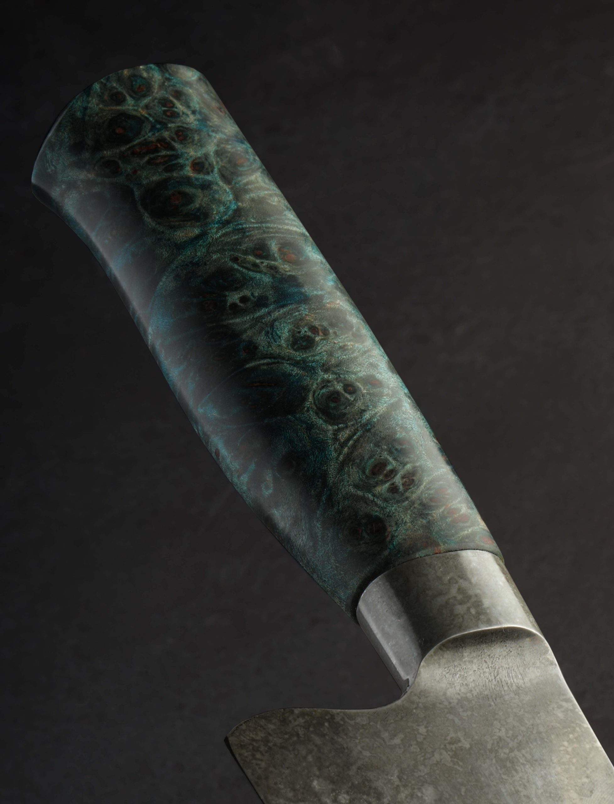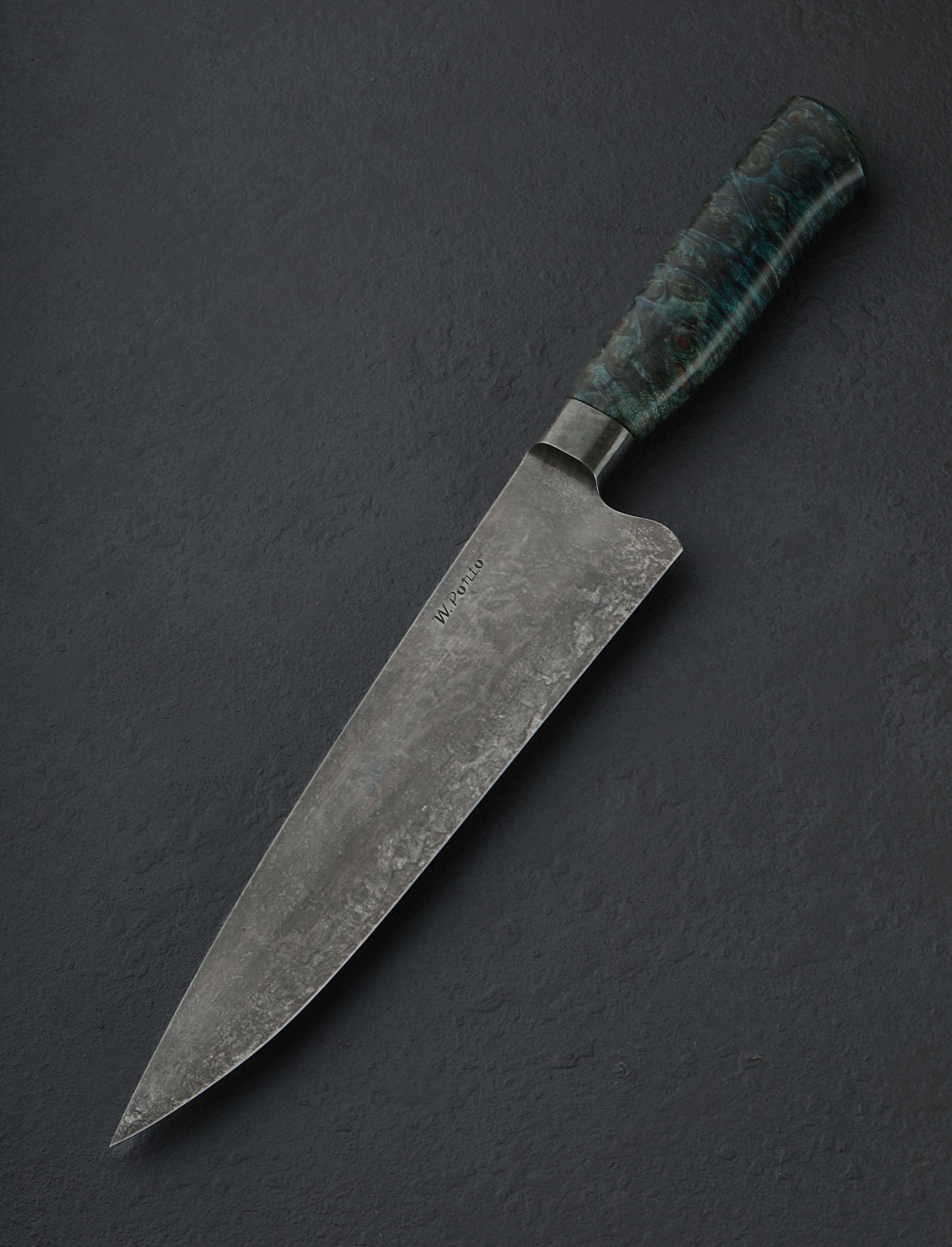 Artist and bladesmith William Porto of Brazil has delivered another breathtaking chef knife designed for daily meal prep, and this time, a first from William, it features a beautifully applied, forced mustard patina finish. Like every one-of-a-kind object that leaves William’s studio, this creation is crafted for uncompromising utility, its 230mm / 9″ blade offering convex primary bevel geometry, a sharp, tough, and dynamic edge that is thin and precise toward the tip for slicing while being tough and powerful at the heel for chopping tasks. A full distal taper along the rounded spine leads to a pointed, needle-like tip and provides a touch of lateral flexibility in the final inches while the blade maintains rigidity further back. Balancing at the front of the heirloom-fit integral bolster, the knife is quick and nimble yet steady in the hand, providing a natural, welcomed feel that we would cook with morning, noon, and night. Completing the handle is a simply carved and elegant piece of stabilized maple in gently sculpted, hand-hugging Western form. Included is a custom-made leather saya with pin.