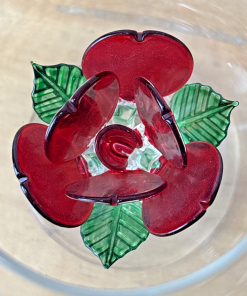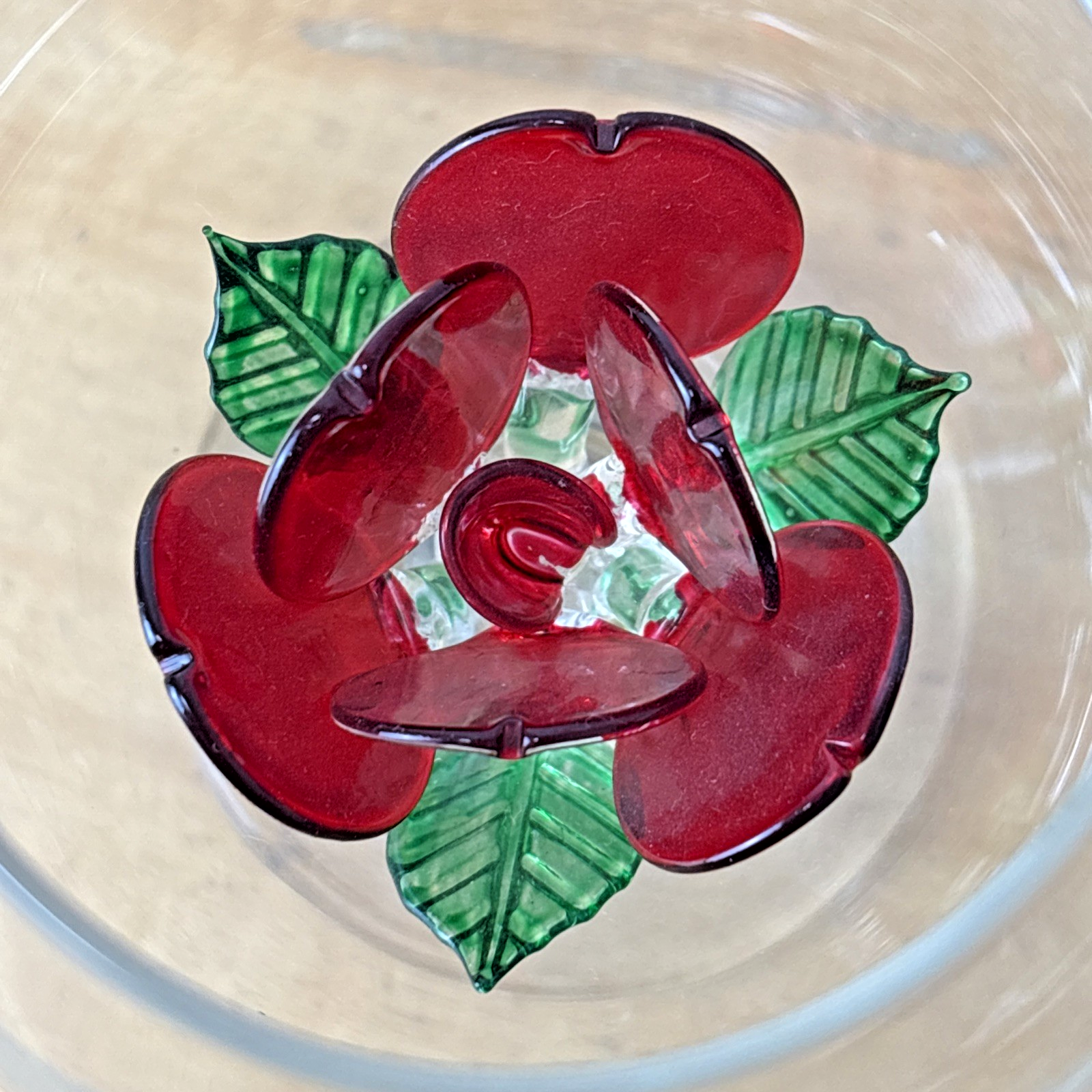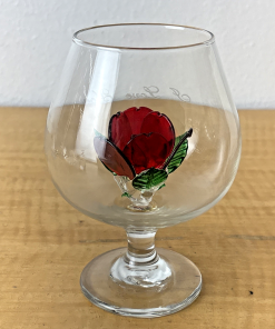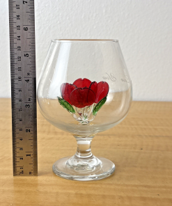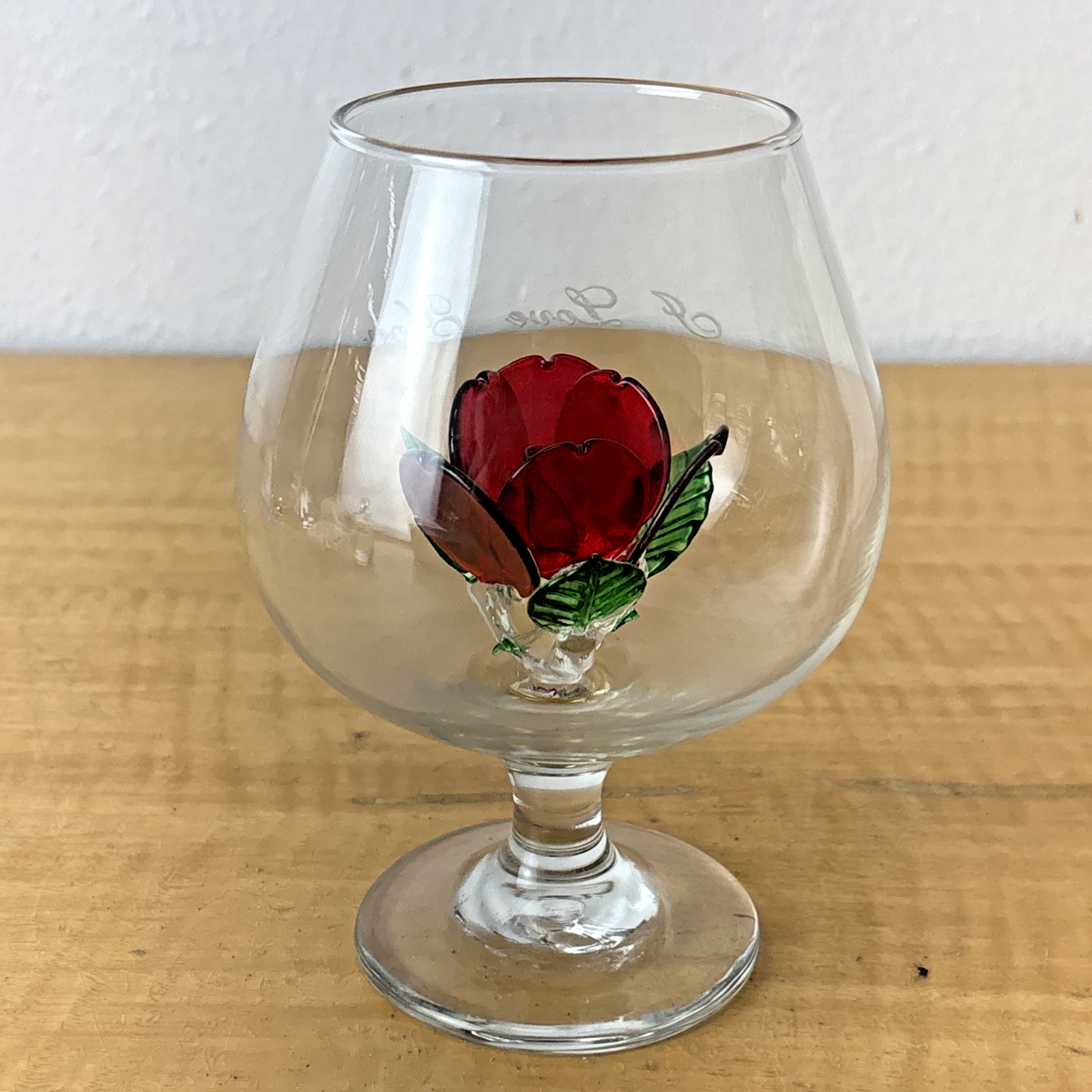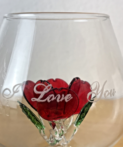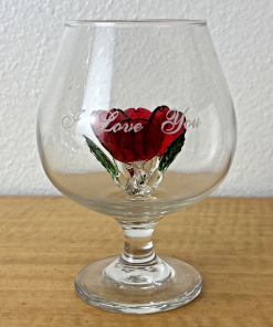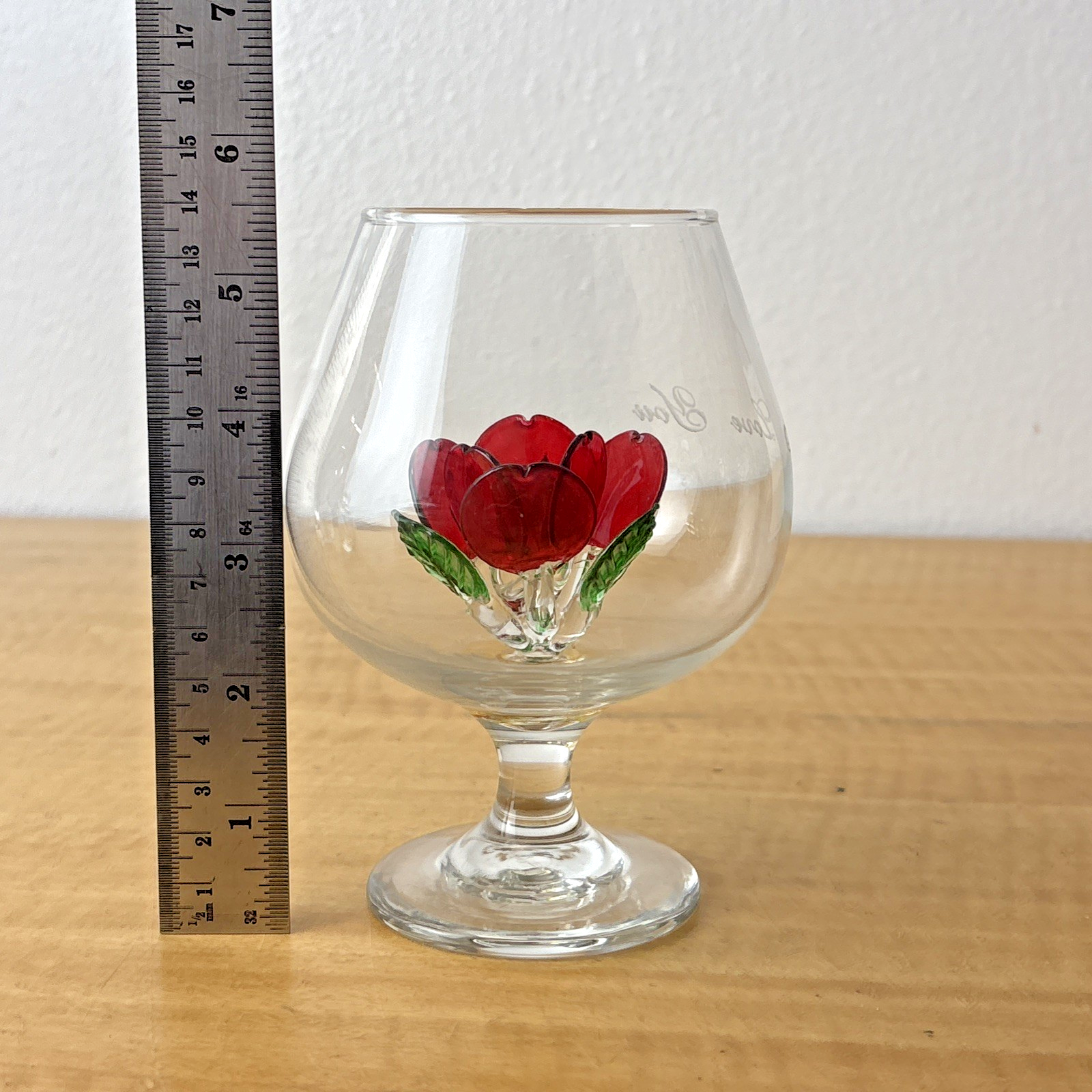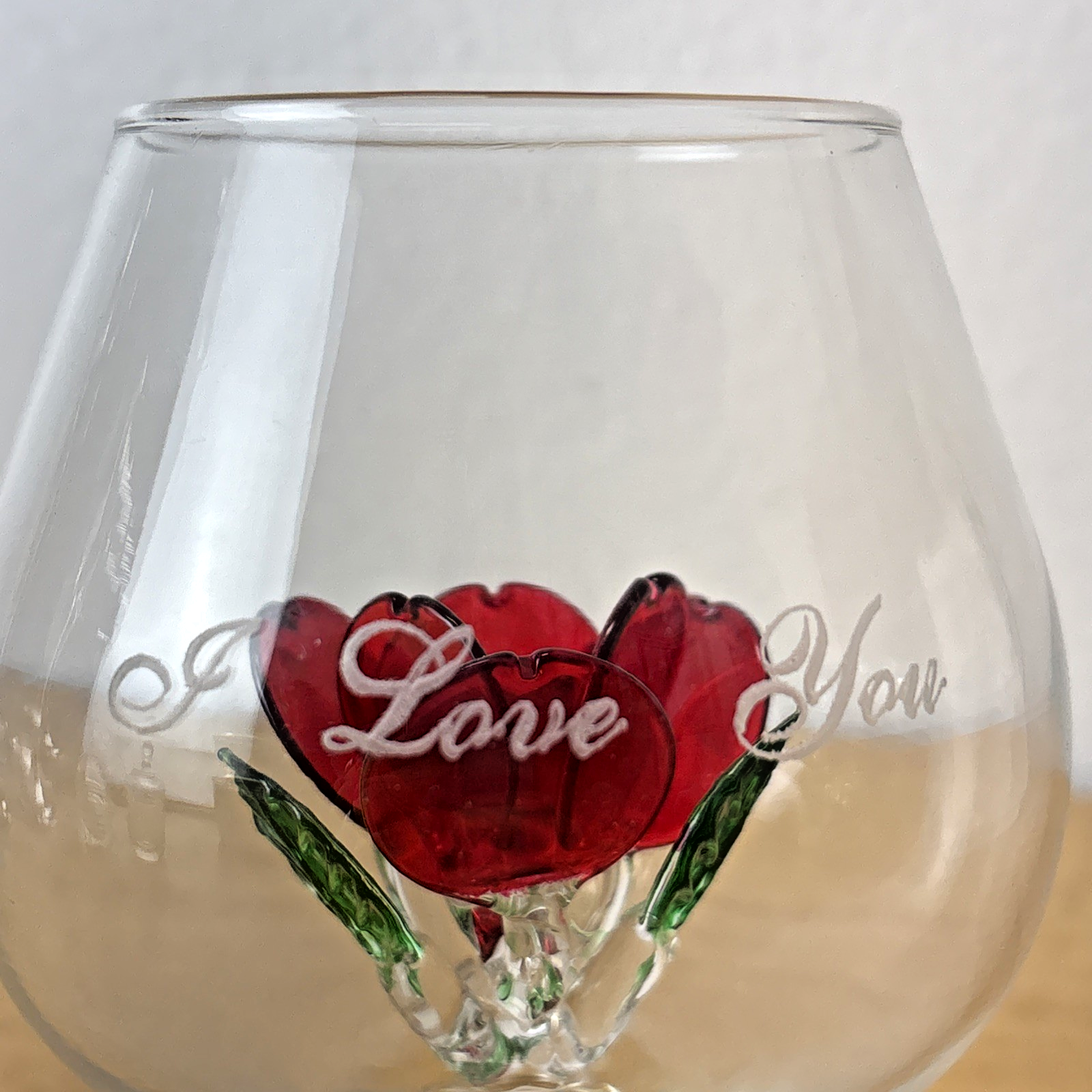 Art Glass Brandy Glass With Red Rose Handblown Decorative Etched ” I Love You “