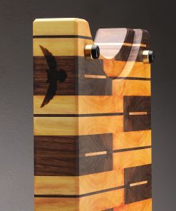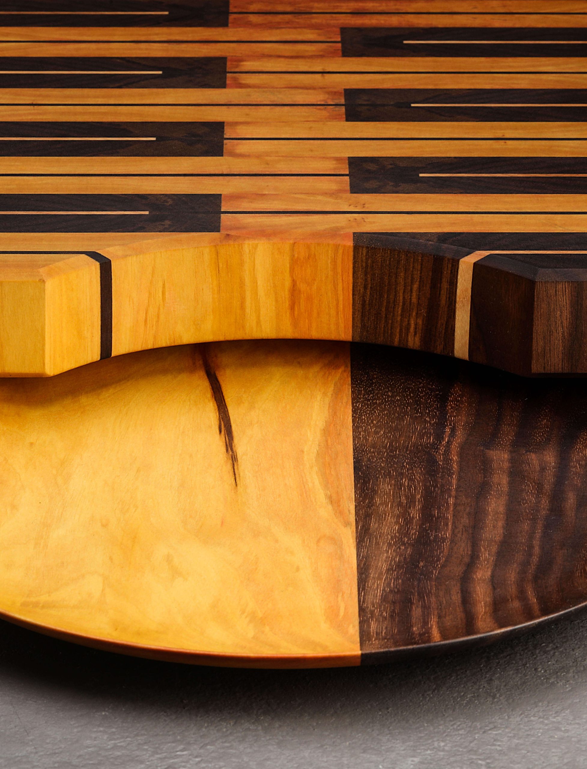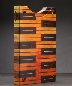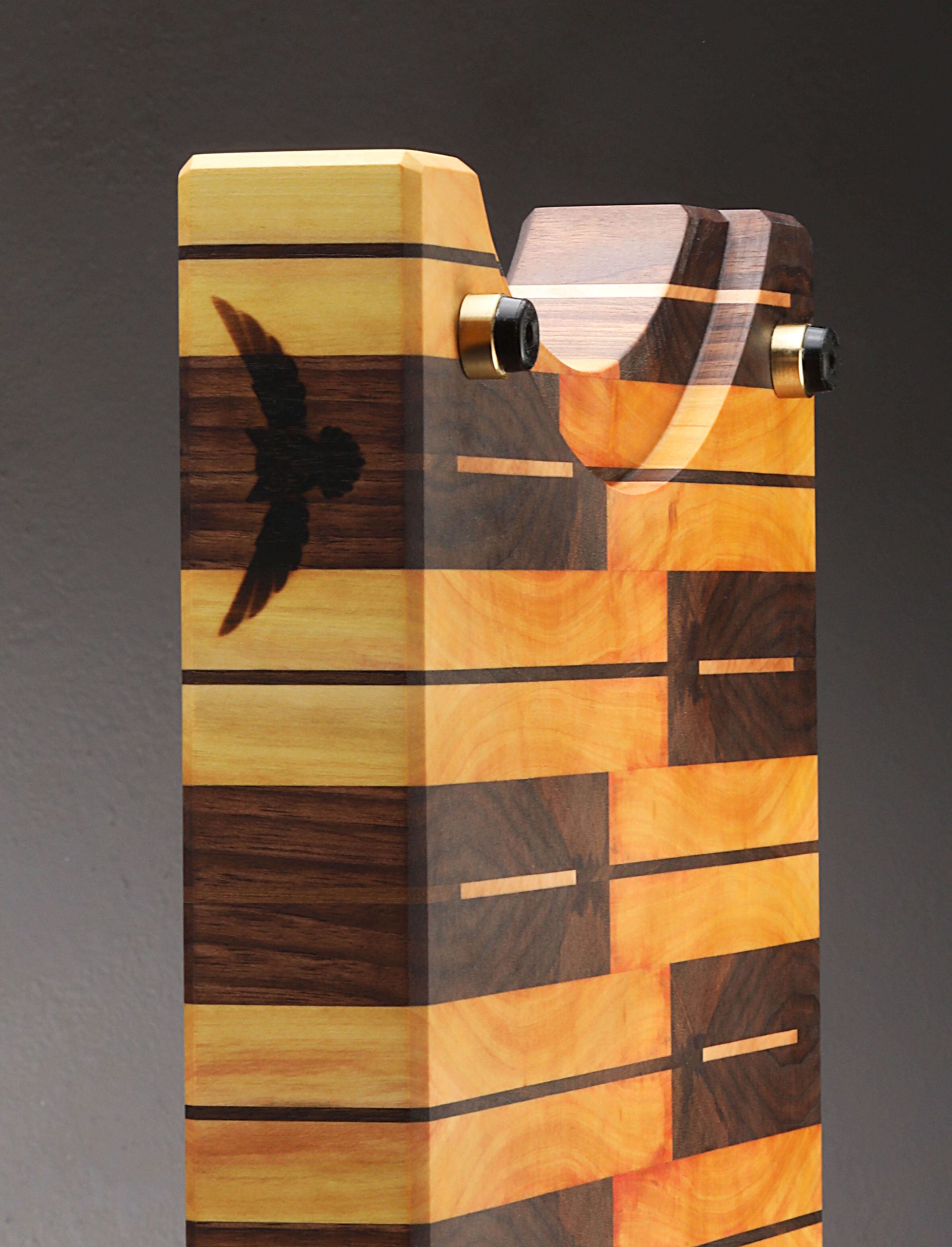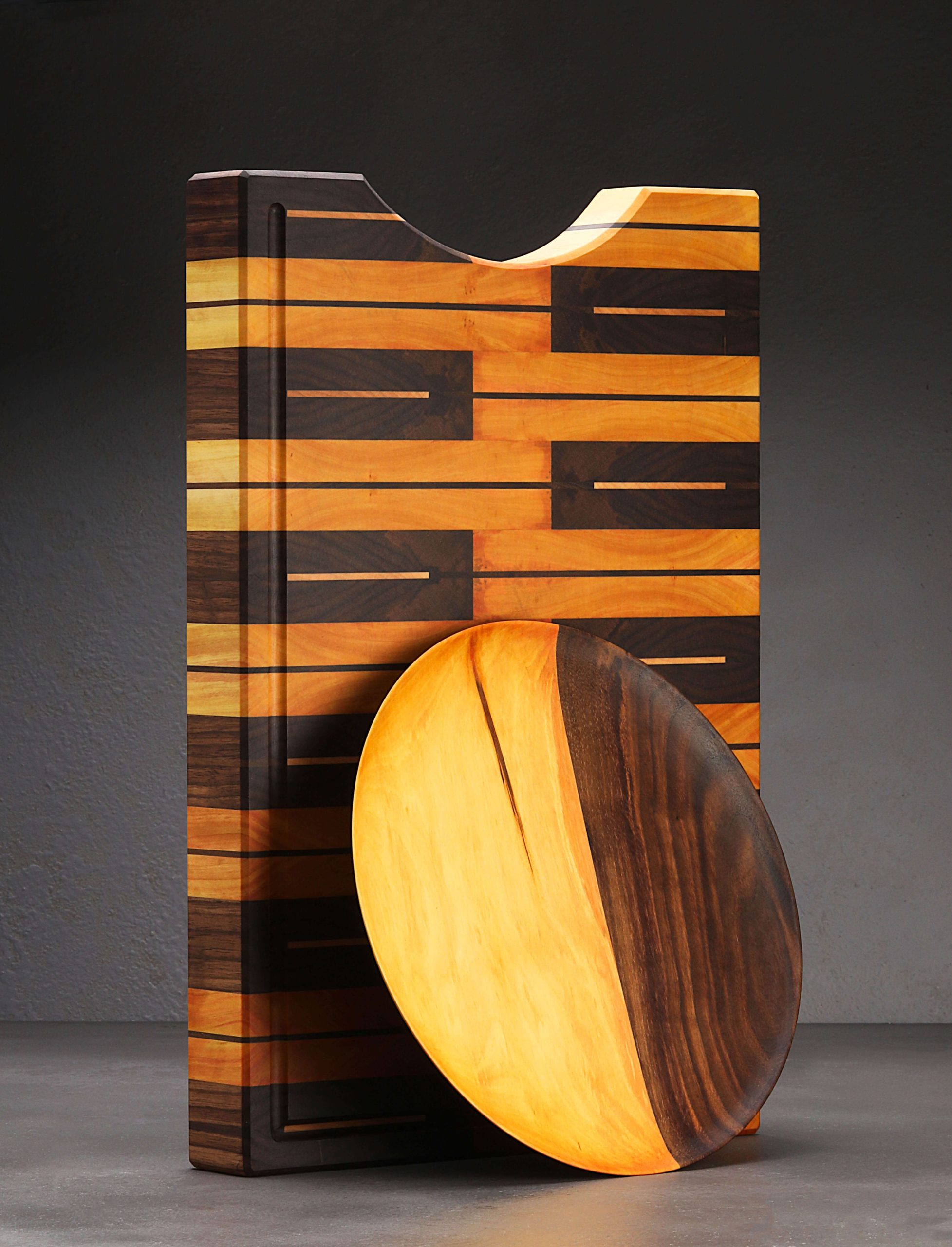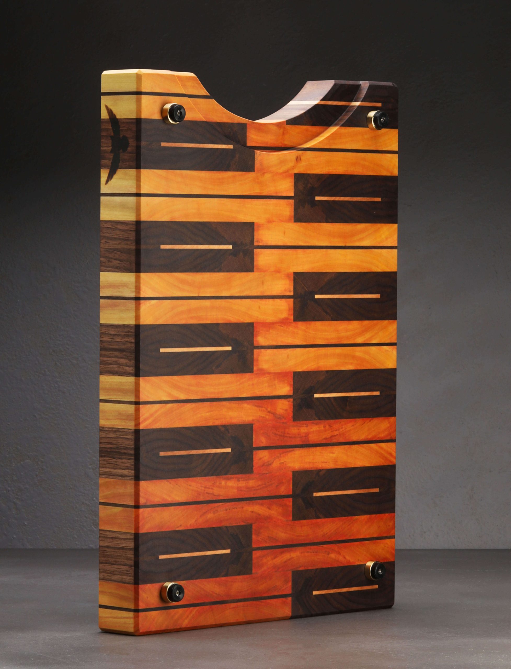 A vibrant board, named “Autumn,” but with beauty deserving of year-round use, is a one-of-a-kind work of art that to the touch feels somehow even more exceptional than it looks. Crafted by Luke Martin of Owl Woodworks in Canada from yellowheart, walnut, and maple wood, is a 12″ by 18″ butcher block fitted with juice grooves along the top and side as well as a half-moon cut-out for its matching plate on the opposite side, allowing for a smooth and easy move of freshly chopped ingredients off of the cutting surface. The board sits raised over its place on the countertop, suspended above by feet of brass, stainless steel, and silicone to prevent any slipping or sliding. Not only in looks does this block speak of the autumn leaves falling, but also in the character imbued into it by Luke; it carries the feeling of a cozy and warm home to cook and eat in with family and friends as the air cools and crisps outside.