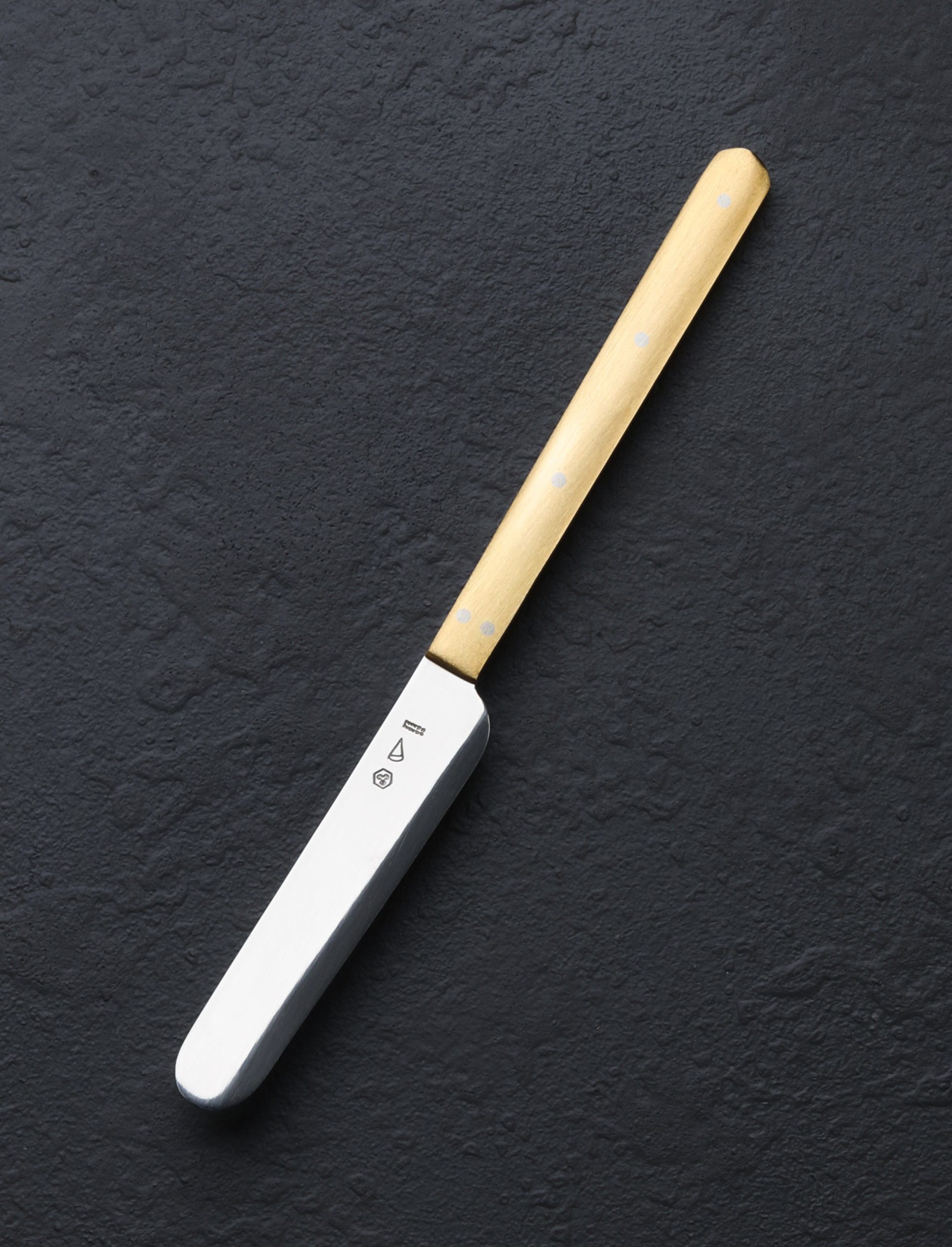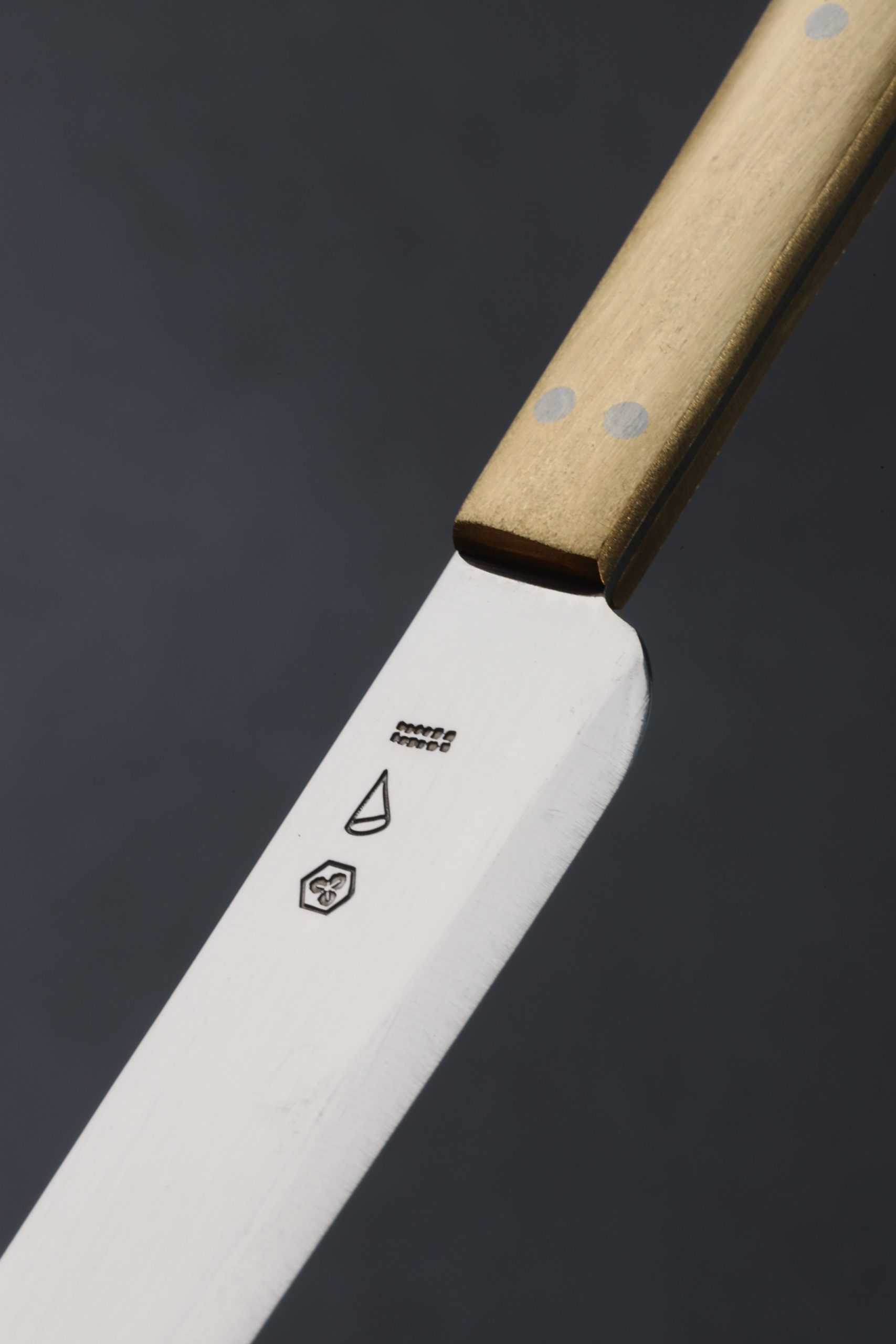 Crafted from brass and stainless steel using traditional Japanese techniques, this elegant butter knife is designed, in collaboration with Azmaya, by metalsmith and artist Osamu Saruyama. Over time the brushed brass handle will develop a dark, rustic patina. The design, balance, and craftsmanship represent the attention to detail and quality of this and all Azmaya products.