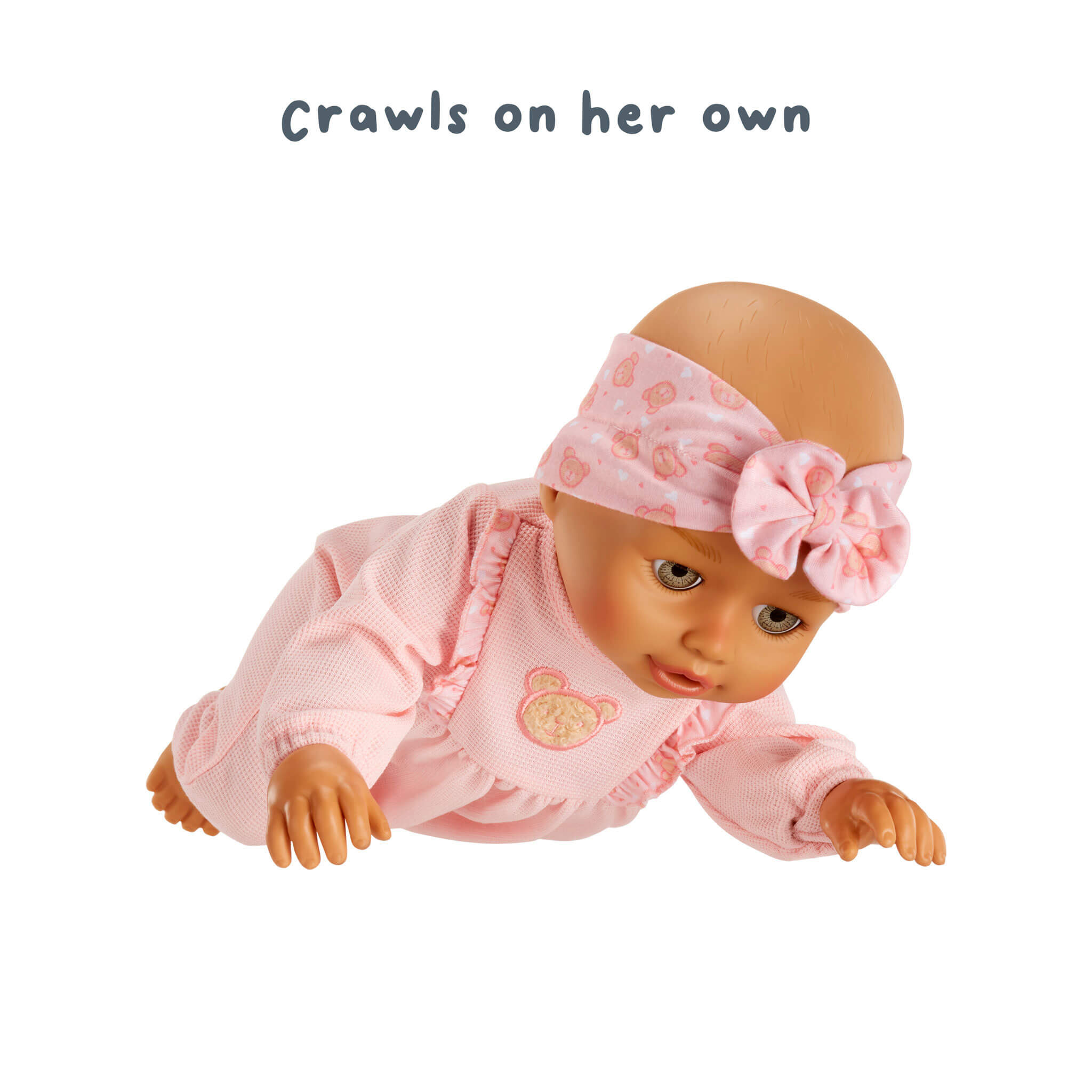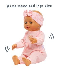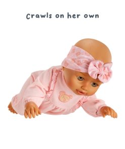 Set her into the crawling position and she will crawl by herself! Start her off on all fours and watch as she struggles to crawl, you might hear some crying sounds but that’s not for long — soon she’s off again, crawling on the floor! Push her tummy button and she’ll do it again and again.