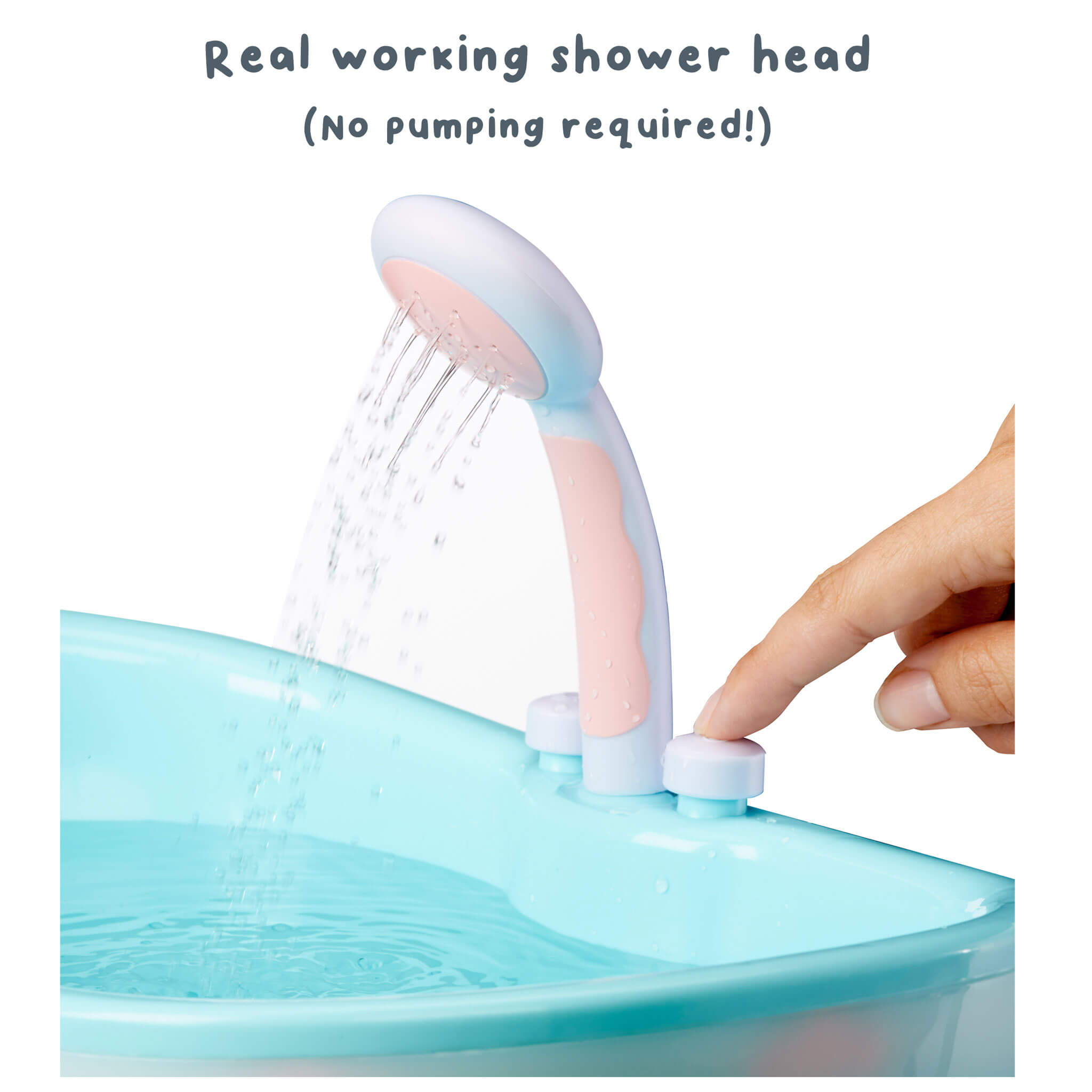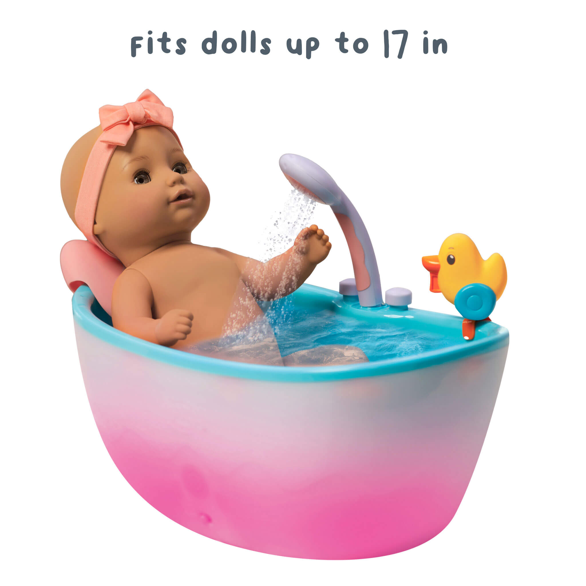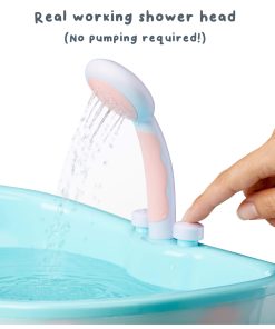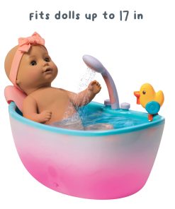 It plays music, lights up and features a motorized showerhead that sprays water. No pumping required! For use with dolls designed for water play. Doll not included. Includes a toy rubber duck that squirts water and a heart-shaped neck pillow. This bathtub is thoughtfully designed using premium materials for a sturdy, modern look.