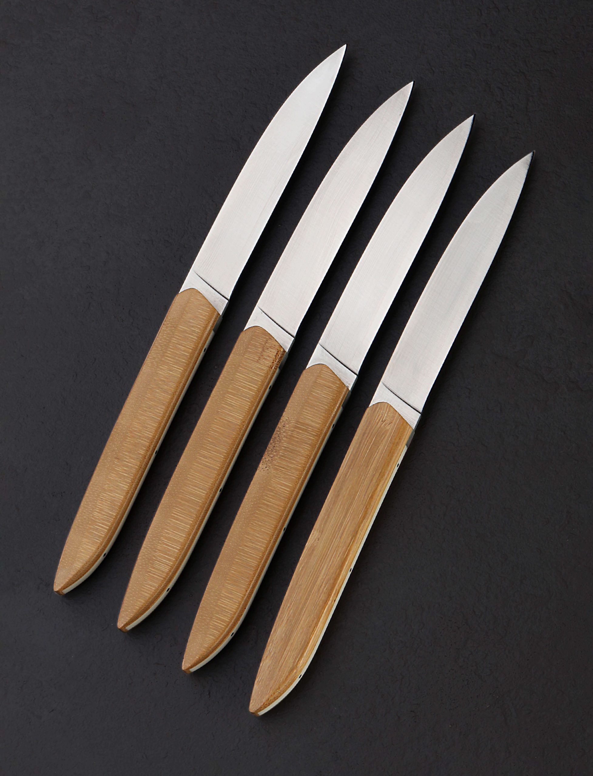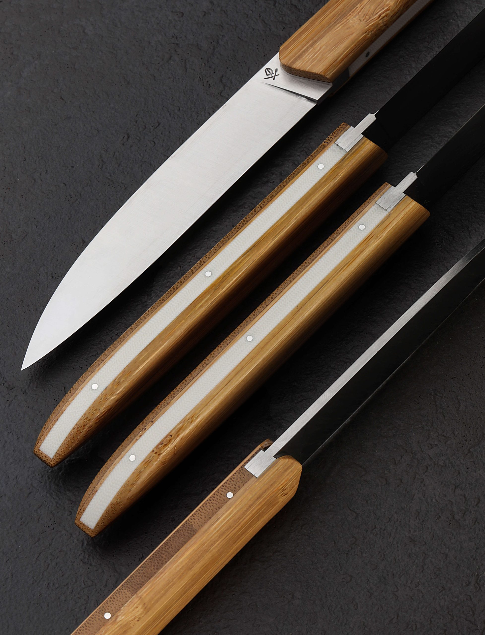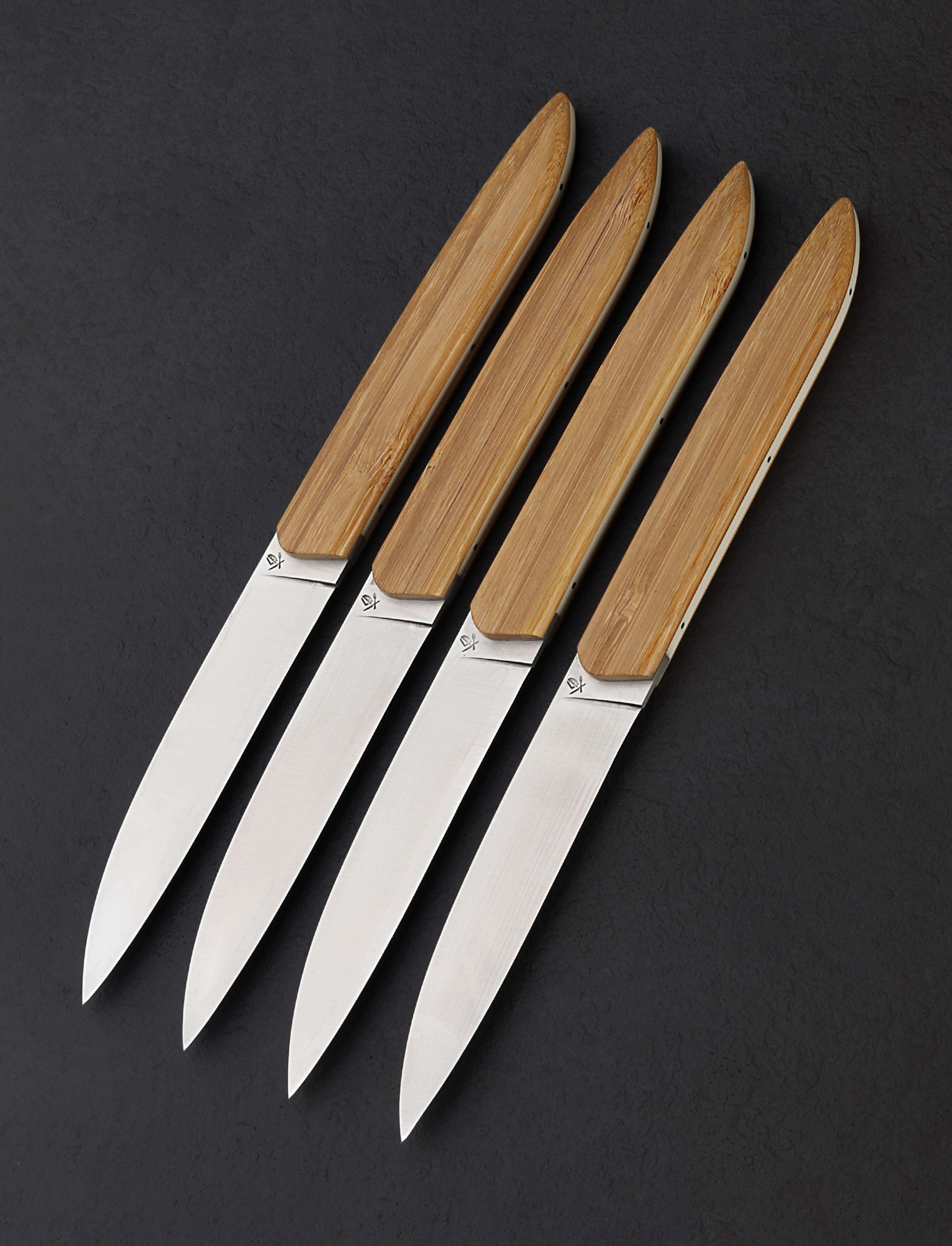 Dressed for every dining room and any occasion, beautiful, sustainable bamboo handles grace the newest steak knife design from Roland Lannier’s Tableware’s Not Dead collection. Crafted by hand in the French town of Thiers where knives have been the inhabitant’s primary art form since the Middle Ages, these four-knife sets feature Roland’s iconic blade shape designed for longevity and performance with its straight edge profile and low, pointed tip. The 14c28n stainless steel is easy to care for, retains a slim, sharp edge, and features an elegant finish throughout. The bamboo’s natural grain wraps from the handle’s sculpted sides and around the top, while beneath a frame of white micarta completes the tool’s styled look. A series of flush, stainless steel pins secure each element.
