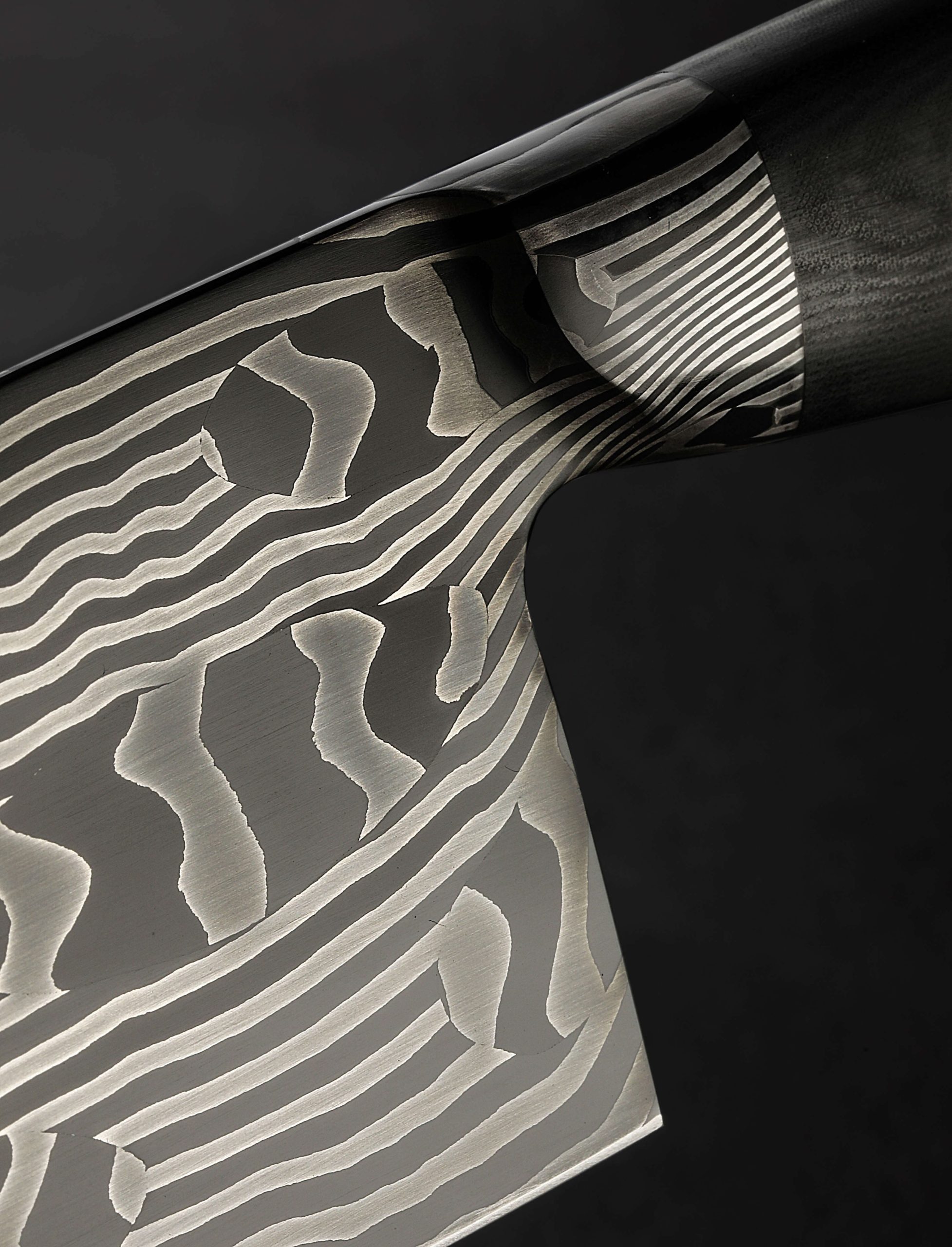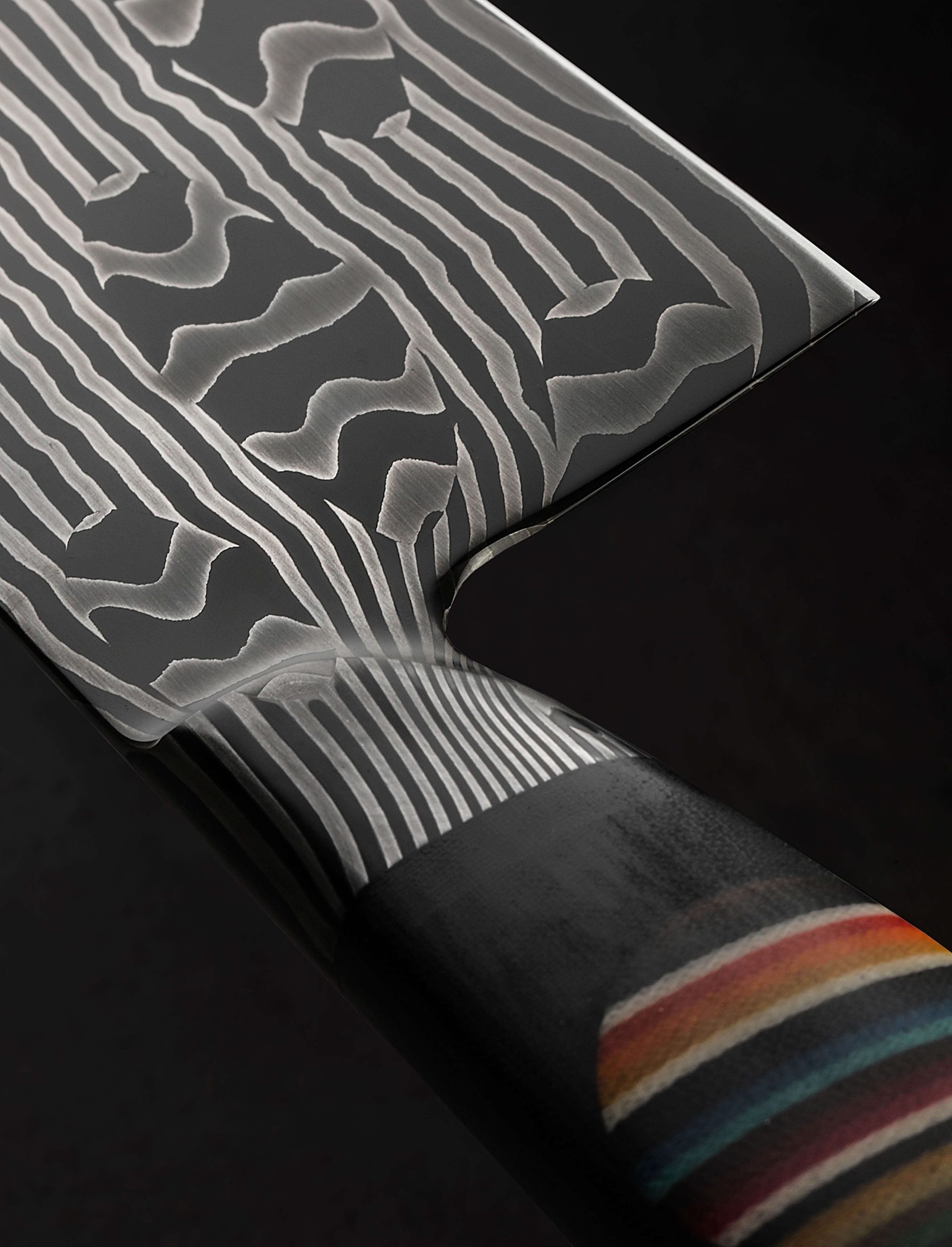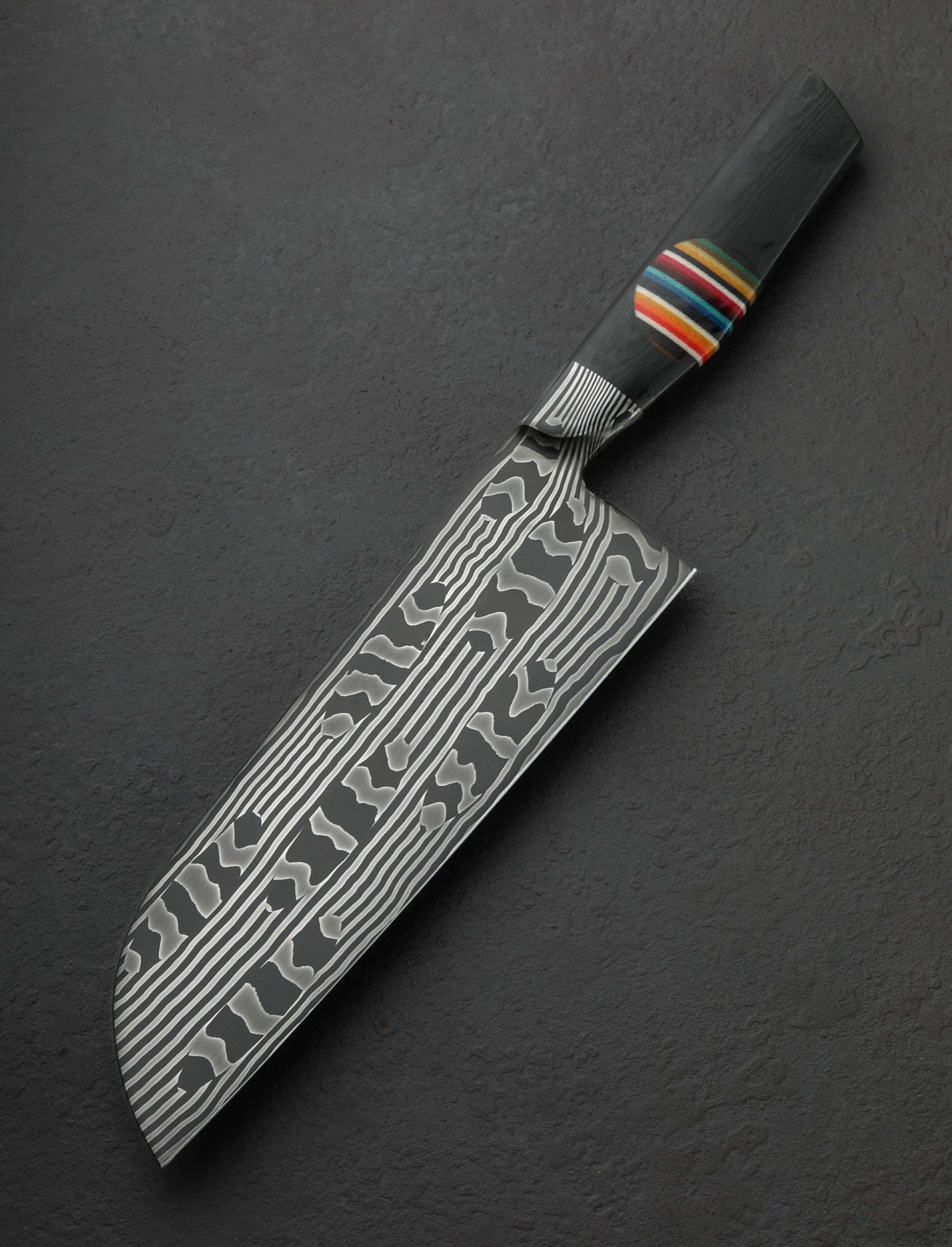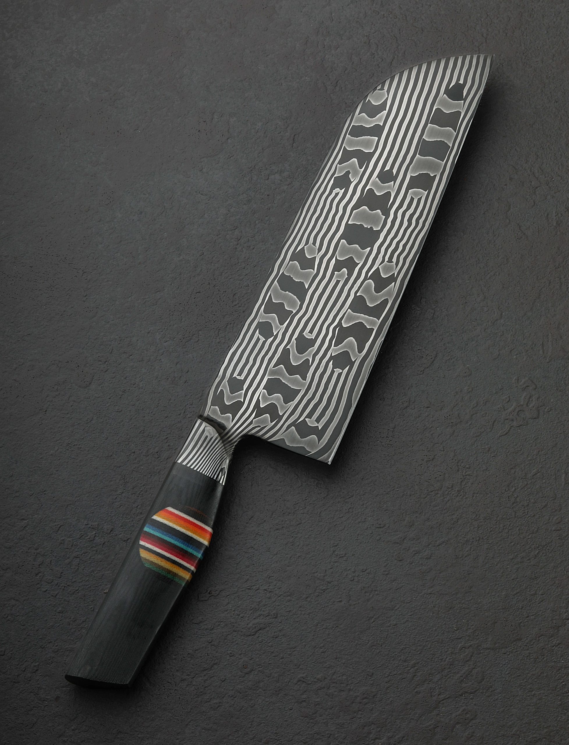 Real, or mirage? Don’t be deceived, to hold and to cut is to believe that steel plays the role of both abstract art and purposeful tool at once. In a mosaic carbon damascus steel pattern conceived of in Vermont’s far north by bladesmith Nick Anger and brought to life for the creation of a singular chef’s blade, lines run contrary to expectations, shapes shift and skew in the face of logic, and colors pop where none ought to exist. To be, or not to be, is perhaps the question this head-turning tool has come to ask us. Quick, light, and nimble in the hand, the tall, hardworking, santoku-inspired blade enjoys compound ‘S-grind’ symmetrical bevel geometry, a 70mm-tall heel with an edge profile that can rock on the board while push-pull cutting vegetables with similar efficacy to a cleaver, and a touch of lateral flexibility in the forward half. Balancing just at the blade’s choil, the knife is steady in the hand and not excessively heavy for its size at 9.6oz / 272g. Further securing the object’s place in contemporary cutlery’s colorful moment in time, as if emerging from a crevice to breathe the kitchen’s aromas, a rainbow disc of micarta is inlaid into a comfortable, ergonomic handle sculpted in organic Western form from a block of black micarta, one with grain that seems the resin-and-fabric extension of the steel’s multitude of layers.