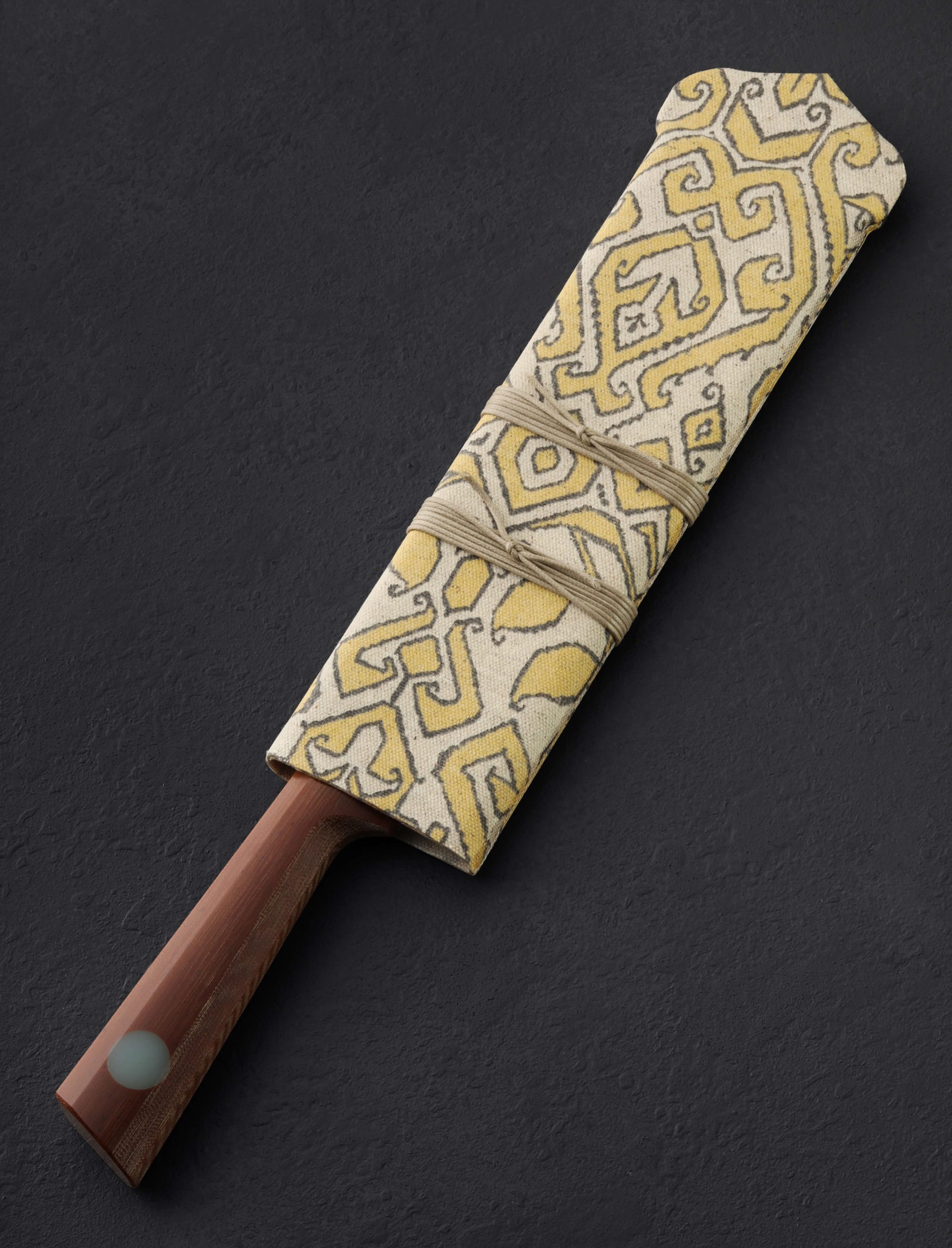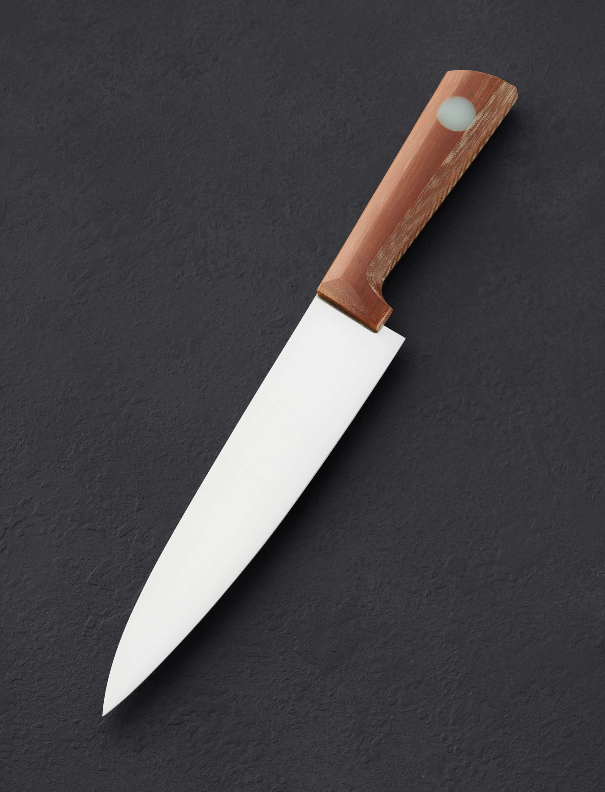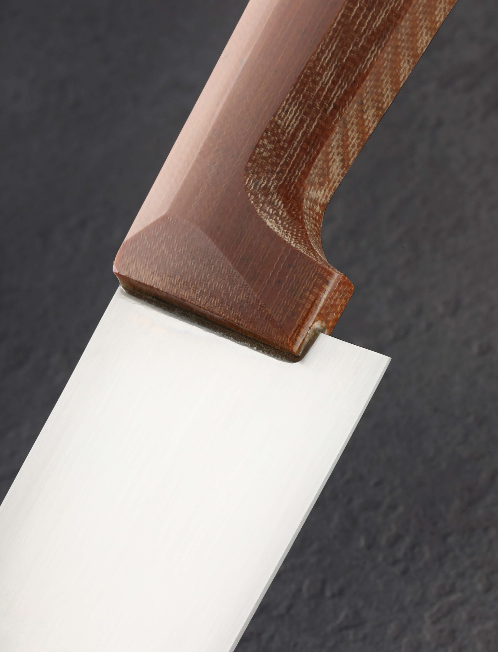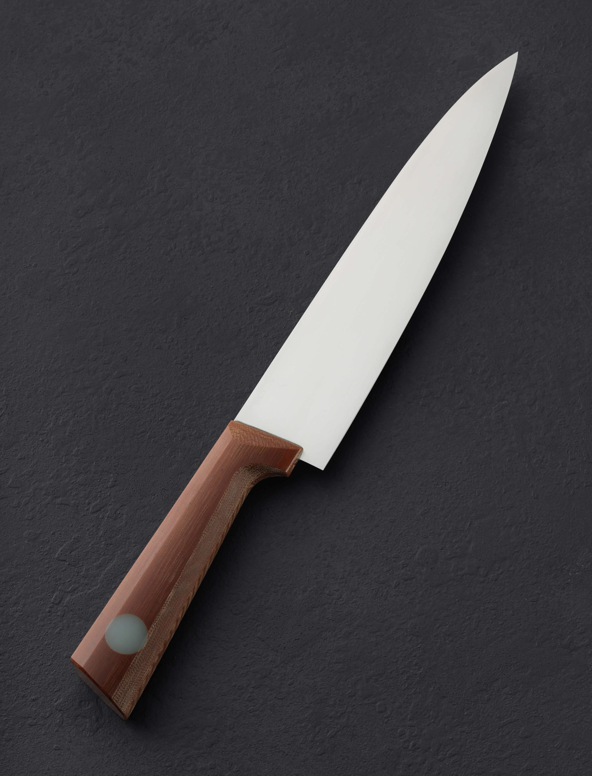 The largest Alsace style French chef knife by Don Carlos Andrade to date, this is The Big Alsace, designed to fill the hand with sheer cutting power. At 236mm / 9.3″, Don delivers a full-size blade shaped from high-performance RWL-34 stainless steel created by Damasteel in Söderfors, Sweden, built to tackle the largest cuts and most demanding daily kitchen work. Versatile, balanced, tough, and sharp, the silky, satin-finished blade’s bevel geometry is convex and pronounced, combining strength with a fine, razor-sharp edge that begins at a 50mm tall heel. As expected from Don, a nicely rounded, high-polished blade spine tapers steadily from a robust 3.6mm out of the handle to 2.7mm at the mid-point and onward to just 1.4mm an inch from the tip. The knife balances at the point that handle turns to steel, giving this large tool a weighted, capable, and steady feel on the cutting board. For comfort and control, inspired by Alsace knife handles of centuries past and brought to life by Don, a trained chef himself, with elements from his well-loved, shield-style wa form, vintage canvas micarta is sculpted with superb attention to detail and capped with this talented artist’s trademark, round inlays of translucent green G10. A cloth-covered saya is included.