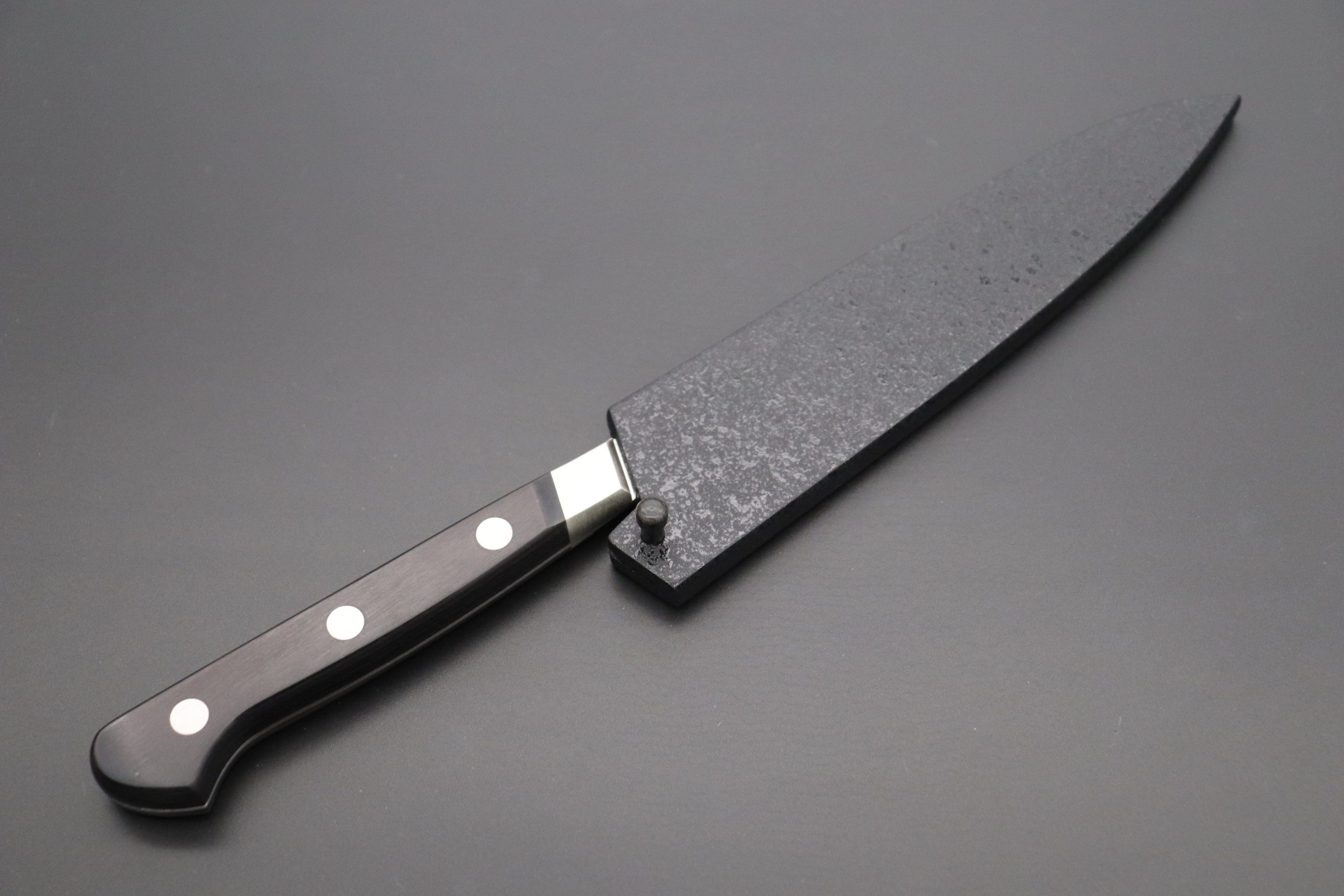 The Misono UX10 Series knives are one of the highest-quality professional stainless steel kitchen knives on the market and they feature a stylish, well balanced, slanted Nickel Silver bolster. This particular handcrafted Magnolia Wooden Saya has been specially customized to seamlessly fit the and . It offers the best-possible fit for the UX10 No.732 Petty 130mm and it is therefore the Saya we recommend for these knives.