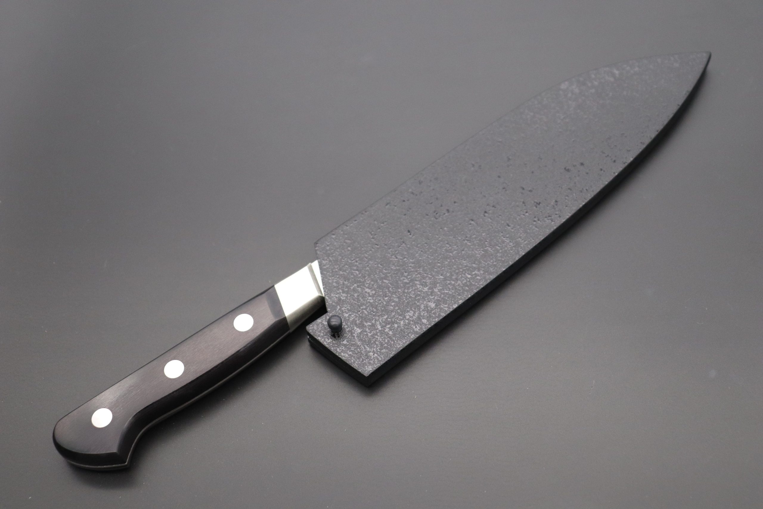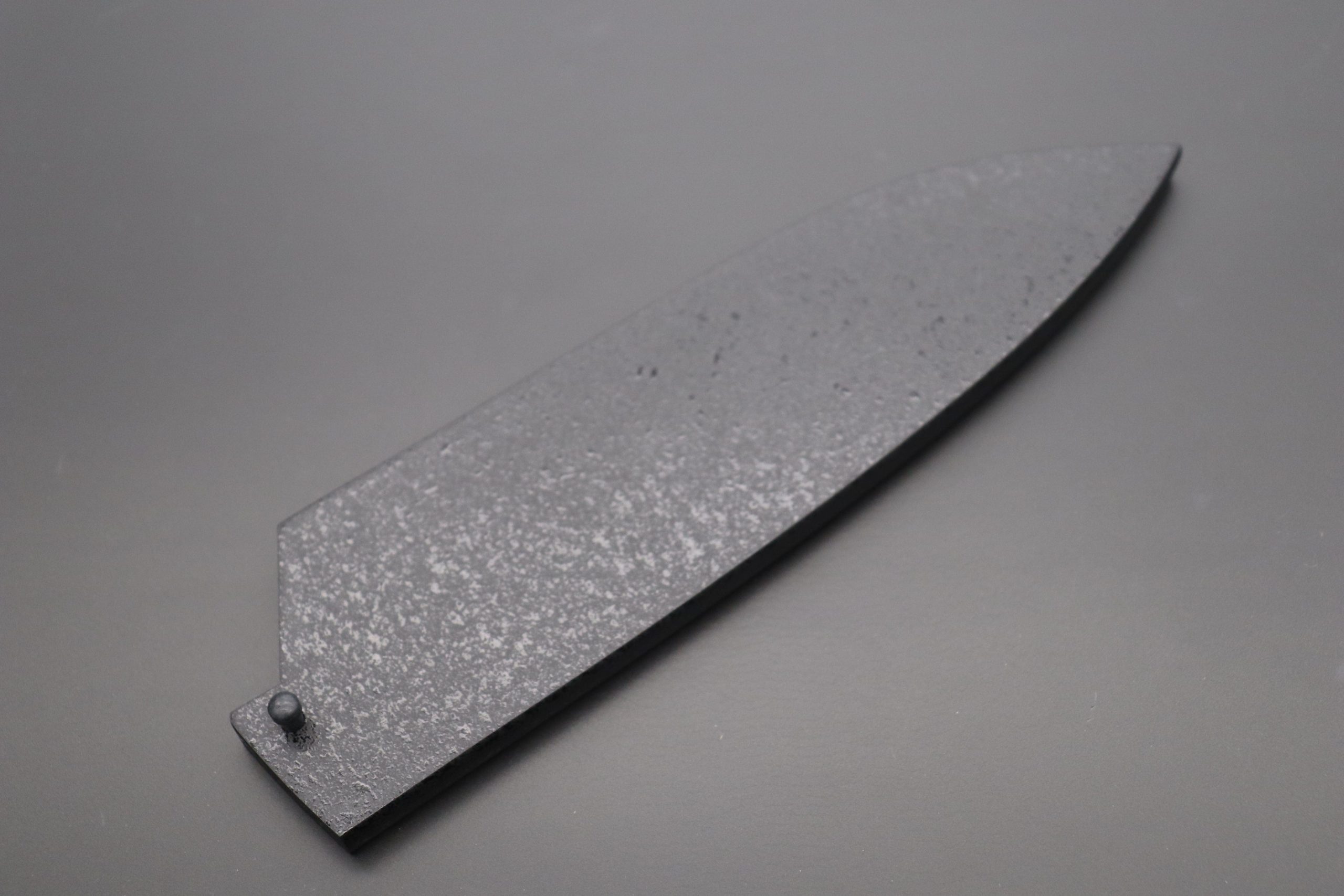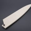 This Saya is made of Magnolia wood and has a decorative Black Lacquered finish that beautifully matches Black or Dark-colored wooden handles. Many Japanese knife makers use Black Pakka Wood for the handle scales of their Western-style Kitchen Knives, and these knives look very neat and stylish with a Black Lacquered Saya.