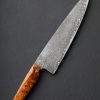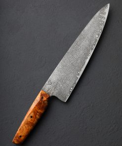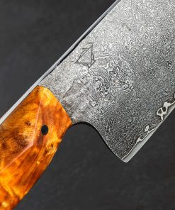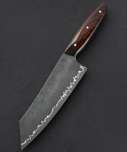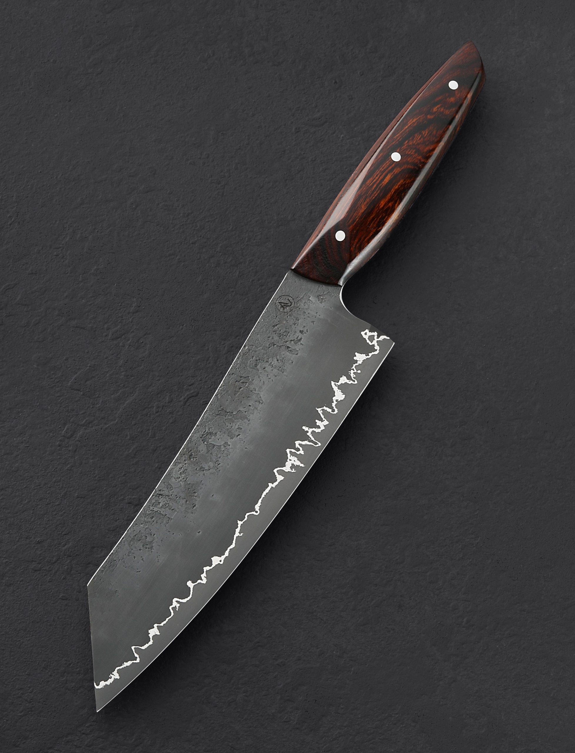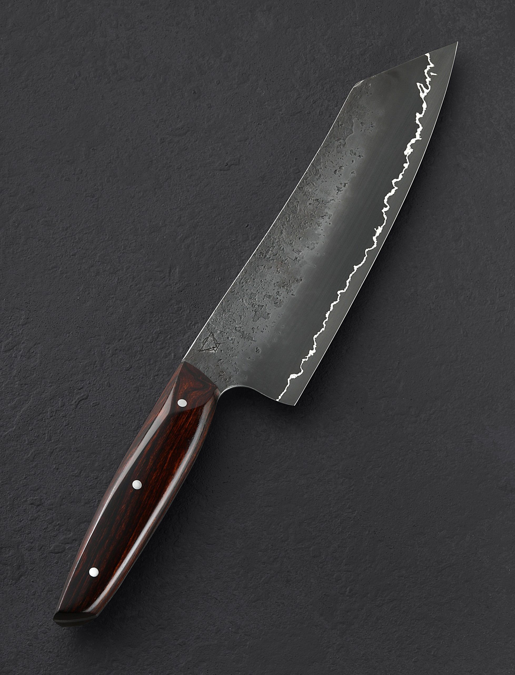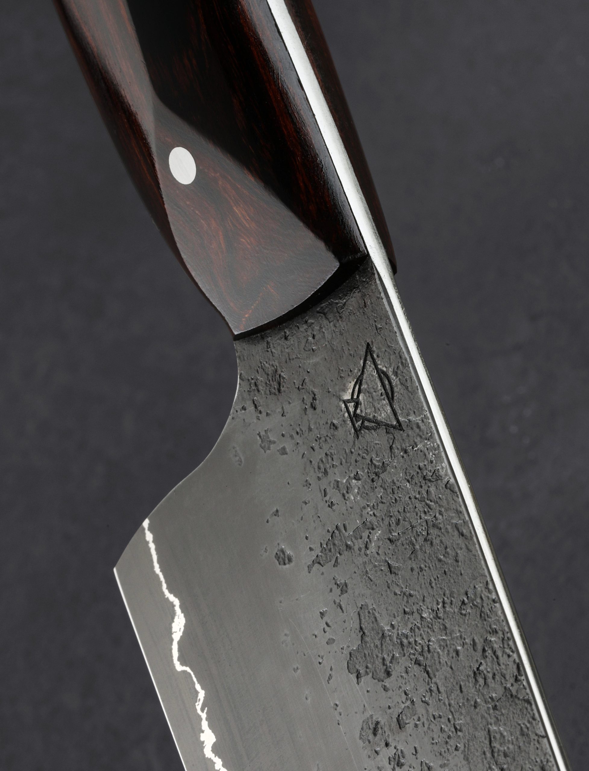A story from Abe about this outstanding knife. A few months ago, our founder Abe Shaw visited bladesmith Tobias Hangler at his shop in Austria, and what a visit it was. Together, Tobi and Abe created a billet of five-layer blade material including a core of ApexUltra, the new high-performance cutlery steel that Tobi helped develop from the ground up, they added a layer of pure nickel to prevent carbon diffusion, and outer cladding of 80crv2 carbon steel. From this billet, Abe made a knife, Abe and Tobi collaborated on a knife, and the third knife, this knife, was crafted solely by Tobias to be offered here at Eatingtools. So, without further ado, we present the Black Nickel Bunka, featuring Tobi’s superb geometry and balance, including a very thin, very hard, and very sharp ApexUltra high carbon edge, an even thinner, needle-like tip, and convex bevels from the rounded, 55mm-tall heel forward for toughness and cutting performance. Dressed in beautiful desert ironwood, the handle is sculpted simply and thoughtfully, with comfort and ergonomics above all. For all manner of daily meal prep, this is not just a knife with a story, it is a tool for the hardworking chef.