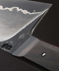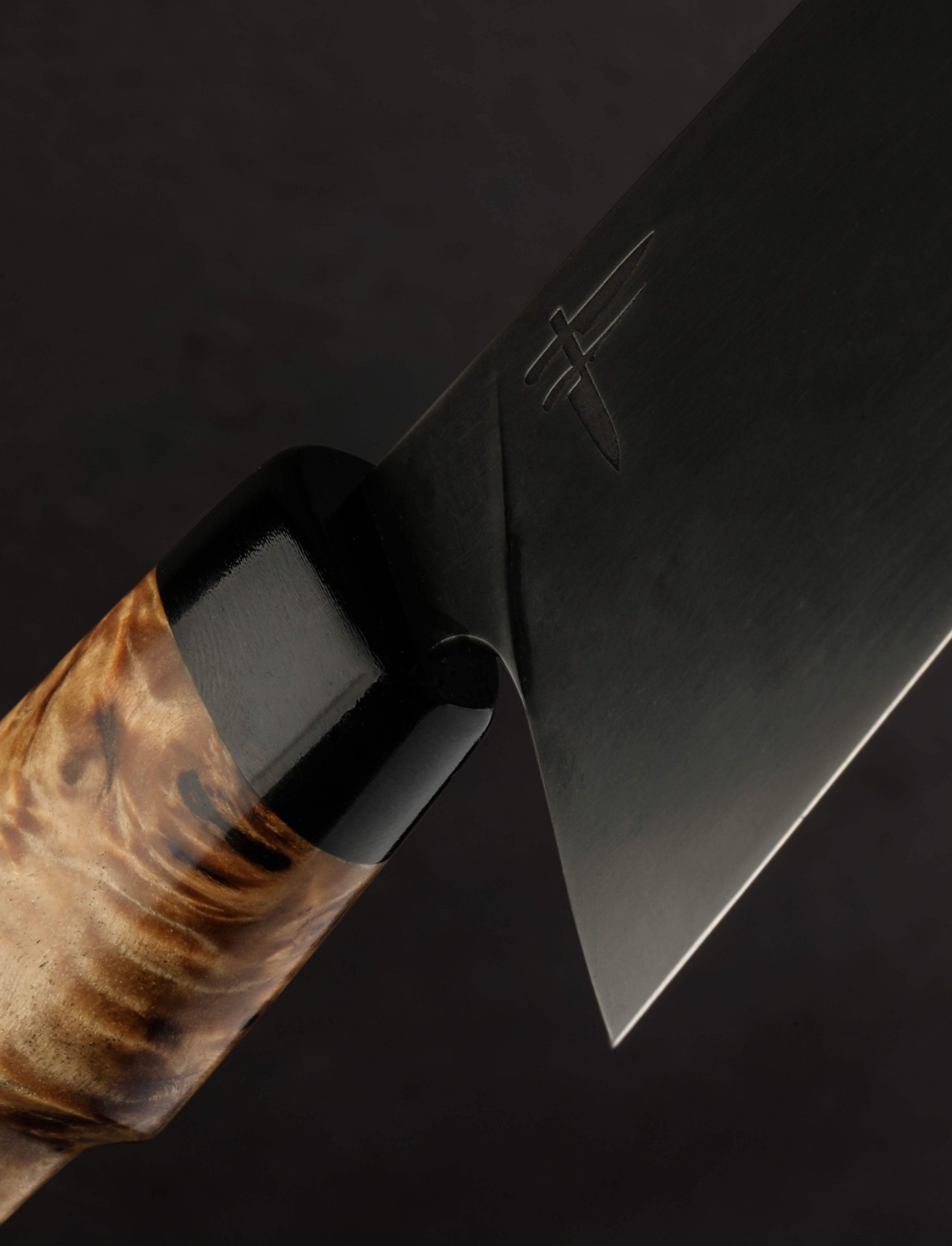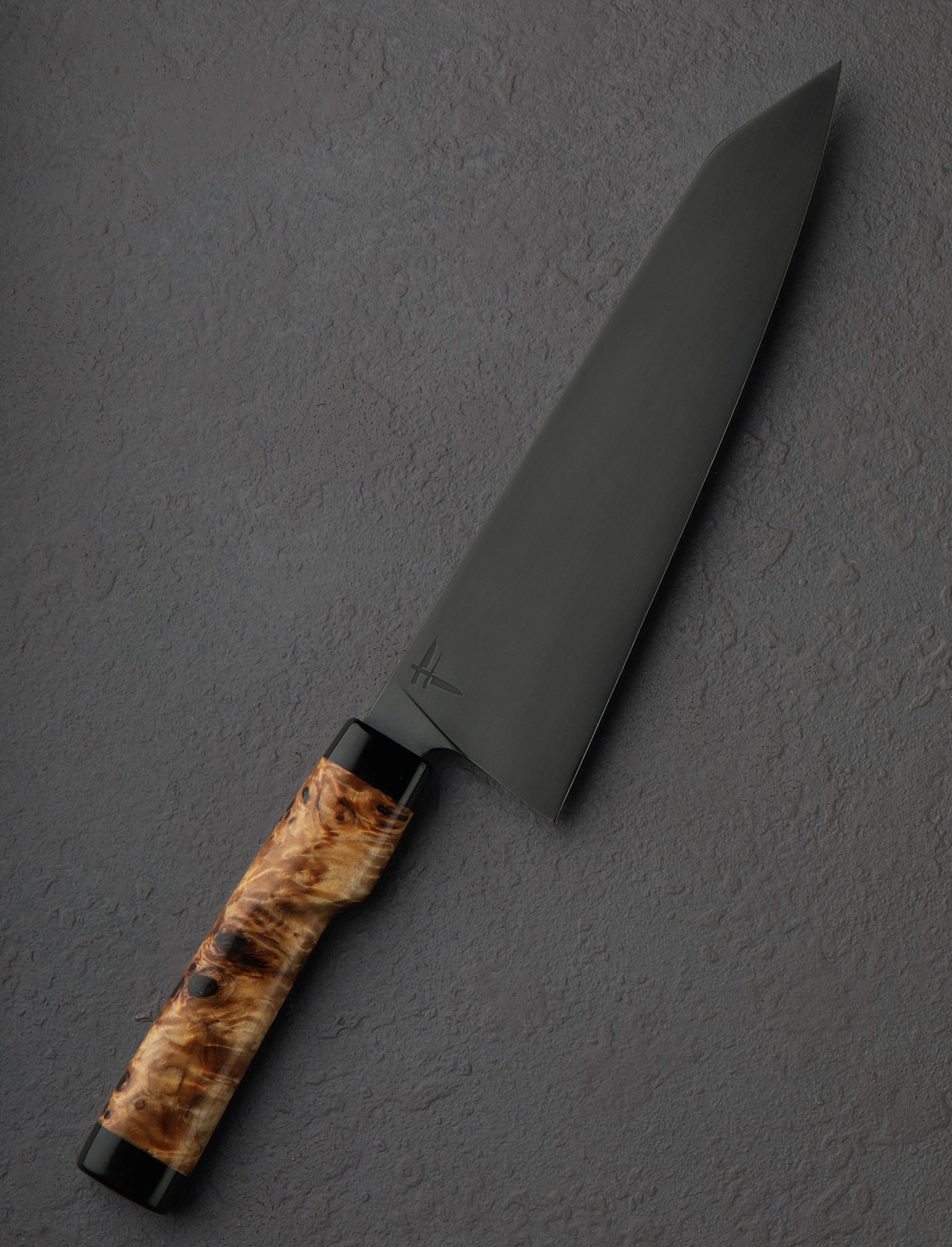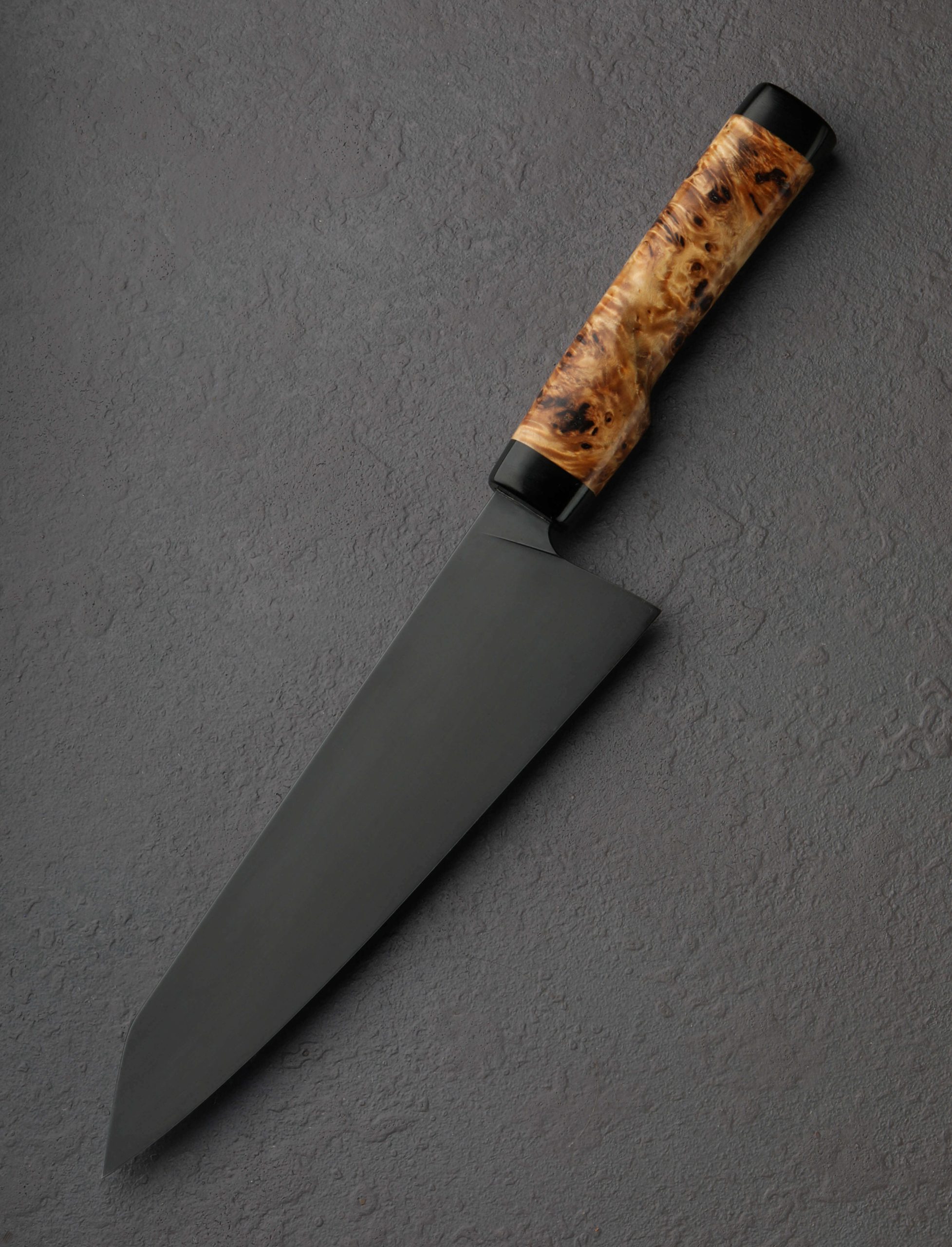 Quick and nimble in the hand, its head turning, all-business blade shaped from 30Crv2 high carbon steel, comes a 202mm / 8″ chef knife by Fingal Ferguson. At his studio in Ireland’s south-west, not far from Cork on the Gubbeen Family Farm, Fingal gives this full-size workhorse blade wonderful balance, slim and hard at the edge, with tall bevels, an aggressive tip, and versatile profile for chopping and slicing tasks alike, in a package that weighs just 5.9oz / 168g overall. The dark, forced-patina finish gives the tool not only added protection from oxidation during use, but a blackened, moody aesthetic we’re drawn to. For comfort and control in Fingal’s well-loved form is a handle sculpted from gorgeous poplar burl with front and rear end caps of black G10, all secured using a Loveless style stainless steel retention bolt.