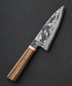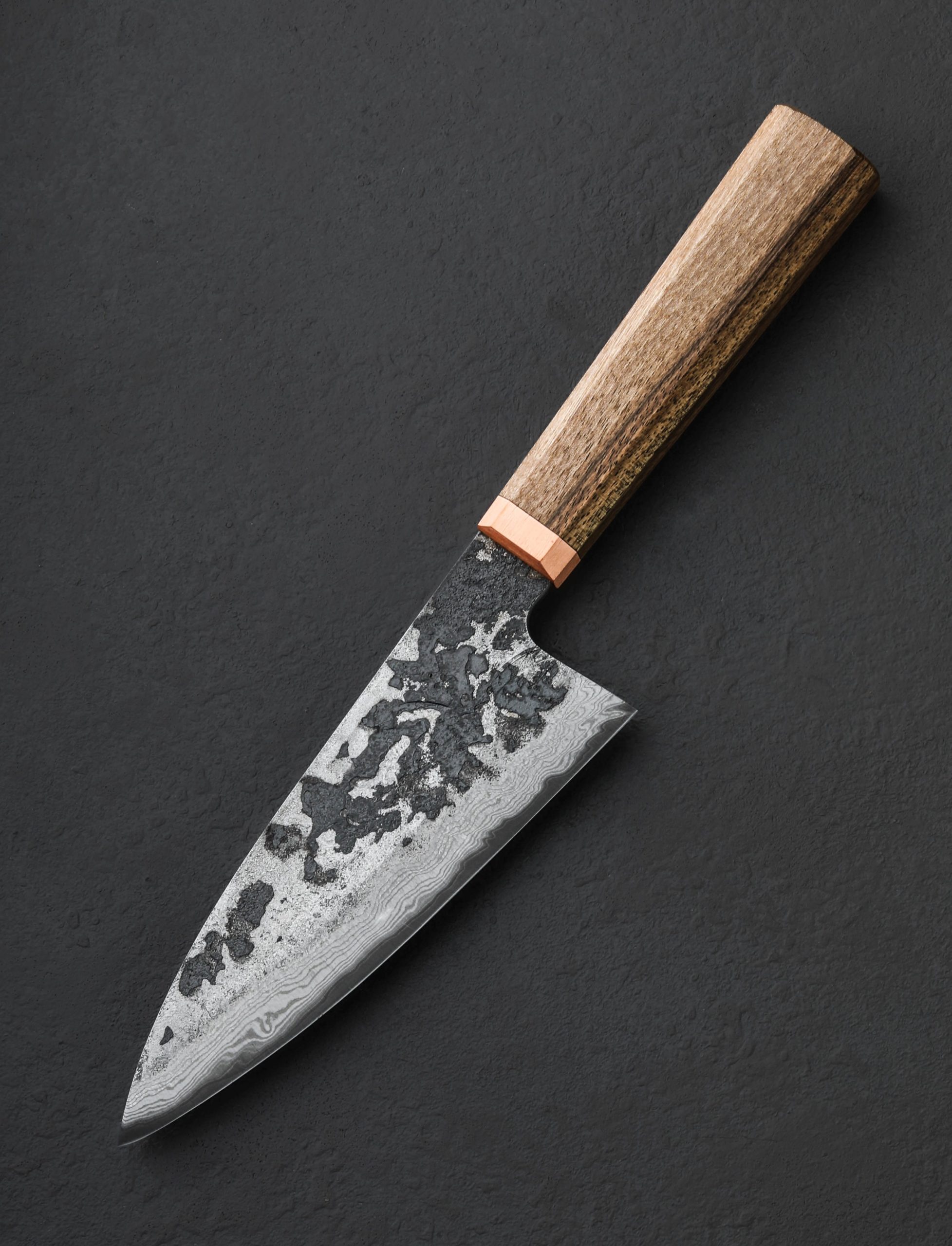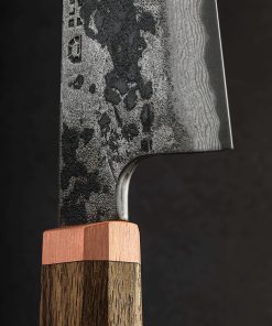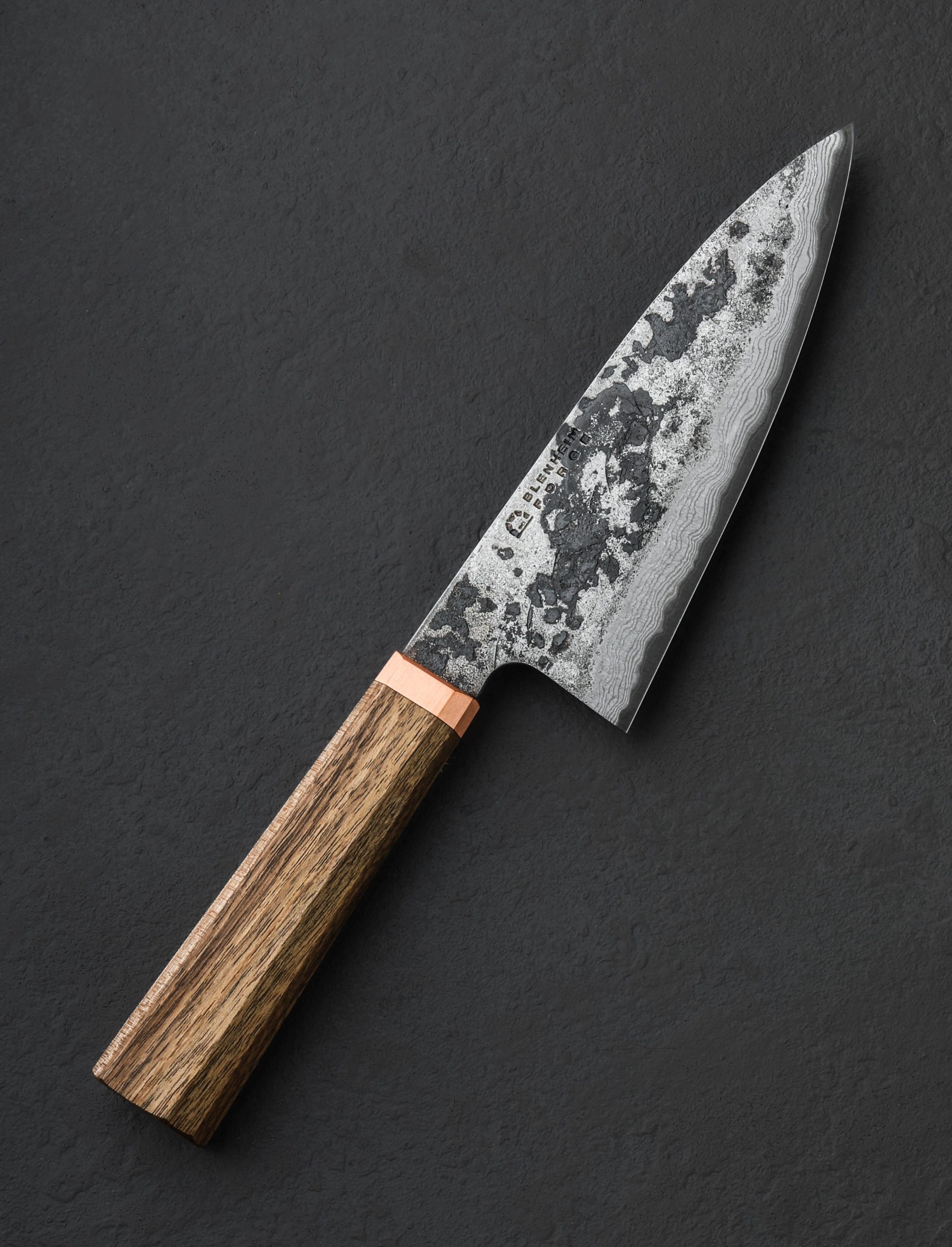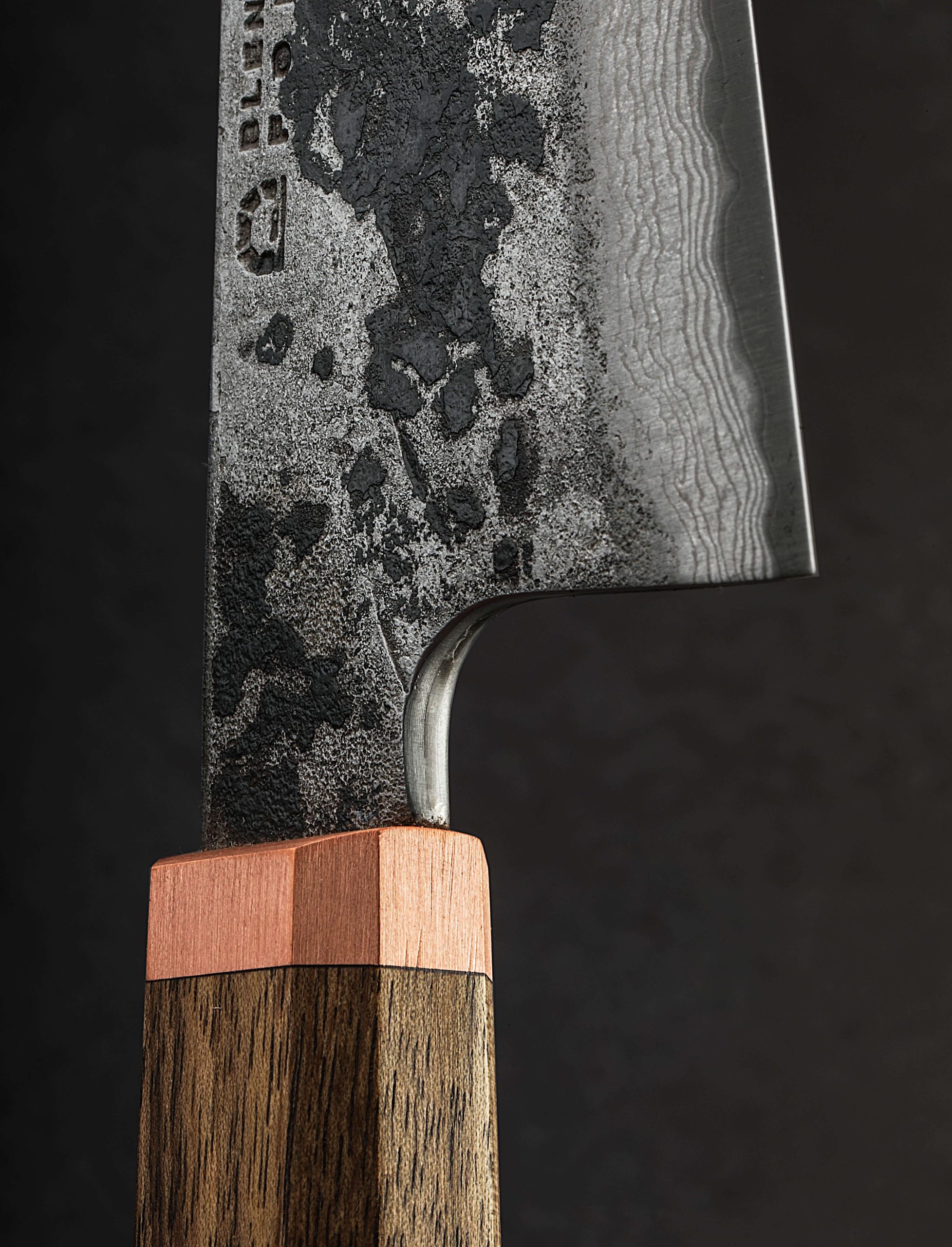 The latest addition to Blenheim Forge’s Classic collection of hand-forged kitchen cutlery is the ever-versatile, hardworking deba in Blenheim’s well-loved san mai steel formula. Symmetrical bevel geometry, a tough, sharp high-carbon steel edge, and stiff, thick spine produce a blade that will excel at a wide variety of cuts. Traditionally a Japanese fish knife with the power to move through skin and bone with stability and precision, this new Deba from Blenheim’s South London workshop is suited for right and left handed chefs and features a comfortable, tactile grip of walnut wood with solid copper. The three layer steel formula’s outer cladding shows the layers of its suminagashi layering, with hammer marks visible through the flats above, and a dark edge of Aogami Blue No.2 steel.