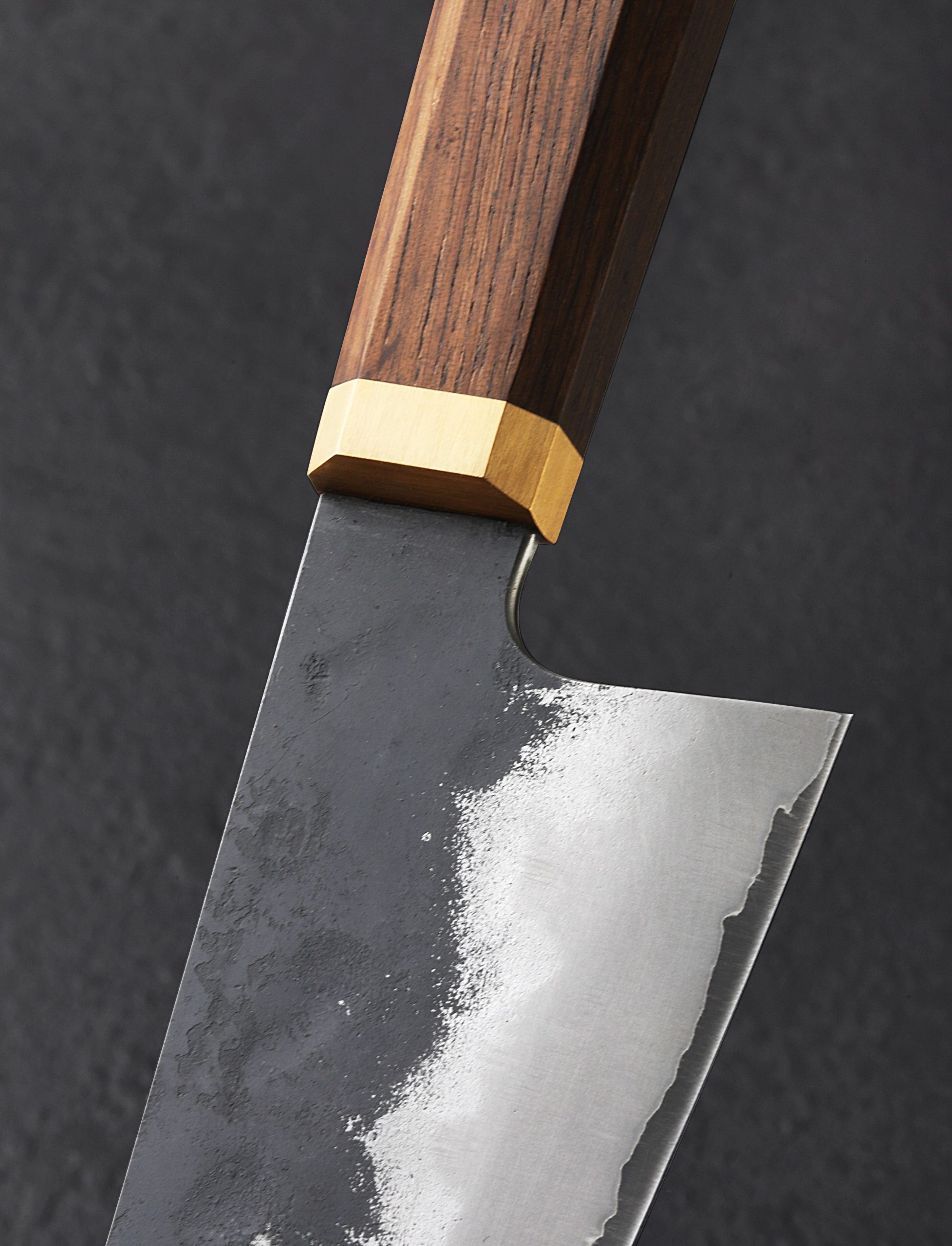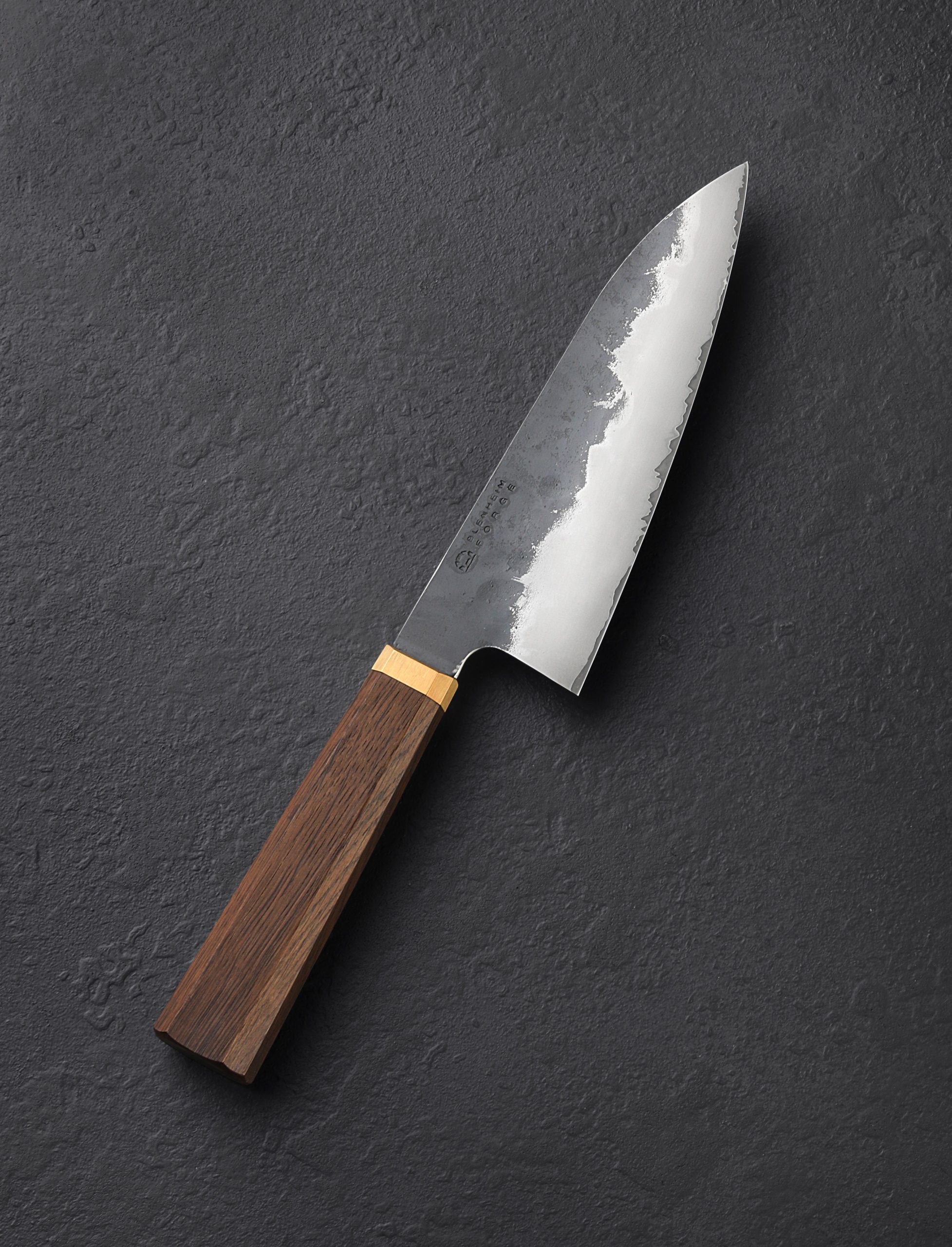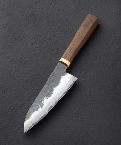 From the Blenheim Forge Stainless Clad collection, a tall, versatile funayuki chef’s knife with Aogami Blue carbon steel cutting edge below a thin layer of pure nickel. The blade profile, with low, slim tip combined with the ability to rock well on the board in a compact 170mm / 6.7″ size, was originally designed as a multi-purpose knife for use on fishing boats, resulting in an outstanding go-to knife for a wide variety of daily meal prep. The fumed oak handle with solid brass ferrule in octagonal, wa style, is just the right length for any preferred grip, and is finished beautifully, comfortable and rounded at the edges.
