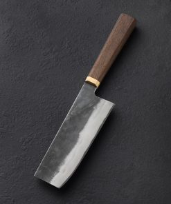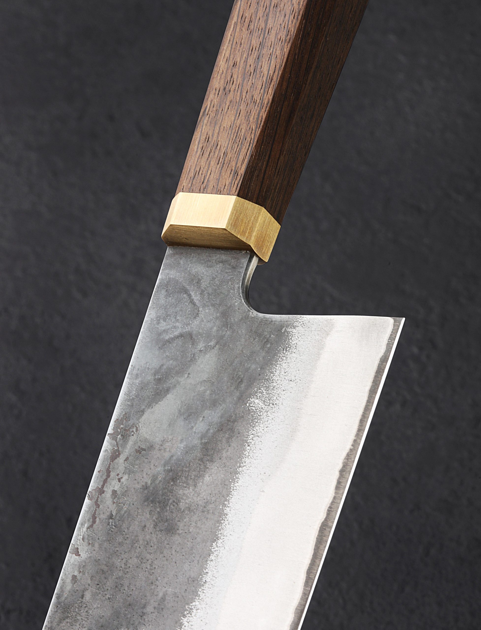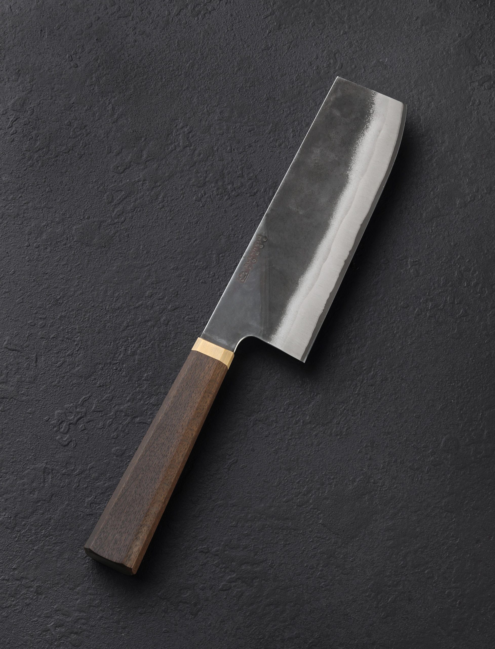 The newest addition to Blenheim Forge’s Stainless-clad chef knife collection is this hand-forged, 165mm / 6.5″ nakiri. A classic Japanese vegetable knife, and one of the most popular all-around knife styles in any kitchen, the nakiri features a relatively straight edge, tall profile, and flat front, designed for efficient vegetable chopping on the cutting board. The edge is thin, hard, and razor-sharp, formed from Aogami Blue Super carbon steel, and clad in jackets of stainless steel, un-reactive for easy case, with a beautiful forged finish. The handle is comfortable and elegant, the fumed oak tapering toward the solid brass ferrule in octagonal figure. An efficient and rewarding tool for home and working kitchens alike.