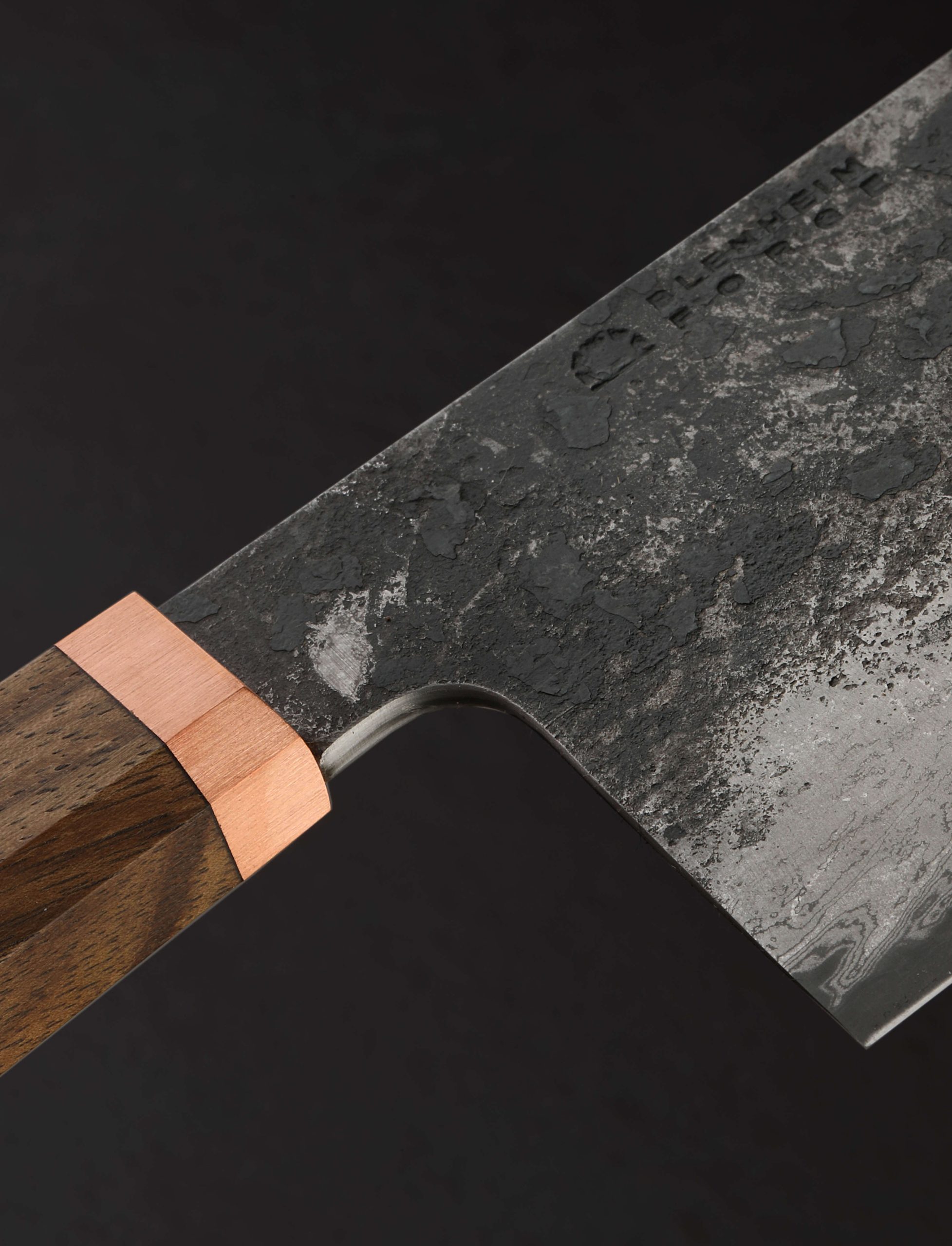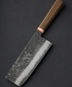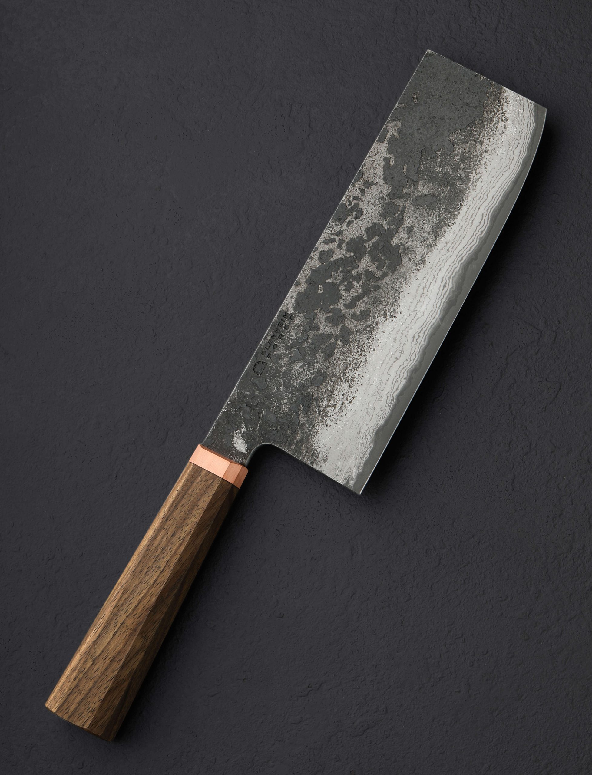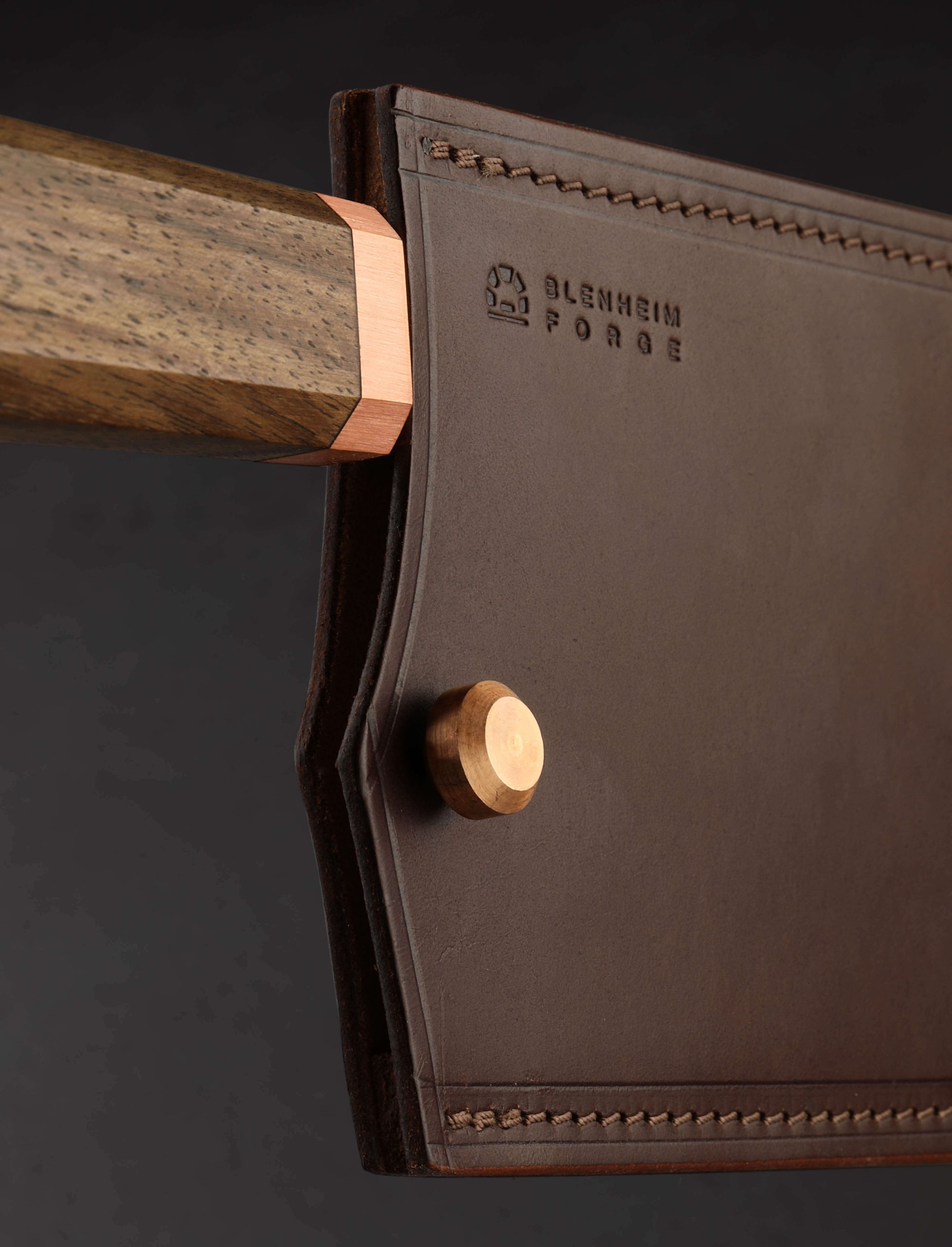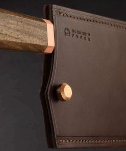 This 2024 Special Edition release is an XL version of Blenheim Forge’s classic nakiri vegetable knife, forged by hand in Peckham, South London and delivered with a custom leather saya. The Japanese Aogami Blue paper san mai steel blade stands an impressive 72mm tall, positioning the profile between that of a typical nakiri and its larger cousin, the chef’s Chinese Cleaver. With its thin, razor-sharp edge and the weight and steadiness that come from the overall size and mass of this beautiful tool, the Blenheim Forge team has created a knife that will move effortlessly through ingredients small or large (or extra-large). Dark, forge-finished flats show the hammer marks of the object’s hand-hammered origins, with the alternating layers of the steel’s sumingashi cladding. The handle, true to Blenheim’s recognizable and comfortable style, is sculpted from walnut wood which tapers gently from back to front in octagonal form, culminating at a brush-finished copper ferrule.