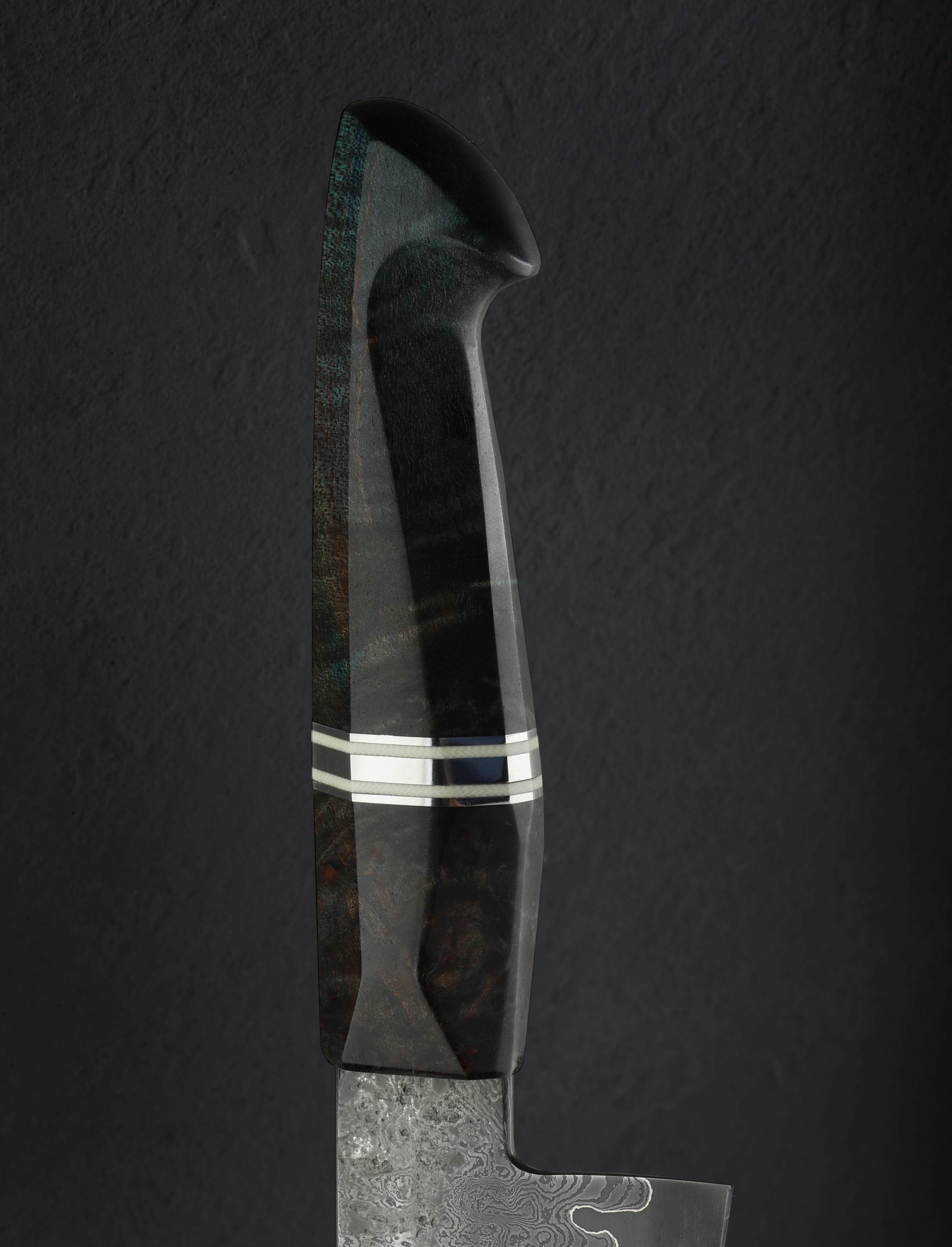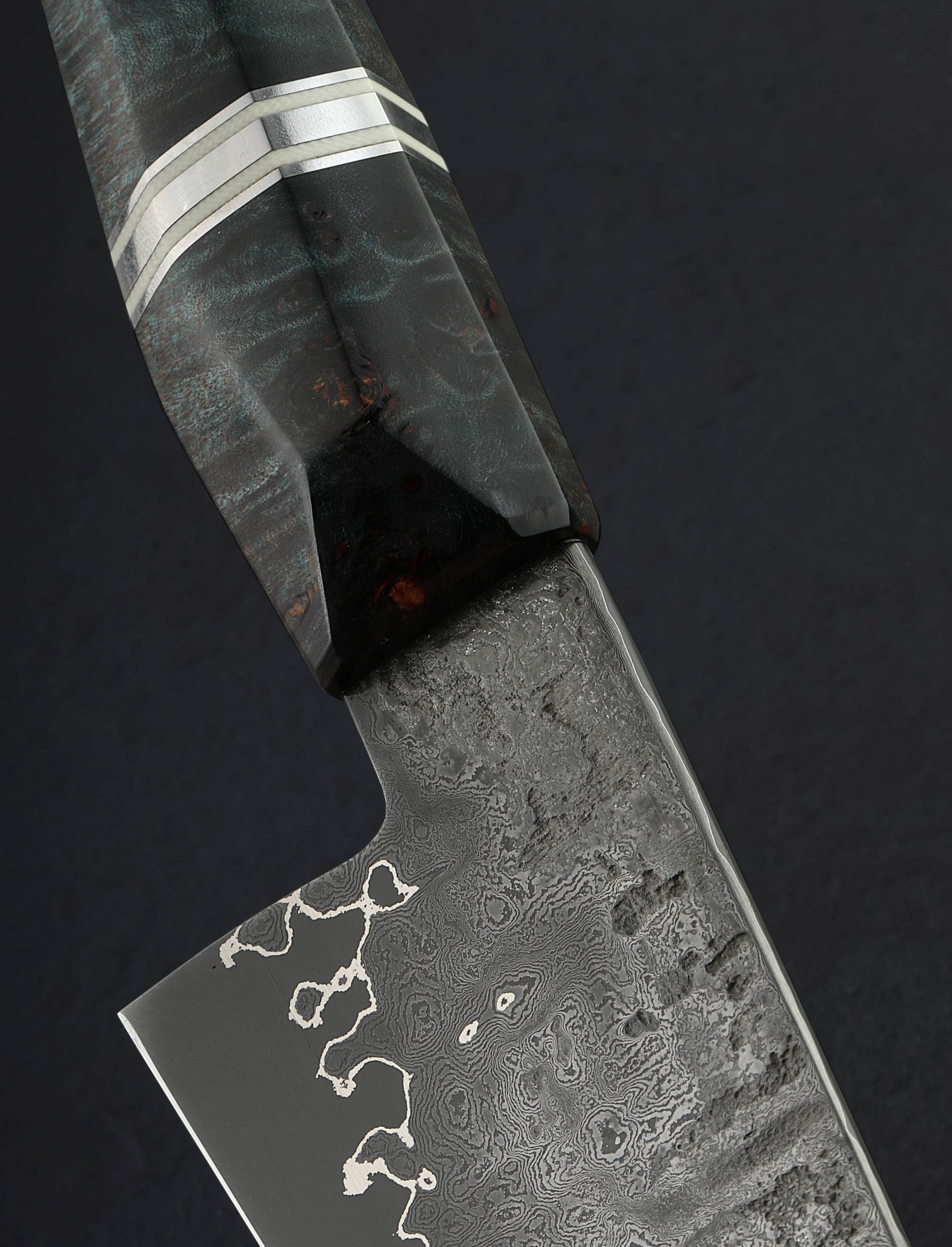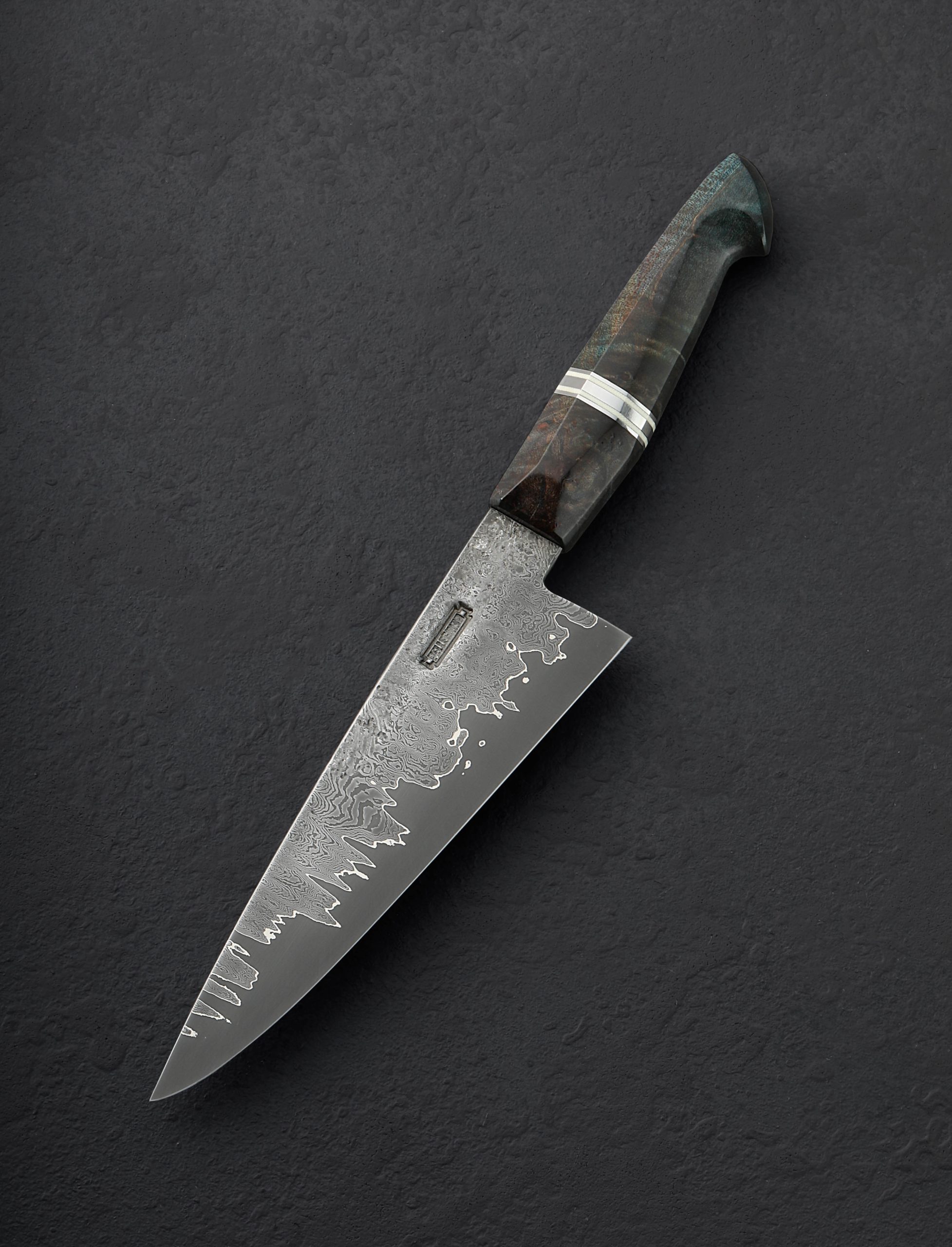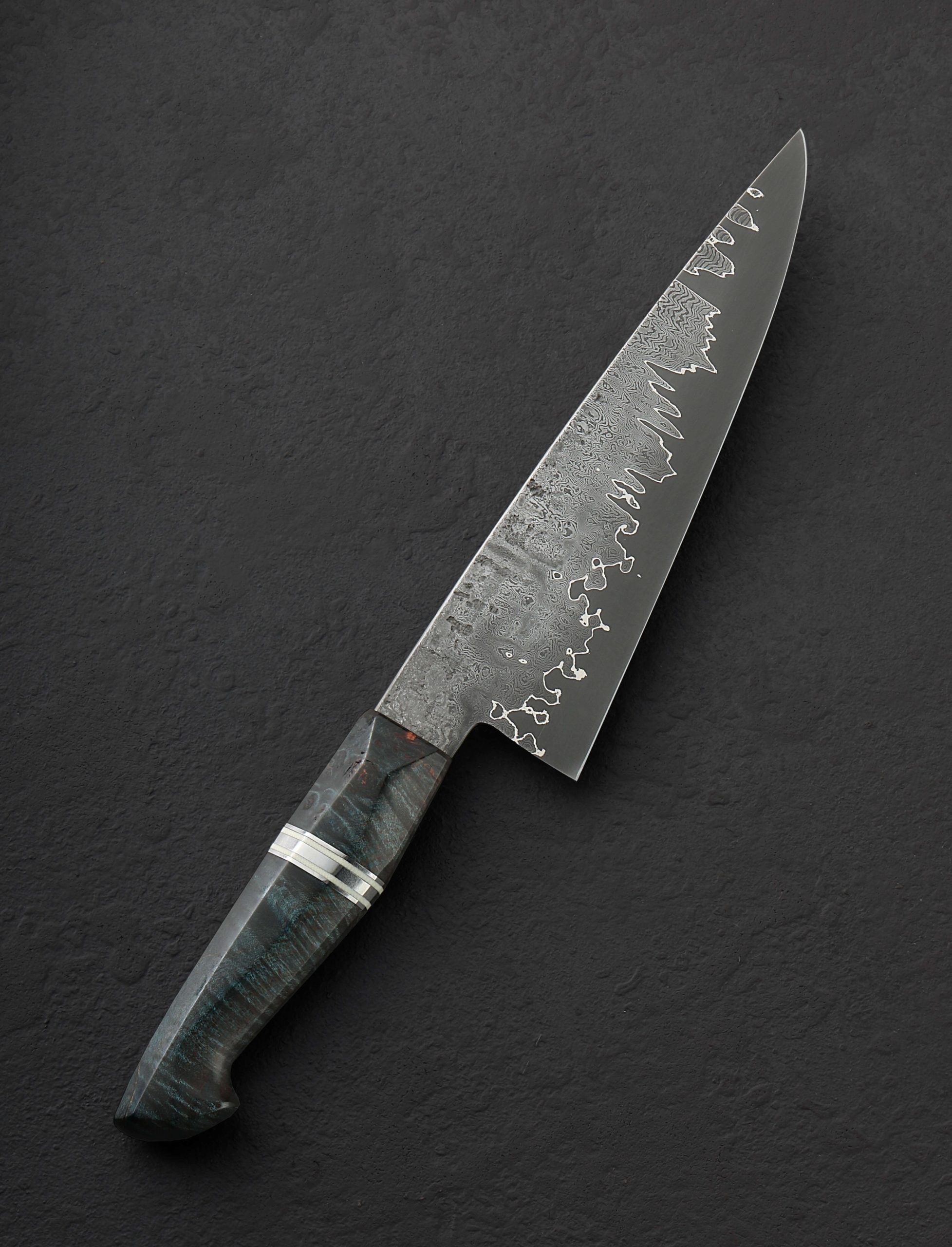 Philadelphia bladesmith Steve Pellegrino forges 45-layer twist pattern damascus and a vein of pure nickel over a core of 52100 carbon steel to complete the blade of this handsome and versatile petty chef knife. At 175mm / 6.9″ long with a 52mm heel and upswept profile, incredibly slim, needle-like tip, and very thin edge, this tool will be a joy to use for all manner of daily kitchen prep, especially chopping tasks where a compact knife is desired, as well as detail work and precision slicing. The rounded spine is stiff and sturdy out of the handle, tapering, heavily in the final three inches to provide a dynamic and refined front end. For comfort and control, a blue dyed maple handle is sculpted into an elegant, hybrid form with facets and gentle edges at each transition which Steve has embellished with a polished stainless steel and white micarta spacers. A custom white oak saya is included.