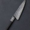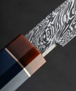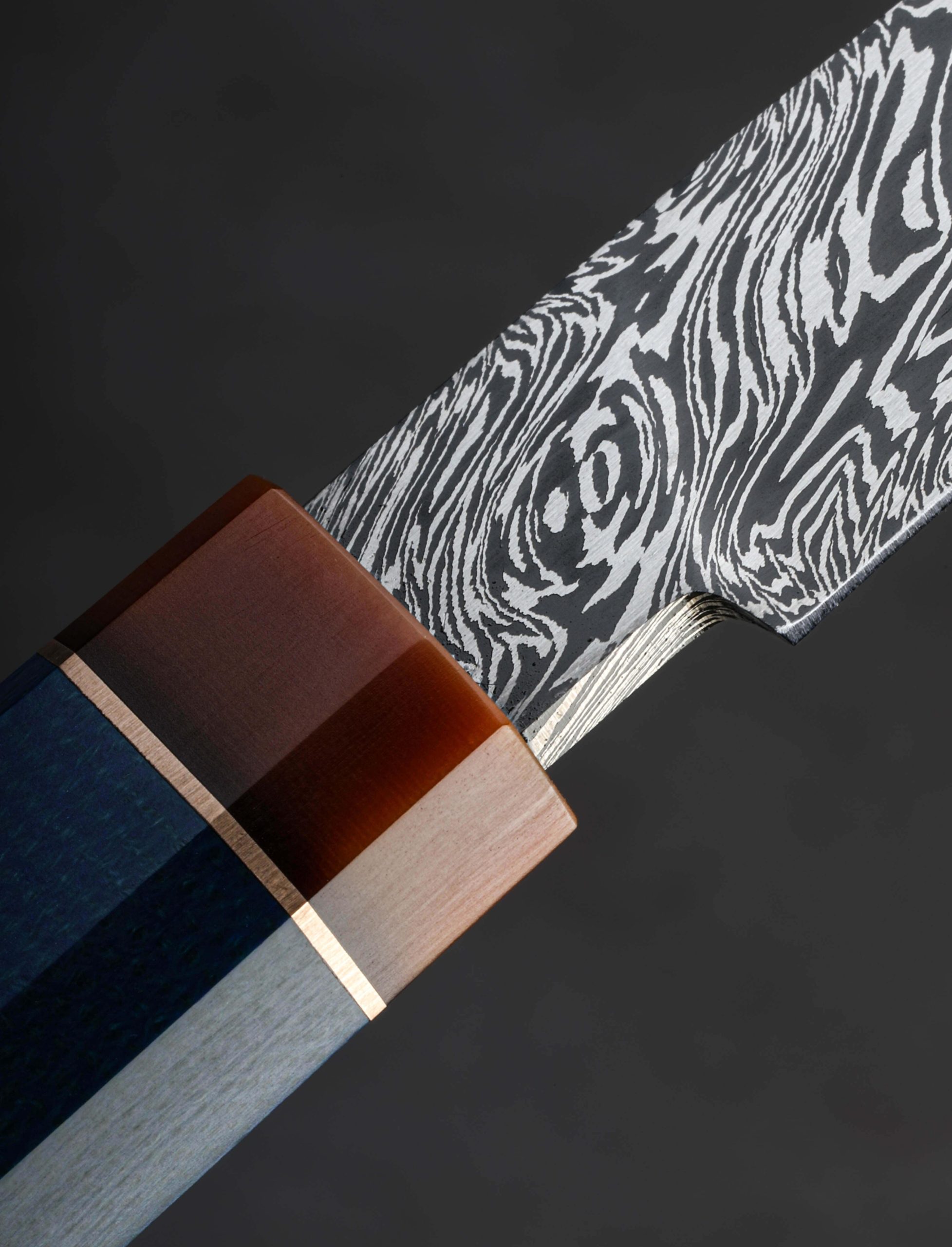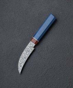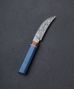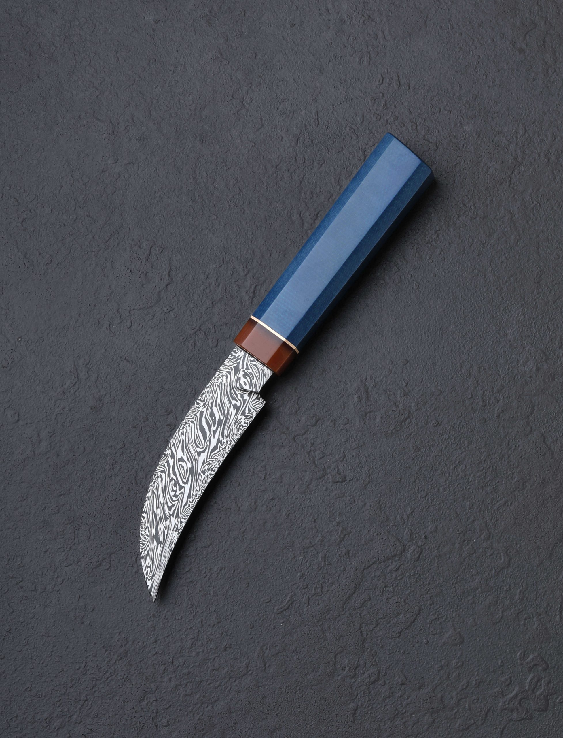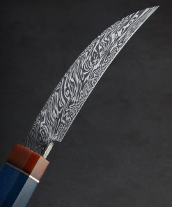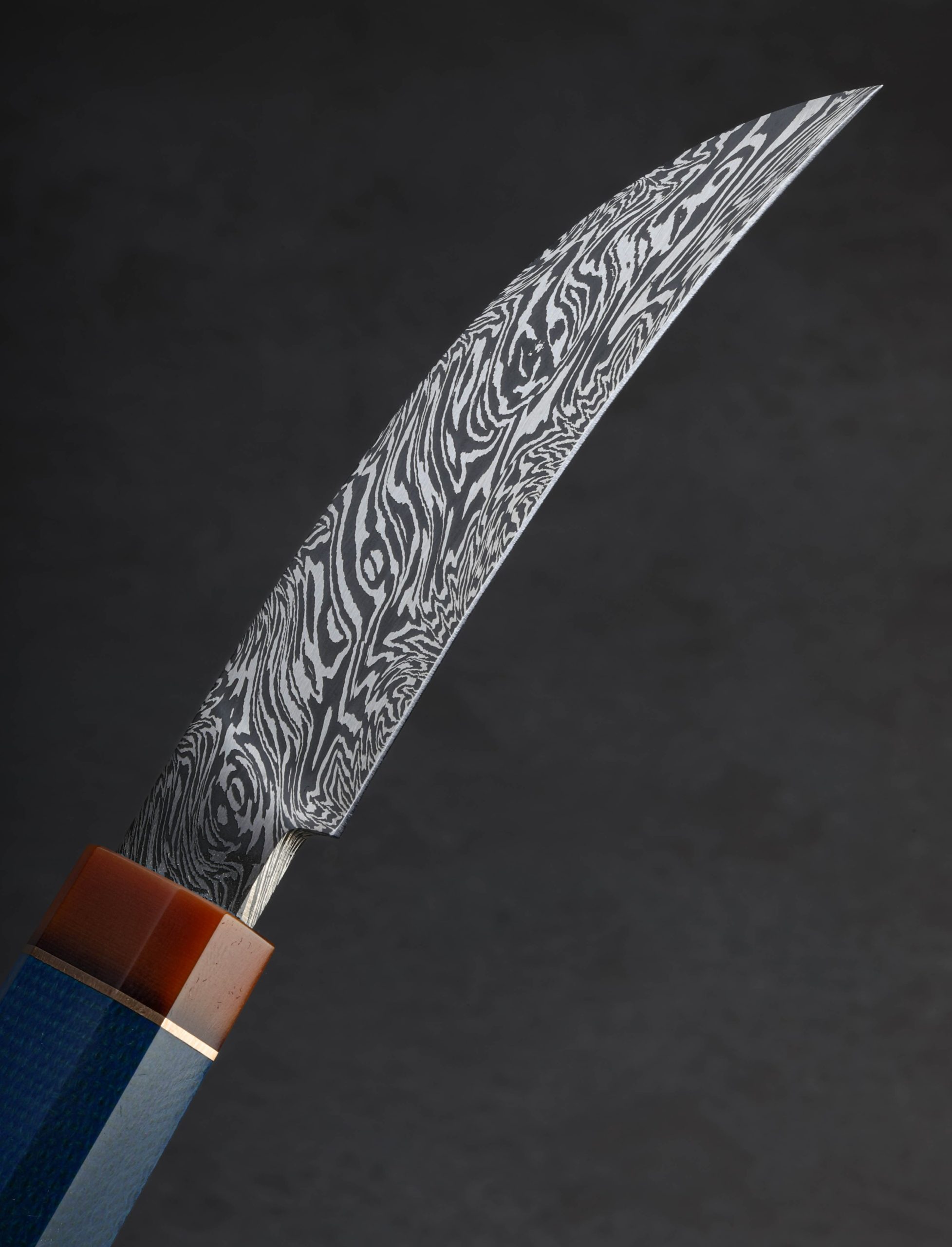 Forged from his house-made firestorm pattern damascus steel, created with two high-carbon alloys, CruForge-V and 15n20, Washington artist Salem Straub delivers a first: a chef’s tourné knife. Hard, thin, and razor-sharp along the recurved 95mm / 3.75″ edge, this large tourné, also called a bird’s beak paring knife, is the perfect tool for handheld work above the board, from paring and peeling vegetables to halving strawberries, eyeing potatoes, and more. The damascus pattern suits the blade shape beautifully, producing a striking, high-contrast aesthetic that Salem pairs with a boldly styled, octagonal wa handle. The bolster is shaped from vintage butterscotch micarta, meeting a ring of reclaimed and repurposed Zildjian cymbal bronze, followed by a piece of eye-catching and unique blue canvas and resin composite.