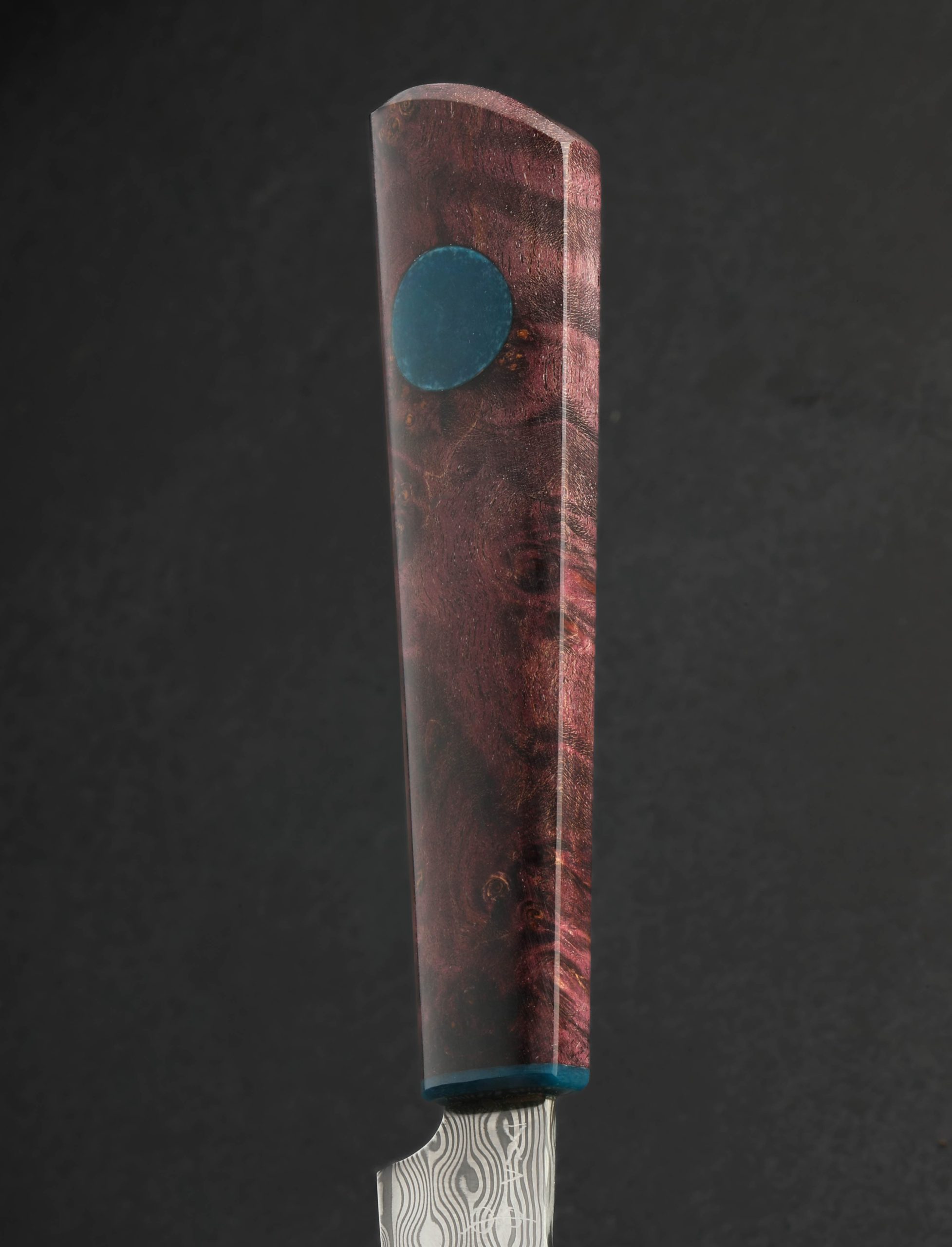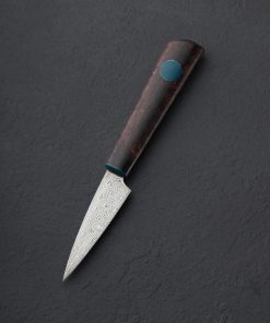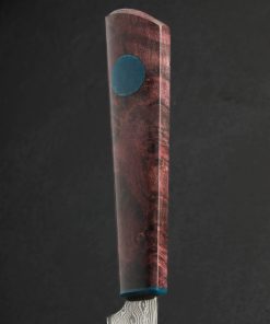 In Damasteel’s premium stainless damascus small-batch steel crafted in Sweden comes a one-of-a-kind Don Carlos Andrade paring knife built by Don’s hands at his studio in California. This iconic model of this long-time Eatingtools artist has been gracing the pages of our collection for a decade, yet Don only crafts a handful a year in the well-loved form seen here. In the low-maintenance, high-performance stainless damascus is a slim, razor-sharp, precision blade designed for handheld peeling and carving work above the board, delicate slices, and detail cuts of all variety. A rounded blade spine tapers steadily to a fine tip, with expertly honed convex bevel geometry throughout. In a combination of materials as handsome as any in Don’s always unique, always elegant style comes a handle sculpted from purple dyed and stabilized maple inlaid and capped with vintage Westinghouse blue-marbled glass epoxy micarta. The handle’s shape, Don’s wa-style rendition, tapers just so and fills the hand for comfort and control over every cut.