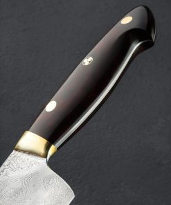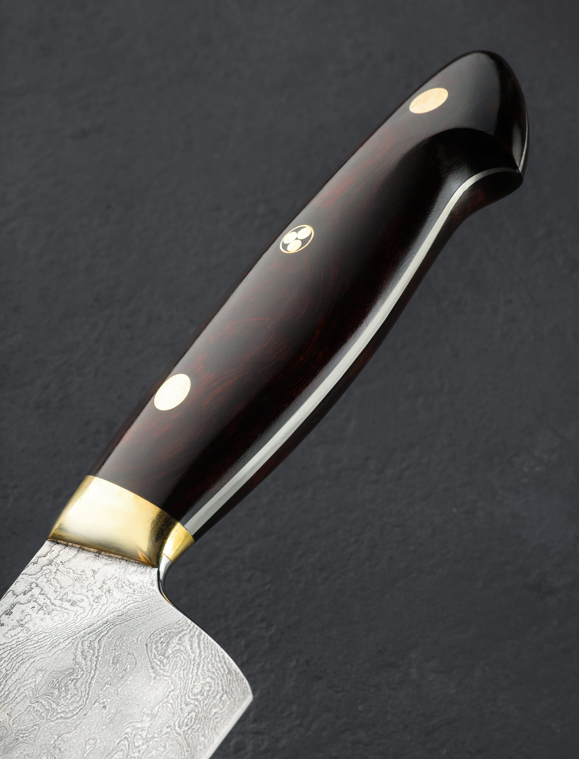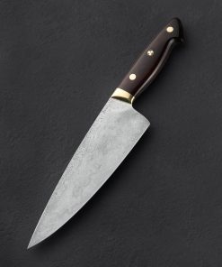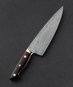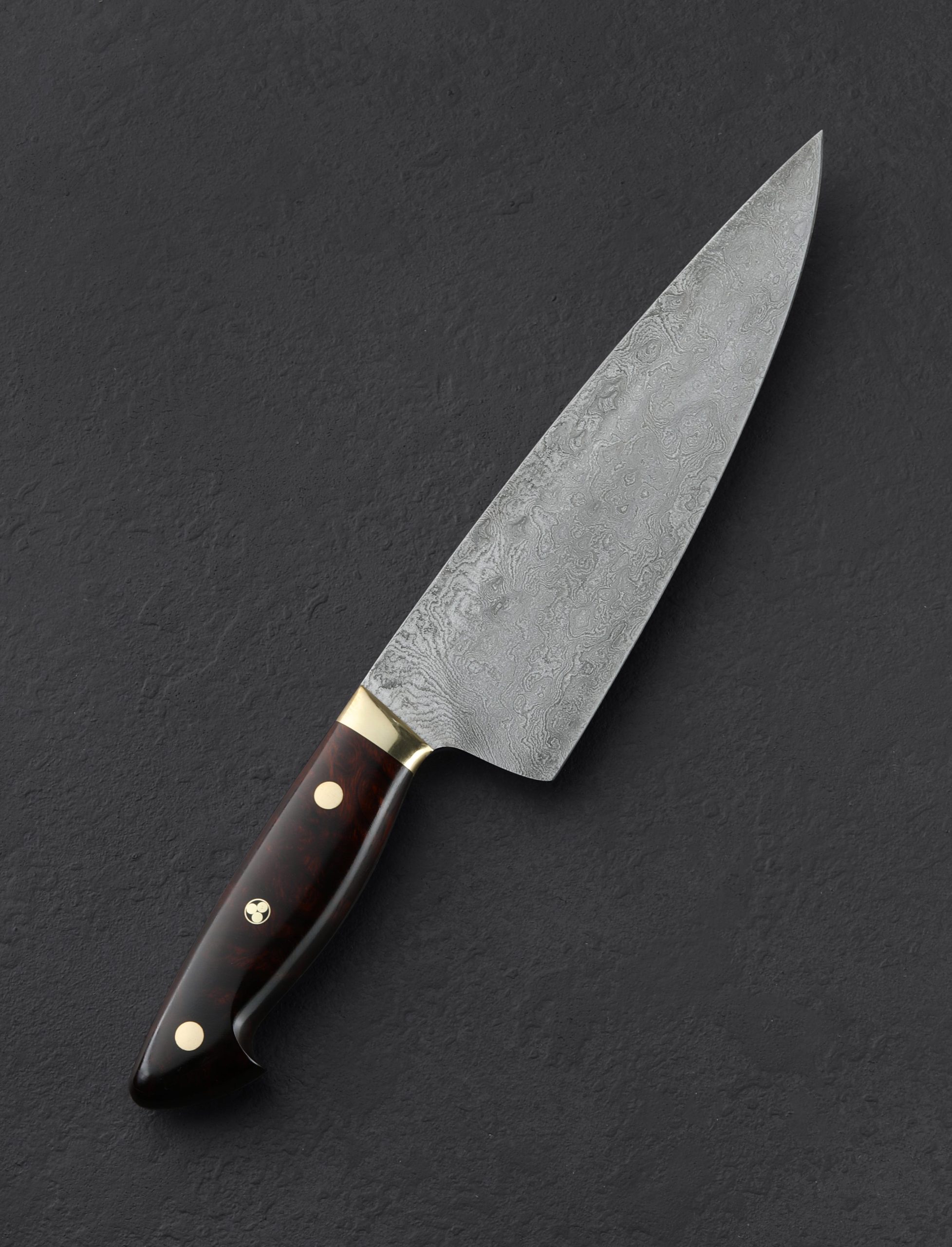Crafted by the man himself, bladesmith and damascus artist Bob Kramer of Washington, we present this rare opportunity to own a one-of-a-kind handmade damascus chef knife with exhibition-grade ironwood handle. Made in 2009, this knife has had one owner, was used lightly three times, was never sharpened, honed, or stropped, and was cleaned and polished by hand to ready it for this sale. Both blade and handle are in exceptional condition. As expected of Bob’s work, as a tool this incredible knife leaves nothing to want; tall, convex bevels culminate at a thin, hard, razor-sharp edge; a full-distal taper takes the spine down to a slim, pointed tip for detail work; a slight tough of lateral flexibility is present in the final inches of damascus; and spine and choil have been polished and rounded for comfort. For grip, in Bob’s recognizable style, and material combination, the stunning ironwood is matched to polished brass bolsters, two polished brass pins, and a single ‘Kramer’s mosaic pin in the center of the full-tang constructed handle.