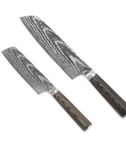 Lightweight and balanced, this Santoku set is specially designed for daily use. The two sizes make it easy to have the right knife handy and the hand-sharpened edges will make slicing simple.
