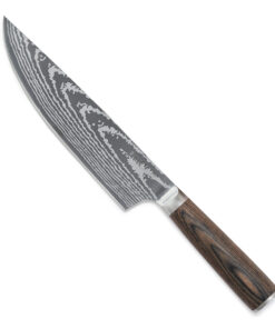 This chef’s knife has a premium stainless steel blade with a flowing Damascus design and a hand-finished wood and polymer handle to deliver standout looks and performance in any kitchen.