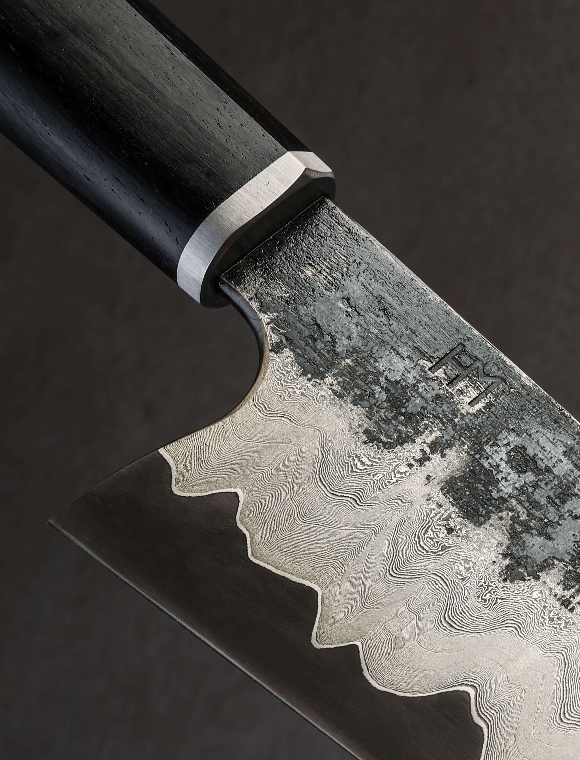 Jacketing a blade that means business are 312 layers of densely packed, undulating pure-nickel damascus steel, forge-finished along the flats, etched and hand-polished through the convex bevels. Handmade in northern Austria by bladesmith Martin Huber, this 240mm / 9.4″ gyuto has been built with any and every cut in mind. Nearly 4.5mm wide above the heel, the blade’s rounded spine tapers steadily to provide rigidity, toughness, and mass in the rear for the biggest chopping tasks, with progressively slimmer, wonderfully honed bevel geometry approaching the extra fine, needle-like tip. A balance point barely an inch in front of the 59mm-tall heel saves energy, allowing the knife’s mass to do its share of the work, and resulting in a steady, powerful feel in the hand, perfect for the working chef with hours of prep ahead. In a classic, elegant, and understated aesthetic, Martin fashions a handle from a beautiful piece of ancient bog oak in his shield-style wa profile, rounded along the bottom and faceted on the top and both sides for use by right and left-handed chefs using any grip. Contouring and attention to the details provide a comfortable, tactile experience that the artist has capped with a brushed stainless steel ferule. A one-of-a-kind, full-size chef’s knife to rule the kitchen.