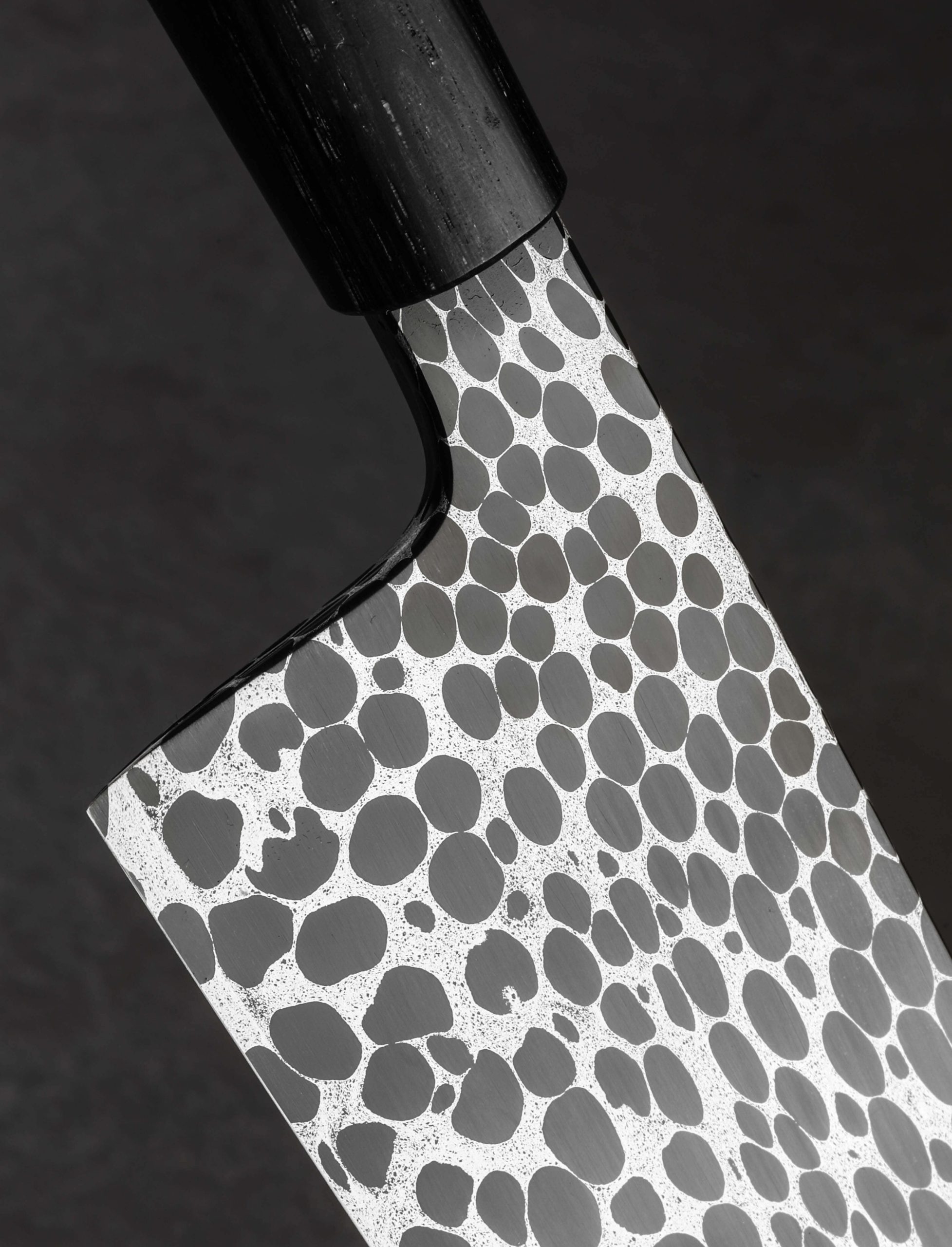 Artist Joseph Schrum translates the allure and undeniable beauty of ball-bearings damascus into a 179mm / 7″ chef knife shaped to conquer the kitchen in style. Dynamic and versatile, the blade has been meticulously shaped at Joseph’s studio outside of St. Louis for toughness and rigidity in the rear where the primary bevels, and their most pronounced convexity, start low, and slims downward to a thin, razor-sharp edge; moving forward, the width of the material both above the edge, and at the rounded spine, tapers steadily, until a glass-thin, needle-like tip is reached. With a touch of lateral flexibility in the final inches, the blade truly offers it all, from precision and finesse in the front, to strength and steadiness in the rear for the toughest chopping tasks. To help paint the picture, out of the handle, the blade tang is 5.5mm wide; above the choil it is 3.8mm, then 1.7mm at the midpoint, just under 1mm an inch from the tip, and approximately 0.6mm one centimeter from the tip. And throughout each of these points the incredible pattern of the canister damascus, forged by hand from a combination of 52100 high-carbon ball bearings and 4800kc powdered steel, is on full display thanks to Joseph’s deep, dark etch. A simple, comfortable grip meant to suit every hand and cutting style is sculpted from Ukrainian Bog Oak in an oval profile that tapers slightly from back to front.