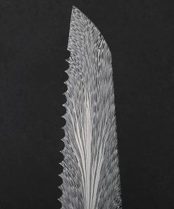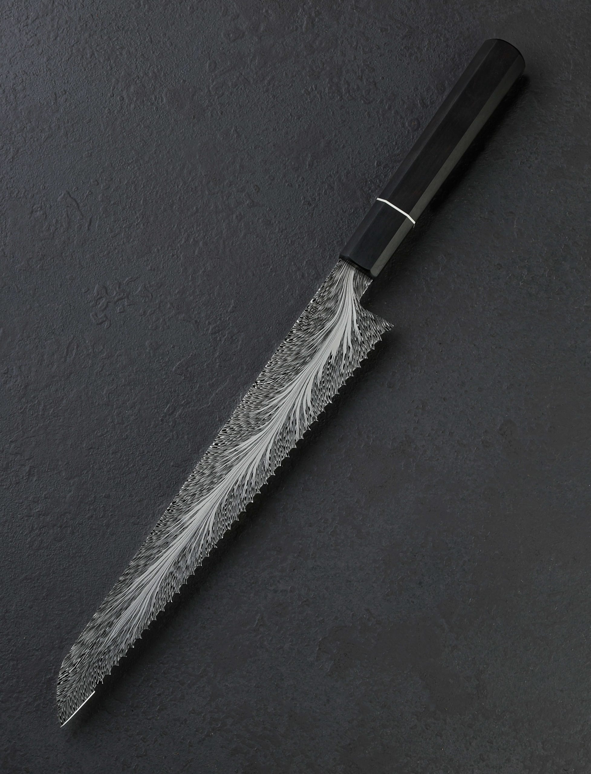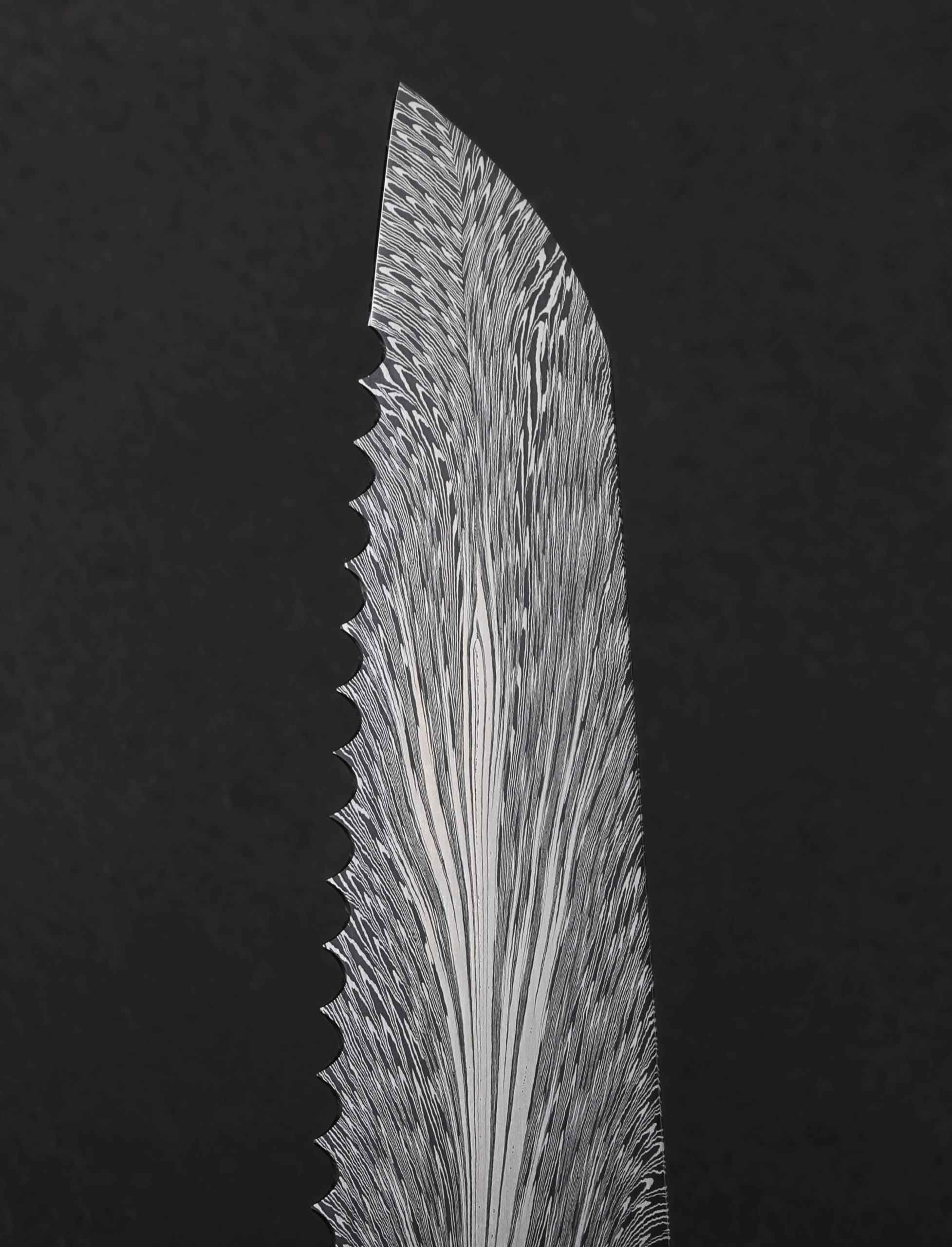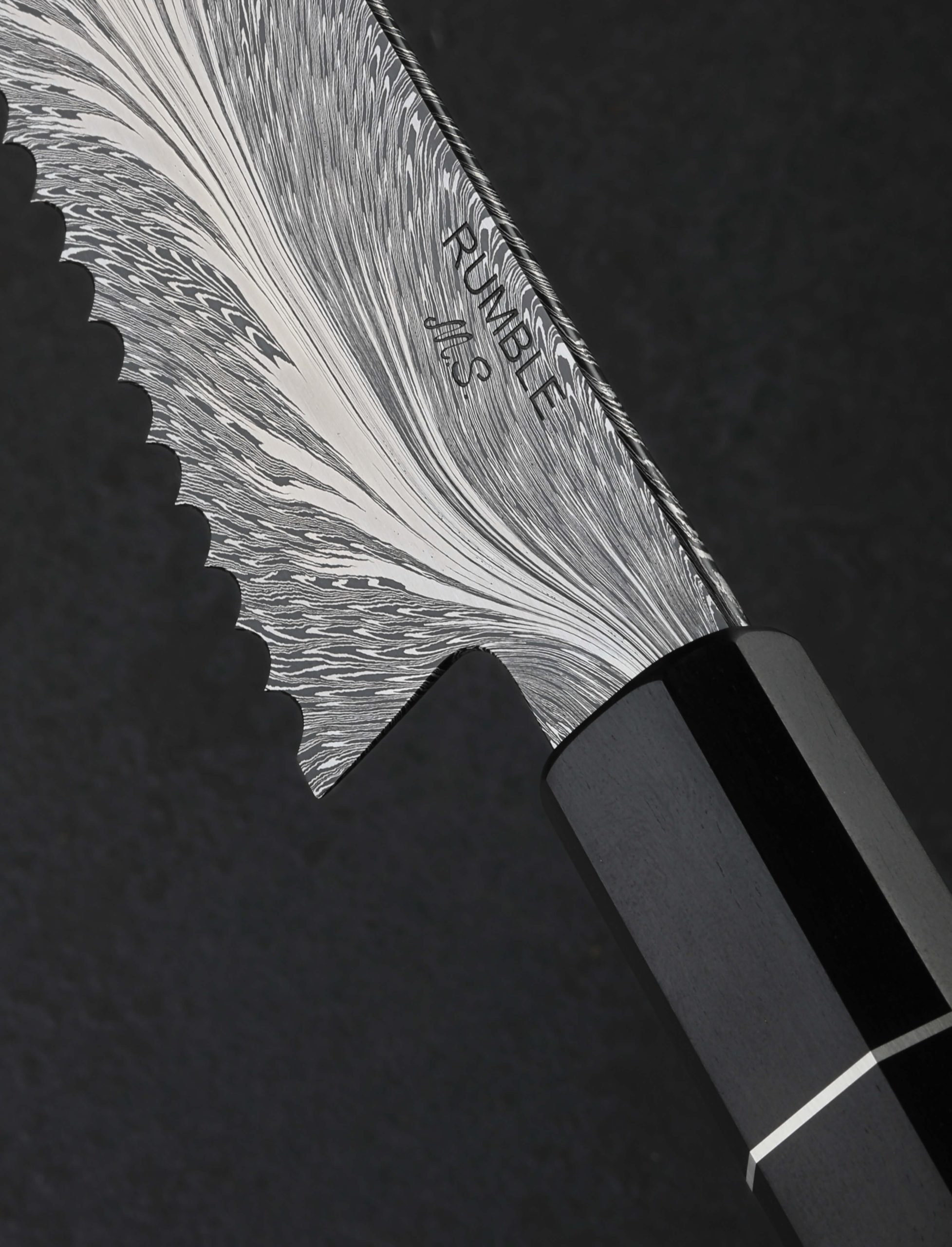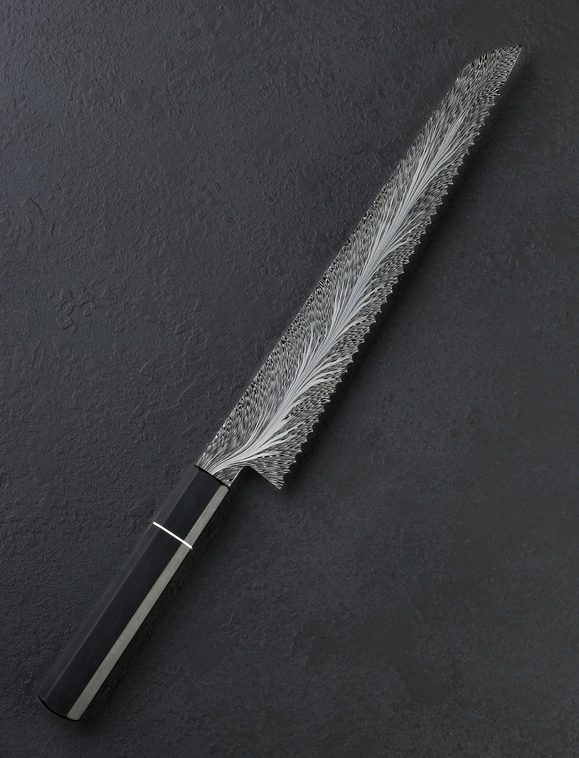 A more exquisite bread knife is not often witnessed. Australian damascus artist and ABS Master Bladesmith Jackson Rumble has forged a 267mm blade from his stunning interpretation of feather patterned steel to created a one-of-a-kind tool for the home and working kitchen alike. Razor-sharp serrations span the length of the thin, lightweight blade, sans the final inch nearing the tip in order to provide the versatility afforded by a short stretch of traditional, straight edge. For the baker’s cutting board, the pasty shop’s counter, or a home cook’s workspace with no shortage of uses for serrations, the remarkable, high-contrast metallic artwork that courses through this object in which nickel-rich carbon alloys retain a bright sheen atop a background of darkly etched tool steel, is both inspiring and invigorating. For comfort and control, whether slicing sourdough, quartering a baguette sandwich, or readying bagels for a schmear, Jackson finishes the build with a simple, elegant handle of ancient bog oak fitted with a polished, stainless steel ring, all sculpted into a classic, octagonal wa form.
