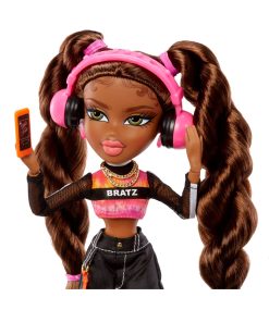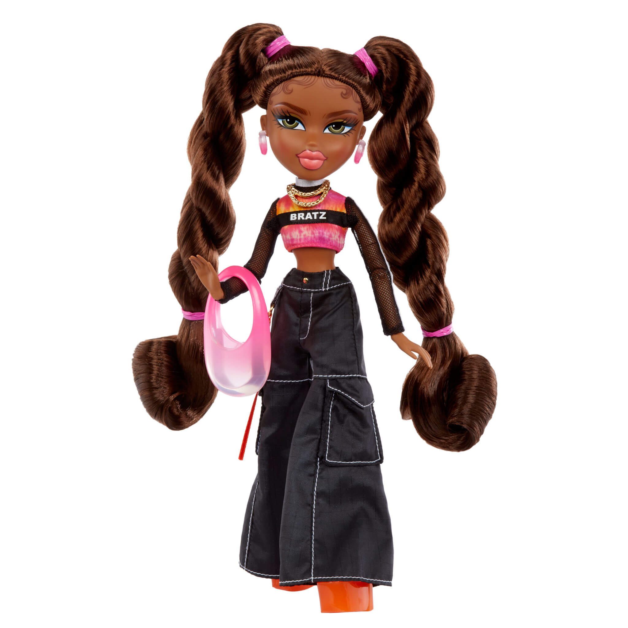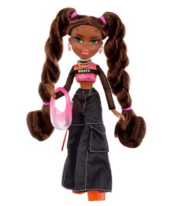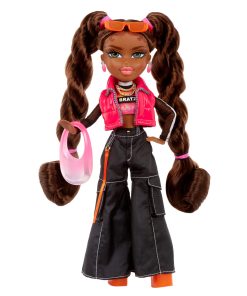Sasha wears a rad pink puffer vest over a long sleeve mesh Bratz top, wide leg cargo pants, and translucent orange heels. Sasha accessorizes with a rounded pink purse and matching earrings. She also comes with extra accessories like sunglasses, headphones, nail polish, a phone, necklace, water bottle, and hairbrush! Each doll also includes an exclusive poster and has 15 points of articulation to strike so many poses! Sasha’s fashion passion is streetwear with flair! Her friends call her “Bunny Boo” because old school hip hop is her thing. Sasha rocks 2 twisted ponytails with baby hair and a warm makeup look with pink lips.