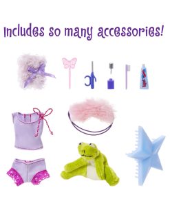 Whether it’s a girl’s night out or a girl’s night in, the Bratz do it in style! In this line, Bratz Slumber Party dolls prove that you can be comfy and look cool at the same time. Each doll includes 2 sets of pajamas/loungewear to mix and match for so many cozy options! Yasmin (aka Pretty Princess) wears Capri frog print bottoms with a lace trim babydoll tank, and her second outfit features a matching lavender top and bottom with lace and bow details. Yasmin’s long, curled hair features twisted pieces pulled back, as well as 2 highlighted tendrils that frame her face. She also has a gorgeous lavender makeup look. Express your passion for slumber party fashion with Yasmin and the rest of the Bratz Slumber Party dolls!