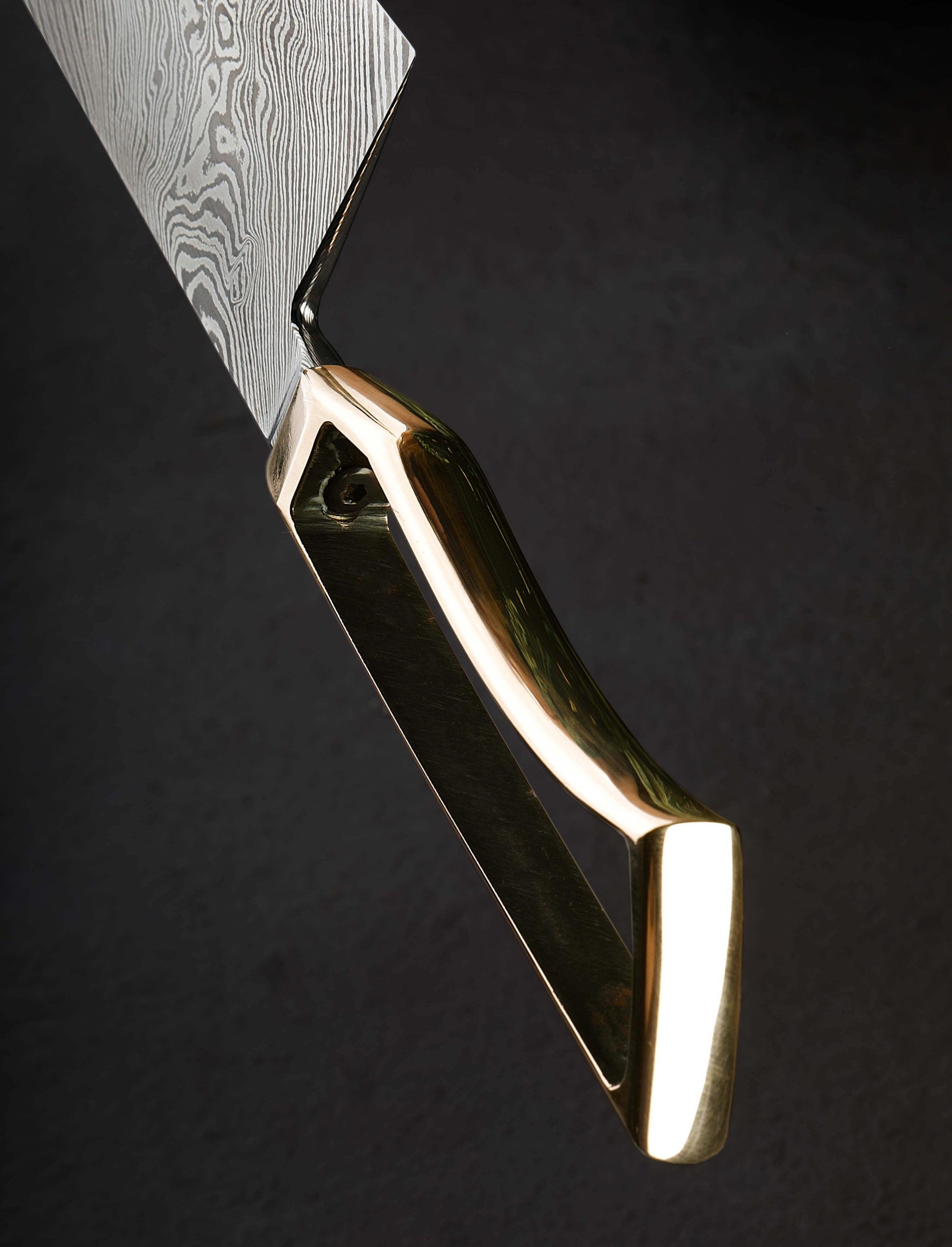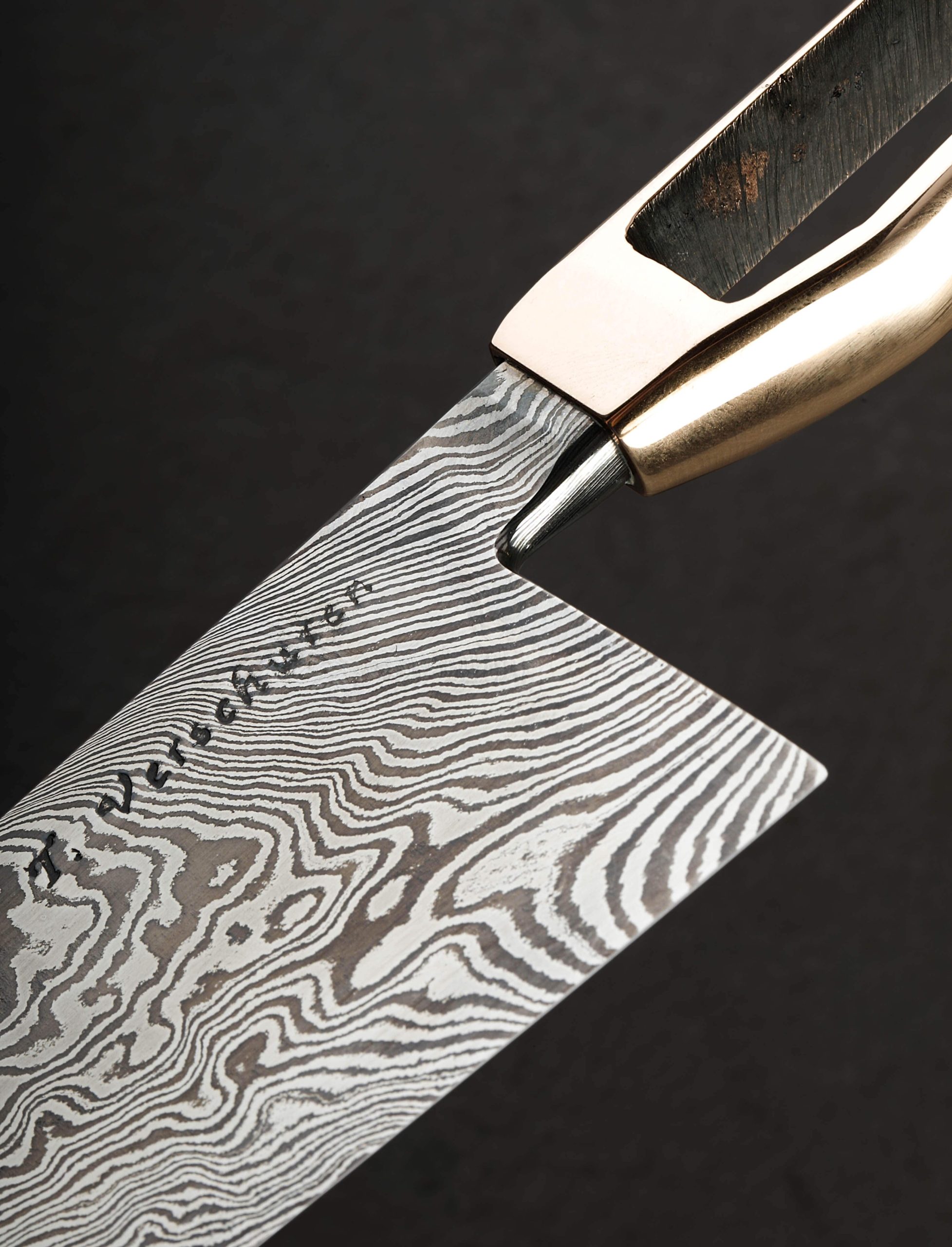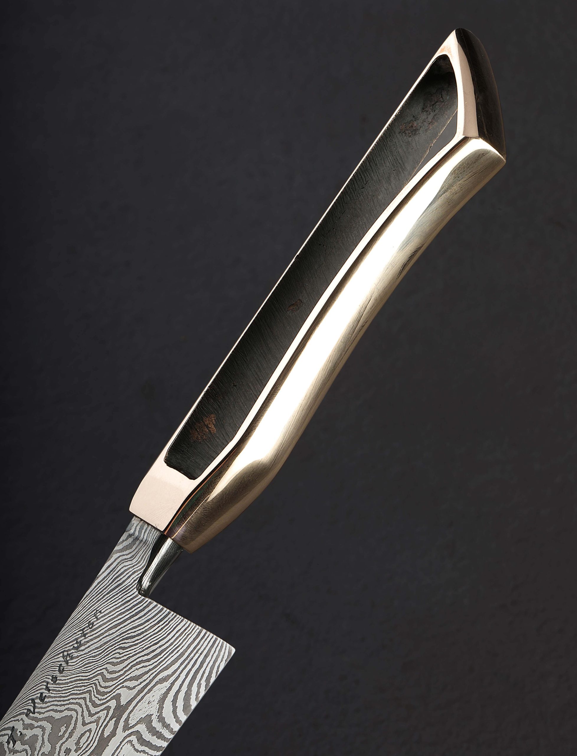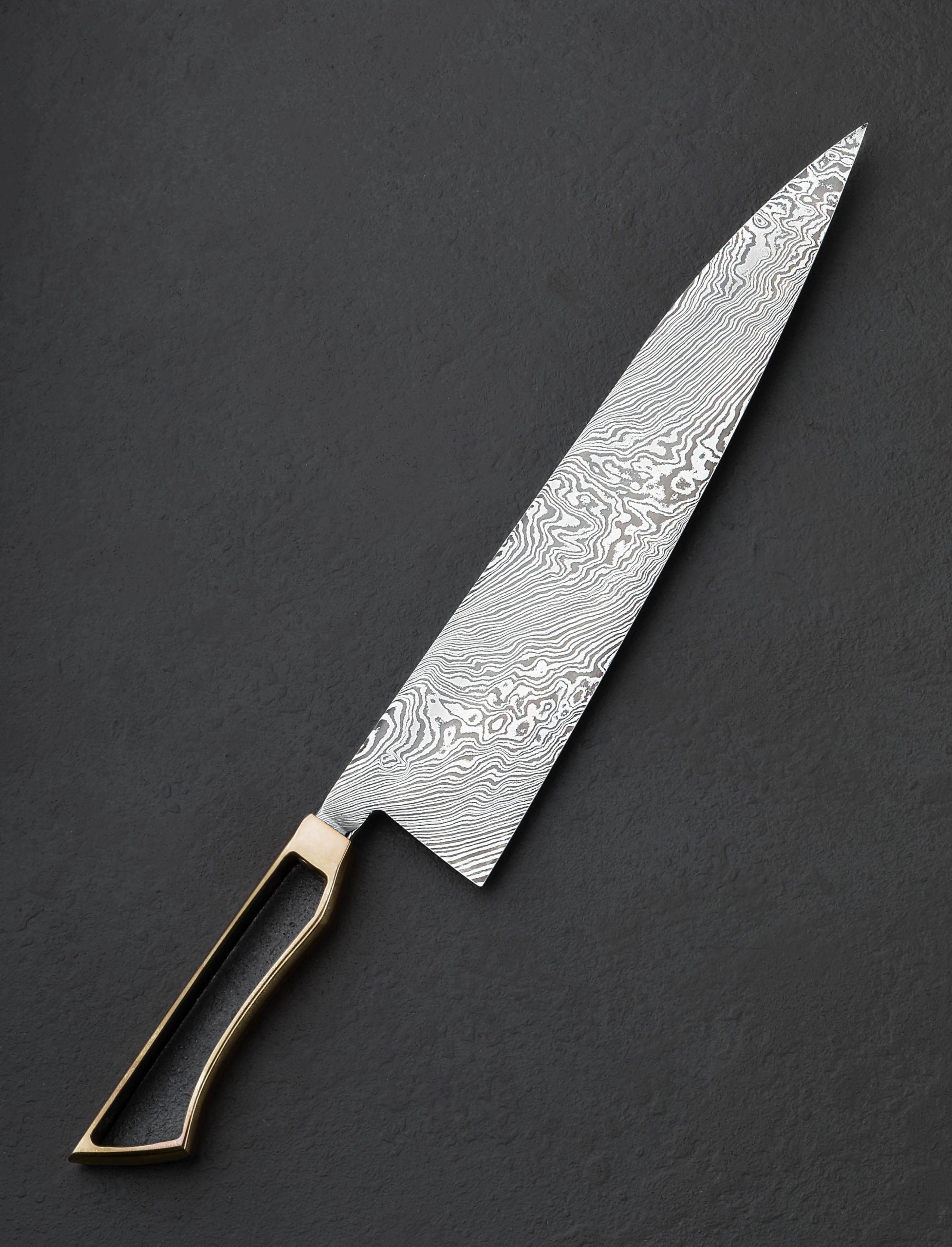 This first chef’s knife by our newest, and youngest bladesmith, Timo Verschuren of the Netherlands, bares the hallmarks of a culinary tool crafted by as talented, experienced, and thoughtful an artisan as we know. Designed and made by hand at his one-person studio, Timo creates a dynamic, high-performance object built for the demands of the hardworking kitchen, and styled with a simple elegance that sets it apart from the crowd. Forged from a house-made carbon damascus steel of his formulation, the blade features outstanding convex bevel geometry which slims downward to a thin, razor-sharp edge. From a wide, stiff, 4.1mm above the heel, the blade’s rounded spine enjoys a superb full-distal taper that slims to 2.1mm at the center to bare 0.7mm an inch from the tip, further adding to the knife’s capabilities around the kitchen; its tough, sturdy geometry toward the rear is perfect for chopping tasks and the densest foods, while the forward inches are especially slim from spine to edge, resulting also in a nicely balanced degree of lateral flexibility in the final third of the blade’s length. The entire knife’s center of mass lies less than half an inch in front of the edge’s heel. At the tip, the twisted damascus steel is glass thin, ideal for detail work and precision slicing. Complementing the comfort of the blade’s polished, rounded spine and heel, which the fingers hug in the pinch grip, is a handle as unique and handsome as it is a pleasure to hold. Sculpted from solid bronze, the hollow, one-piece construction is the icing on a cake that already tips the scales in favor of accolades and applause, shaped and finished with the utmost attention to detail.