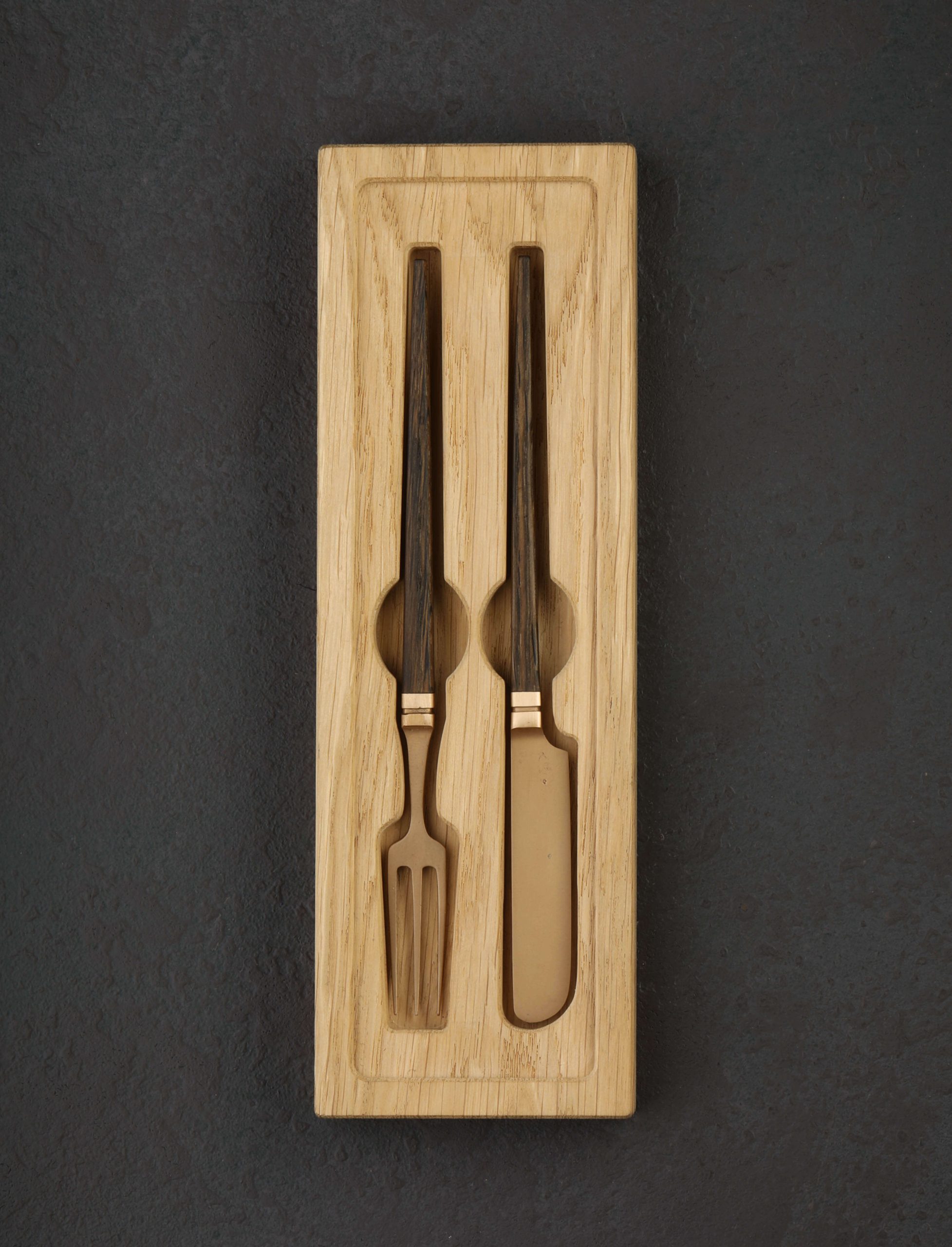 A long time coming, this fork and knife cutlery set by talented Austrian designer and artist David Wolke set our hearts aflutter when it first crossed our path, and we have been patiently waiting to showcase it here ever since. The elegant forms of each utensil are realized in recycled, cast bronze and ancient, Austrian Bog Oak. Slim, tapering handles of the beautiful, locally-sourced natural material offer the fingers a delicate, tactile experience, the heavier bronze heads pulling the hand and eyes forward toward the foods with which they will interact. For serving, for special occasions, and for an elevated dining experience, David’s work surprises and delights. Created one at a time by hand at his northern Austria studio, the marks of their handmade stature tell the story of each piece’s origins, designed and made with love, for those who love and dine.