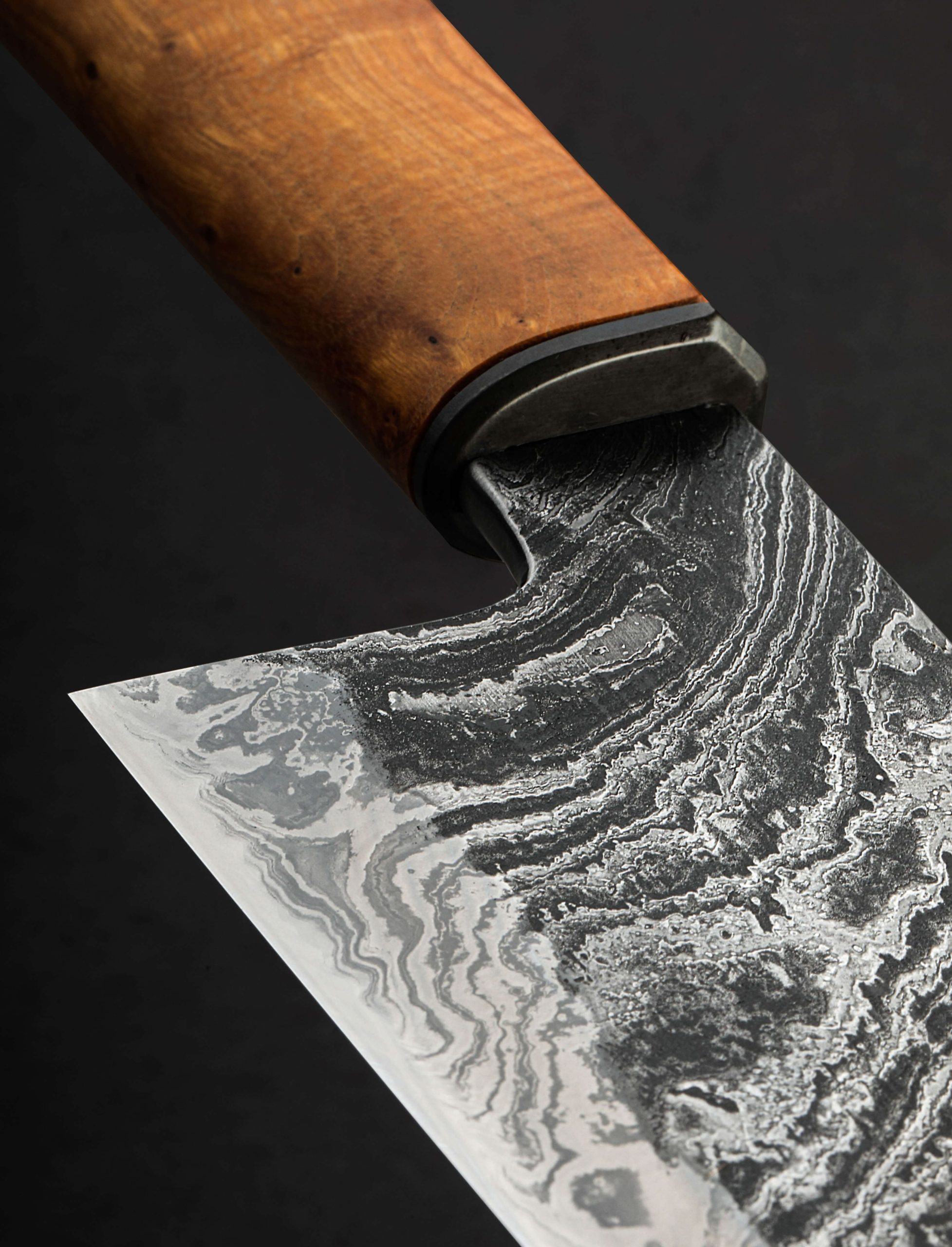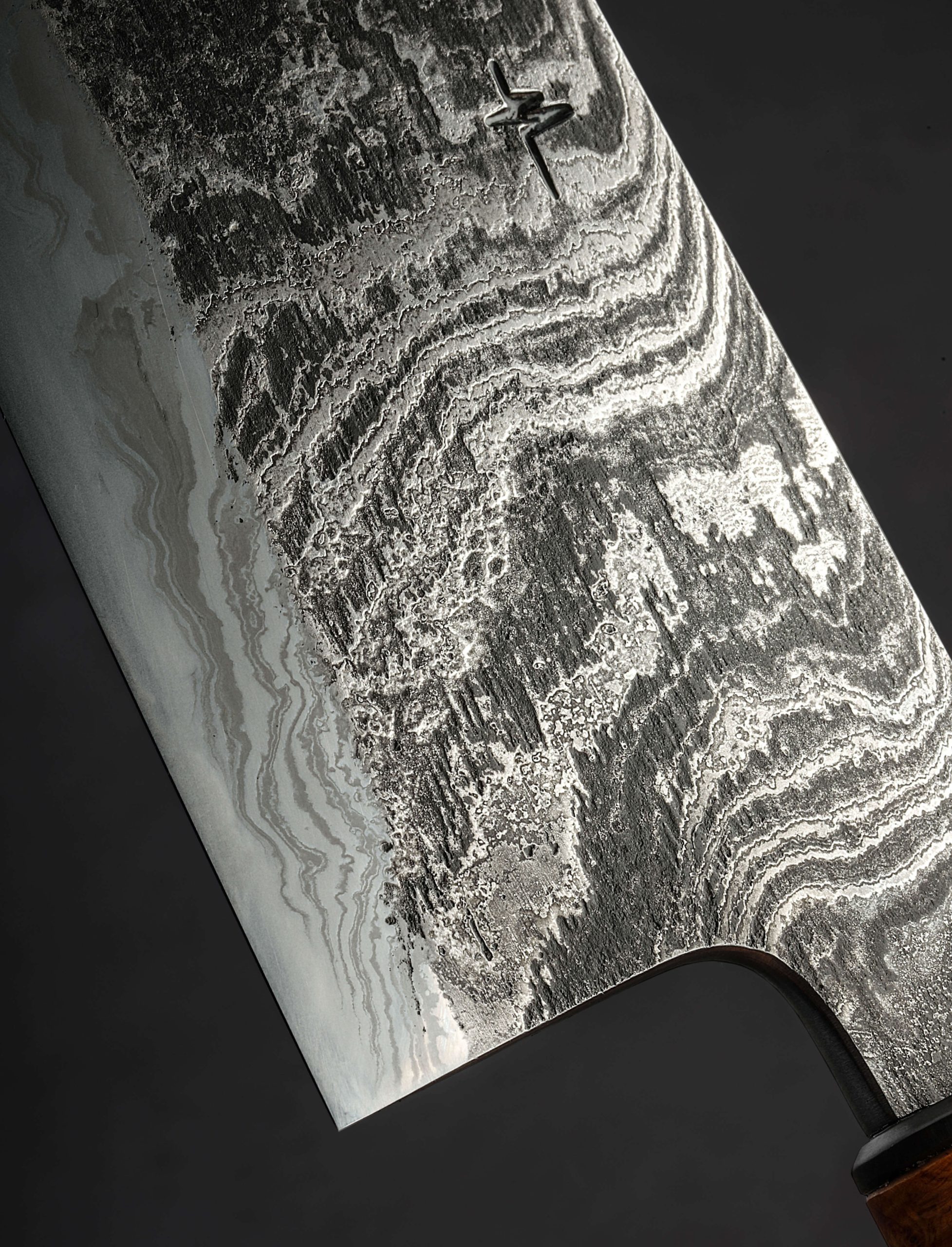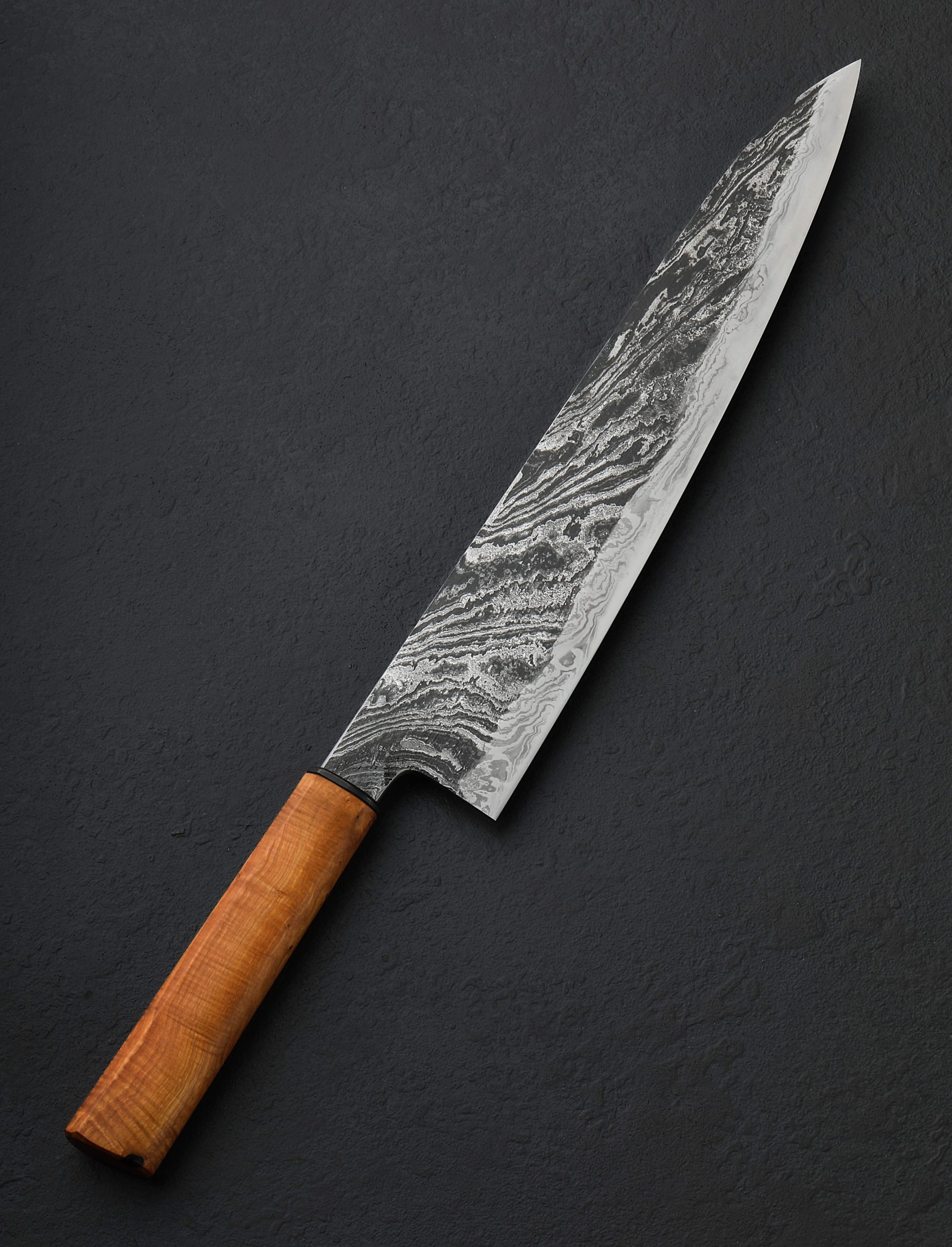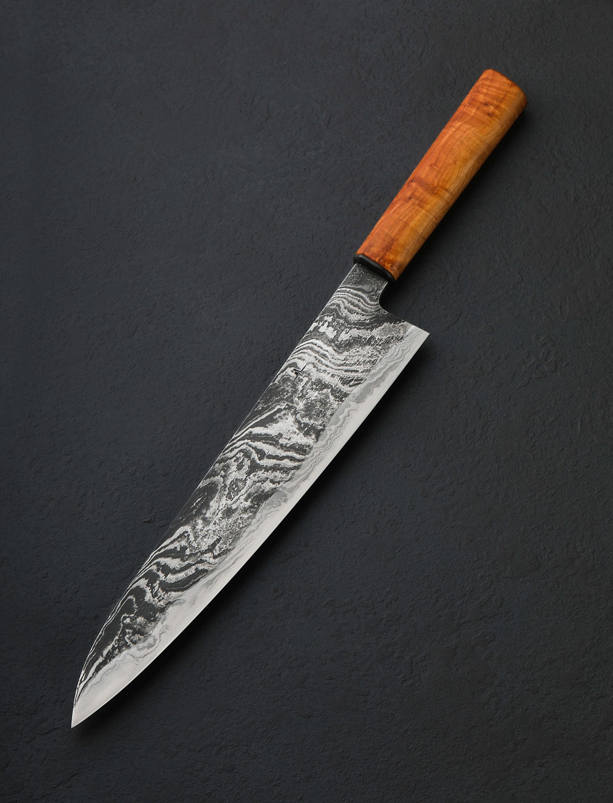 The challenge of creating a top-performing gyuto drives Milan Gravier to produce his best work like few things can: balance, profile, taper, geometry that evolves through the length of the blade, and that feel in the hand present when only all elements align, come together to form a culinary tool that is so much more than the sum of its parts. For his first offering in our collection, an extraordinary chef’s knife rises, forged by hand at Milan’s studio in southern France from homemade, damascus-clad 135Cr3 carbon steel. The twisted damascus cladding has been stretched through power and fire and coated selectively with iron oxide to produce a dynamic, kurouchi finish through which the viewer may experience the beauty of each material as though viewing it with different lenses at different points throughout the blade. Thin at the edge and convex above, balancing finesse and strength superbly, the bevels are both shaped and polished using some of the finest Japanese natural stones from the Nakayama mine. As the blade is forged to shape by hand, the shinogi, or line separating bevels from flats, is by design not perfectly straight, Milan instead prioritizing the shape of the bevels themselves, ensuring an evenness that allows the stones to fully contact every portion of the surface. Extrapolating time into the future, this also means that as the edge is sharpened, the same geometry will remain at every point. At 276mm / 10.9″ long with a 55mm tall heel, rounded, polished spine and choil, and full-distal taper to a fine, needle-like tip, there is nothing this cutting tool cannot accomplish. A special handle has been crafted with which to wield this special object; found and dried locally, Milan has selected a rare, local, and dense wood, carved into an elegant, shield-style wa handle: buckthorn, with its stunning reds, oranges, and grain. A contoured, darkened stainless steel ferule completes the build.