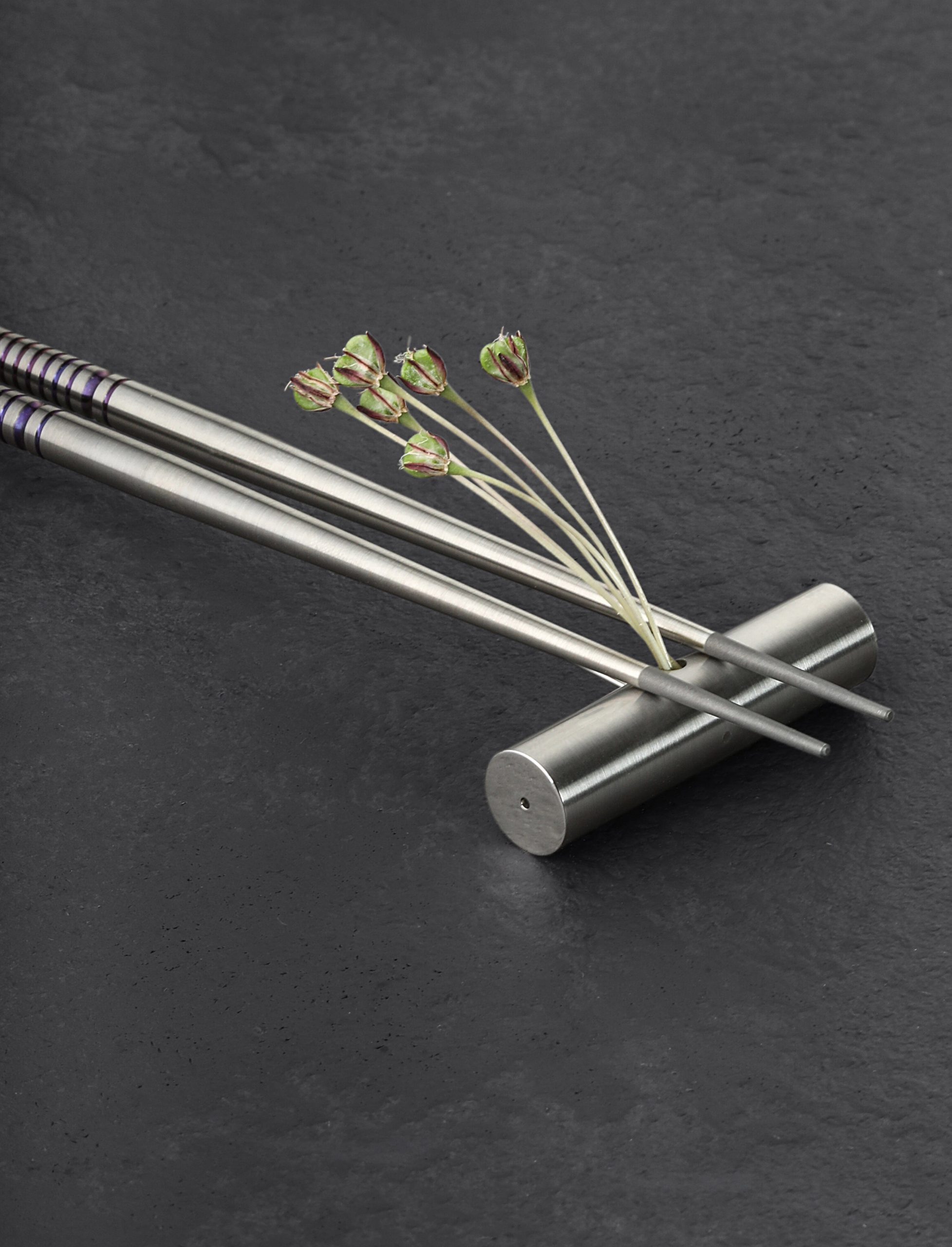 Designed by Martin Kastner of Crucial Detail, a form of balance and precision that doubles as both a bud vase and chopstick rest. On the dining table or the kitchen windowsill, an elegant, beautifully weighted solid steel accessory to adorn the home. Created in Spain. *Chopsticks not included.