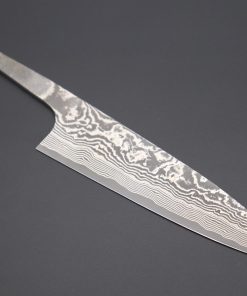 The HAP-40 core blade steel (HRc. 68) is forge-welded with Stainless Damascus steel cladding, which is made with alternating layers of Nickel Steel and Stainless Steel. The blade is beautifully mirror polished and finished so that the white color of Nickel Steel layers vividly contrast with the glossy silver color of the Stainless Steel layers.