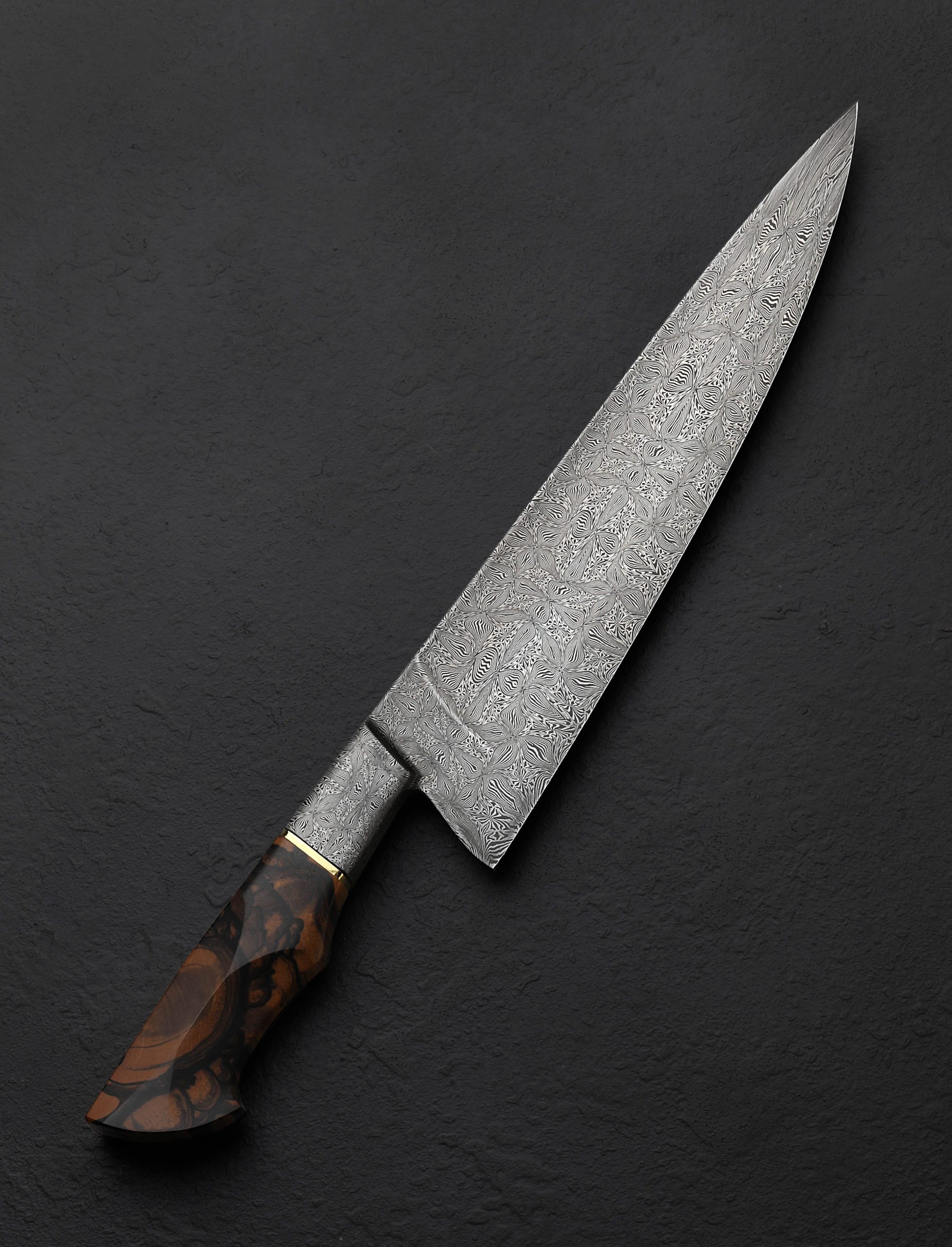 Just in is the latest extraordinary Salem Straub chef knife, for which we have but one photo for now, forged from yet another stunning mosaic damascus pattern of Salem’s creation. Sporting his superb compound ‘S-grind’ bevel geometry, with a long, slim, 260mm profile, head-turning pinwheels of 1084 & 15n20 alloys, a razor-sharp edge, and full-distal taper to a fine tip for detail work, Salem nails the big picture, and every detail. Forged integral bolsters showing each nuance of the steel’s many intricate layers begin a beautifully shaped handle, a ring of heirloom-fit bronze transitioning the fingers to a sculpted piece of striking black & white ebony. The retention bolt of the handle’s mechanical construction is visible via a polished, flush steel cap at the handle’s butt.
