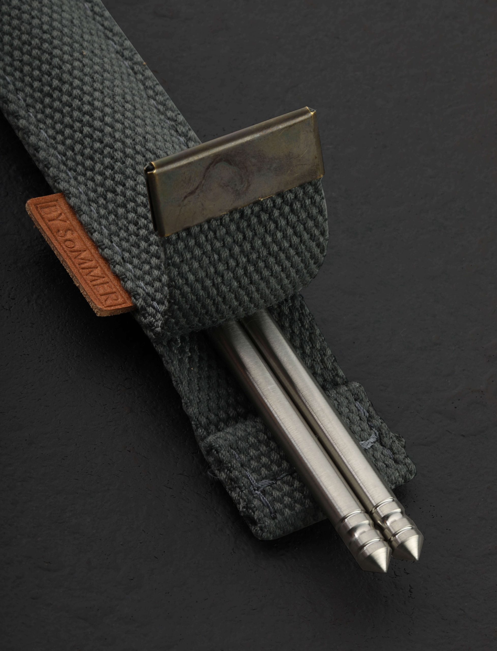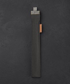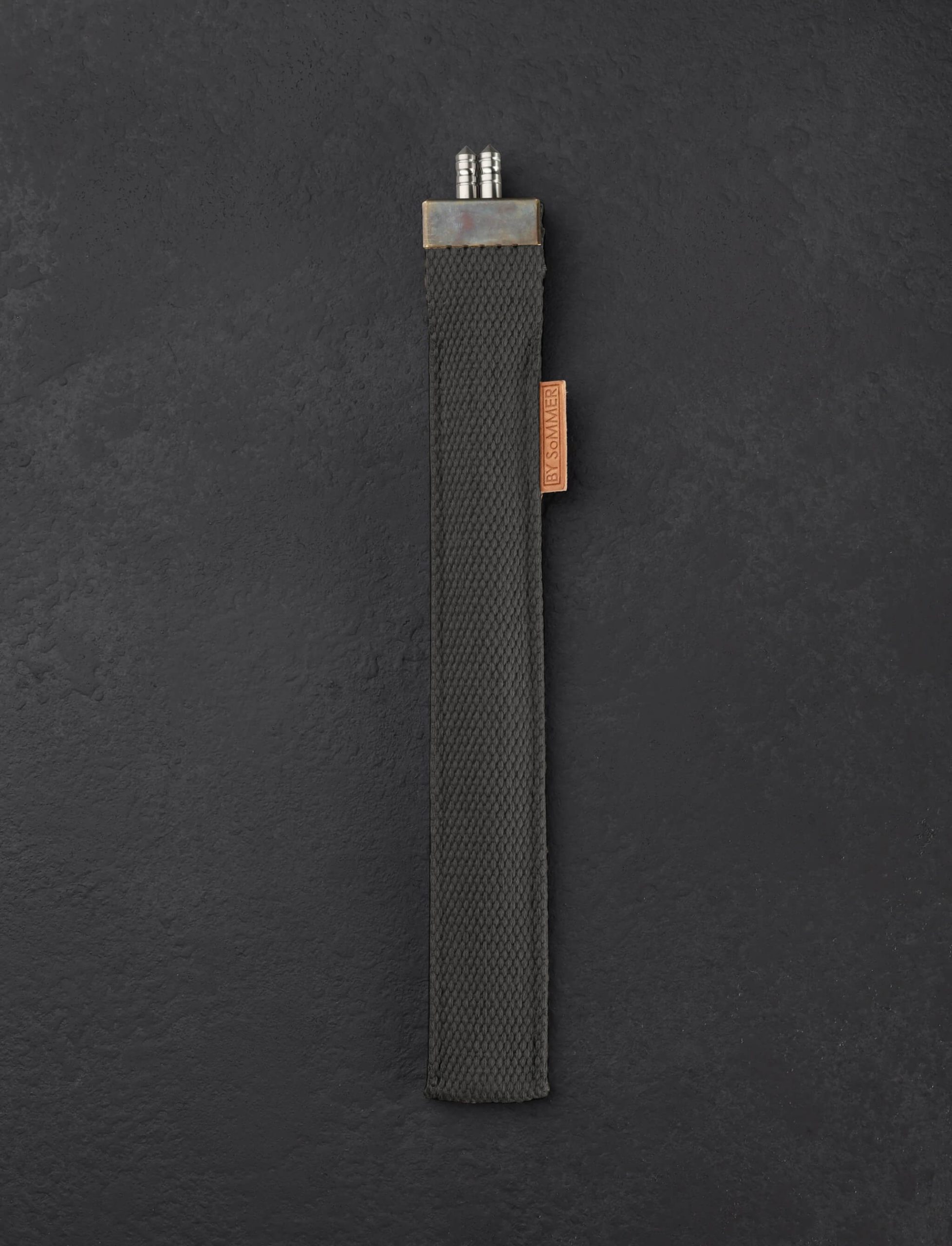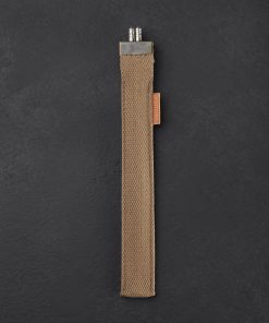 Designed and made by hand in Denmark by Birgitte Sommer especially for our TiStix Titanium Chopsticks, these canvas chopsticks cases are made from reclaimed military straps and topped with a metal cap complete with two eyelets. A simple and elegant leather tab indicating the cases are handcrafted “BY SoMMER” adorns the side of each. Our TiStix chopsticks are 9.375″ long and made from 0.25″ solid titanium and these cases will accept other chopsticks of the same dimensions. *Chopsticks not included.