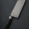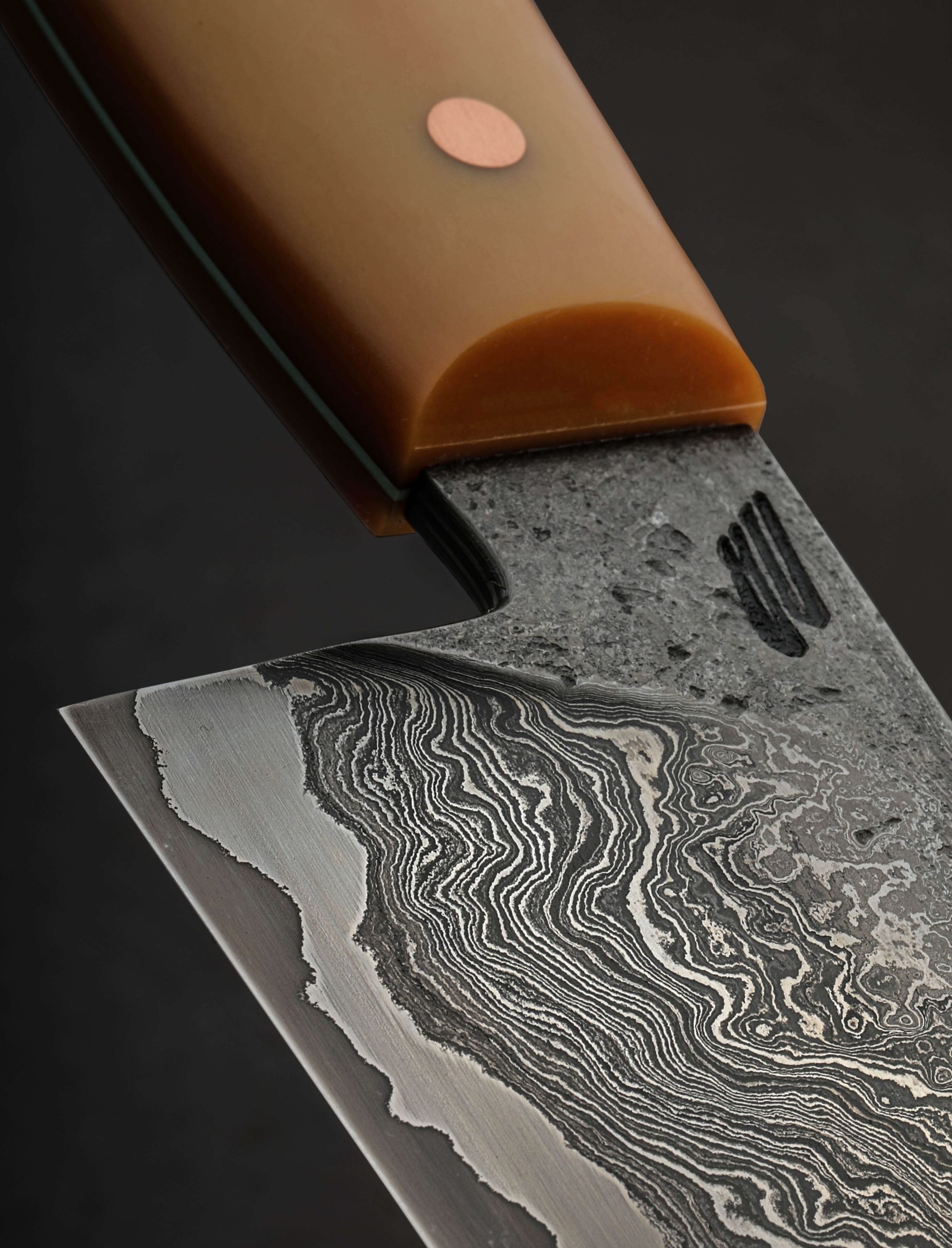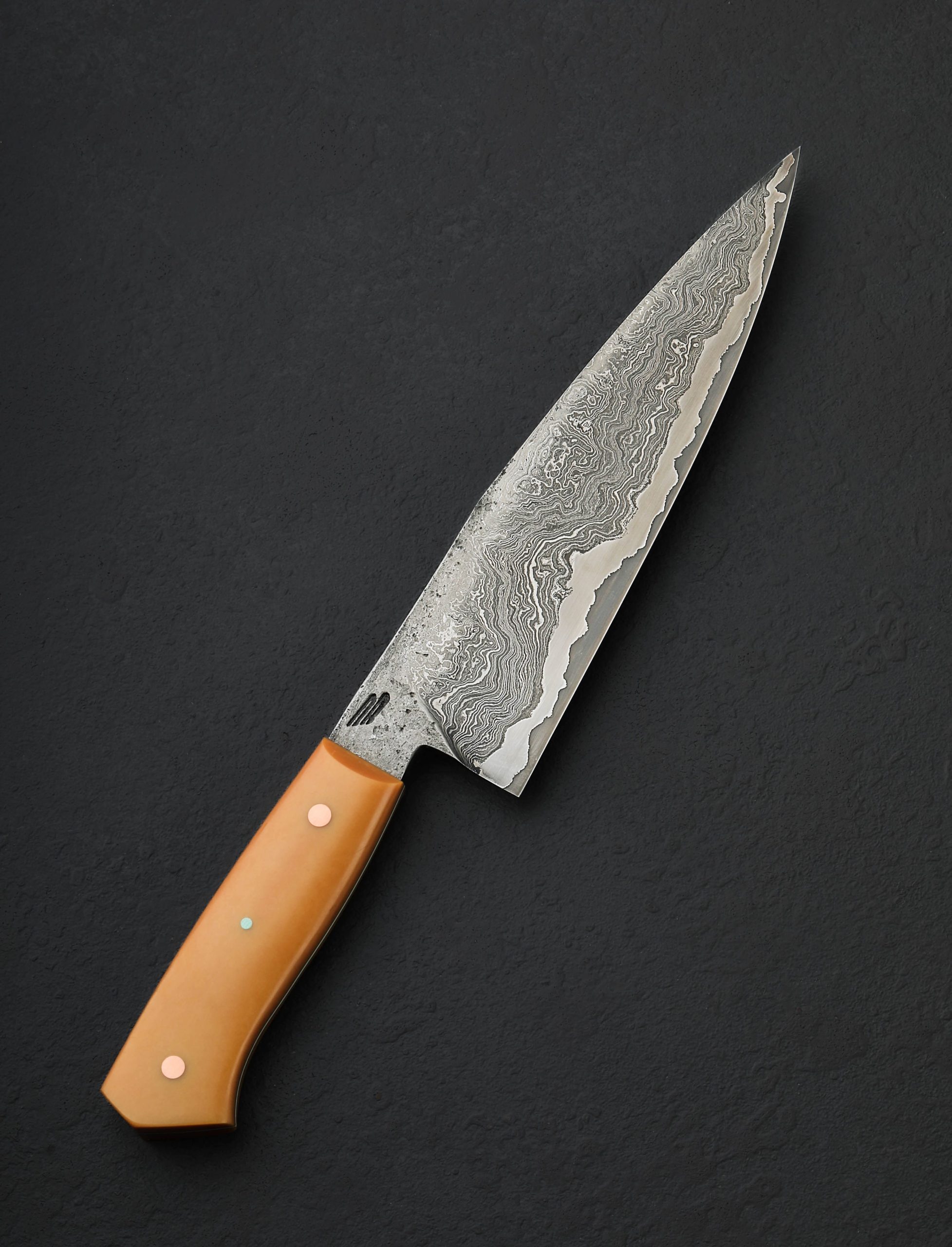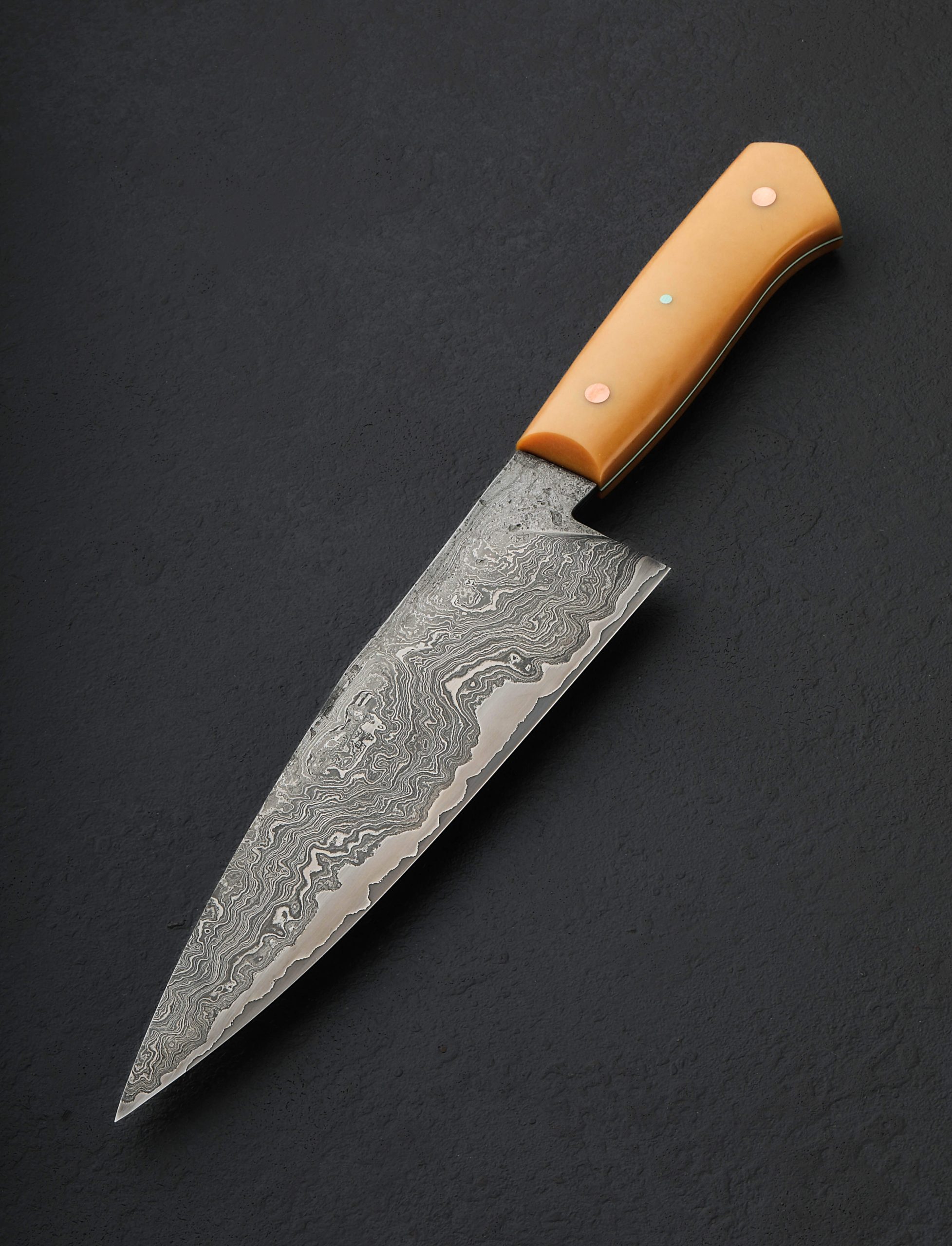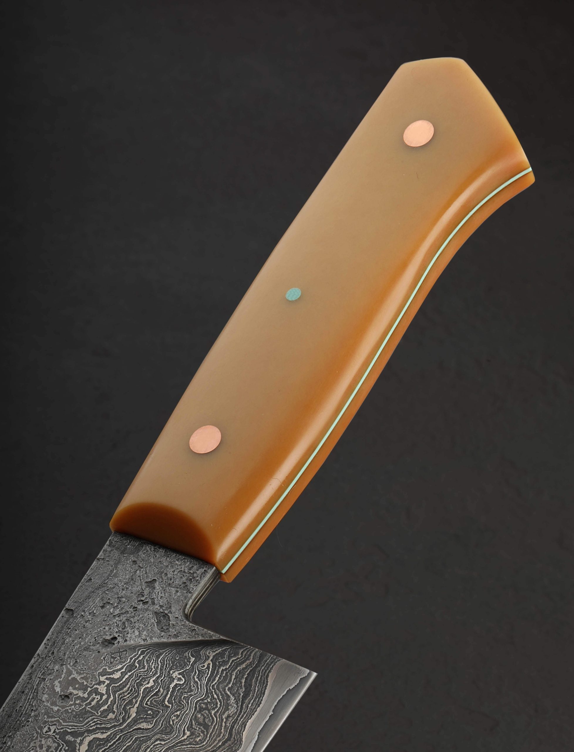 A workhorse cutting tool for the kitchen by Nick Rossi with unabashed style reminiscent to that of a mid-century sculptural work. Exceptional in every way, provided you appreciate the aesthetic combination of vintage caramel Bakelite, teal G10, and copper as much as we do, this versatile chef knife was forged by hand at Nick’s Maine workshop. The 204mm / 8″ blade is shaped from a homemade formula that jackets 600-layer damascus in Maine chain wrought iron, 1084, and 15n20 over a core of 52100 carbon tool steel that forms the cutting edge. Powerful and balanced in the hand, the blade’s full convex bevel geometry, thin, razor-sharp edge, and full-distal taper along the spine to a very slim, pointed tip combine to create a tool designed for every cut in the kitchen. A wide, strong blade spine out of the handle and 54mm heel height allow the knife to move through even the densest, toughest ingredients in the back stretch, while dynamic, wonderfully honed geometry as the blade thins toward the tip allows for finesse and precision with every slice. Forge-finished blade flats and tang reveal the marks of the steel’s hand-hammered origins, while the bevels’ polished and etched faces show off the details of the stunning, high-layer damascus cladding. To control this one-of-a-kind piece of culinary art is a comfortable Western style handle sculpted from vintage Bakelite around a thin teal G10 frame, secured by two flush, brushed copper pins and a single teal G10 pin. An heirloom tool to use and covet, by an extremely talented artisan.